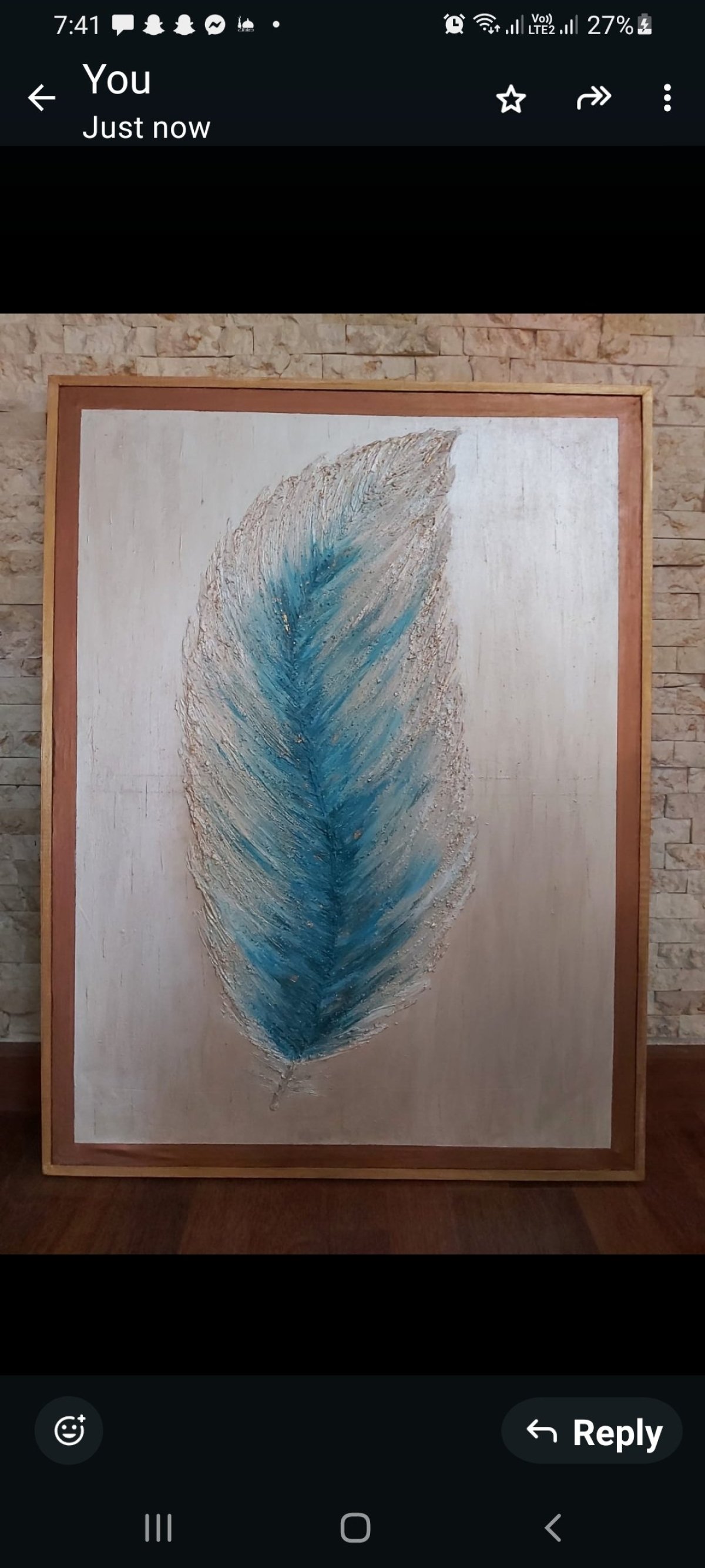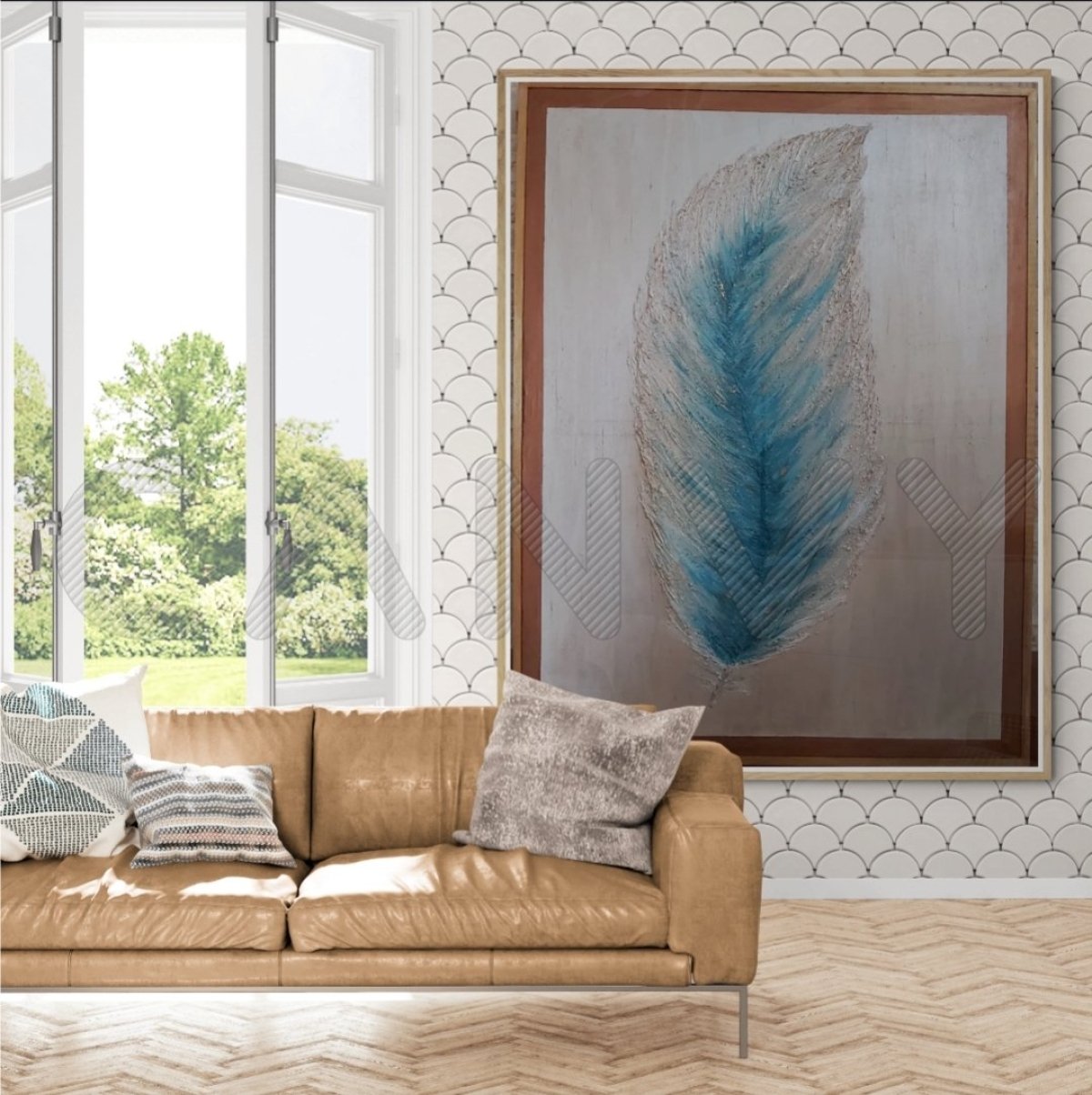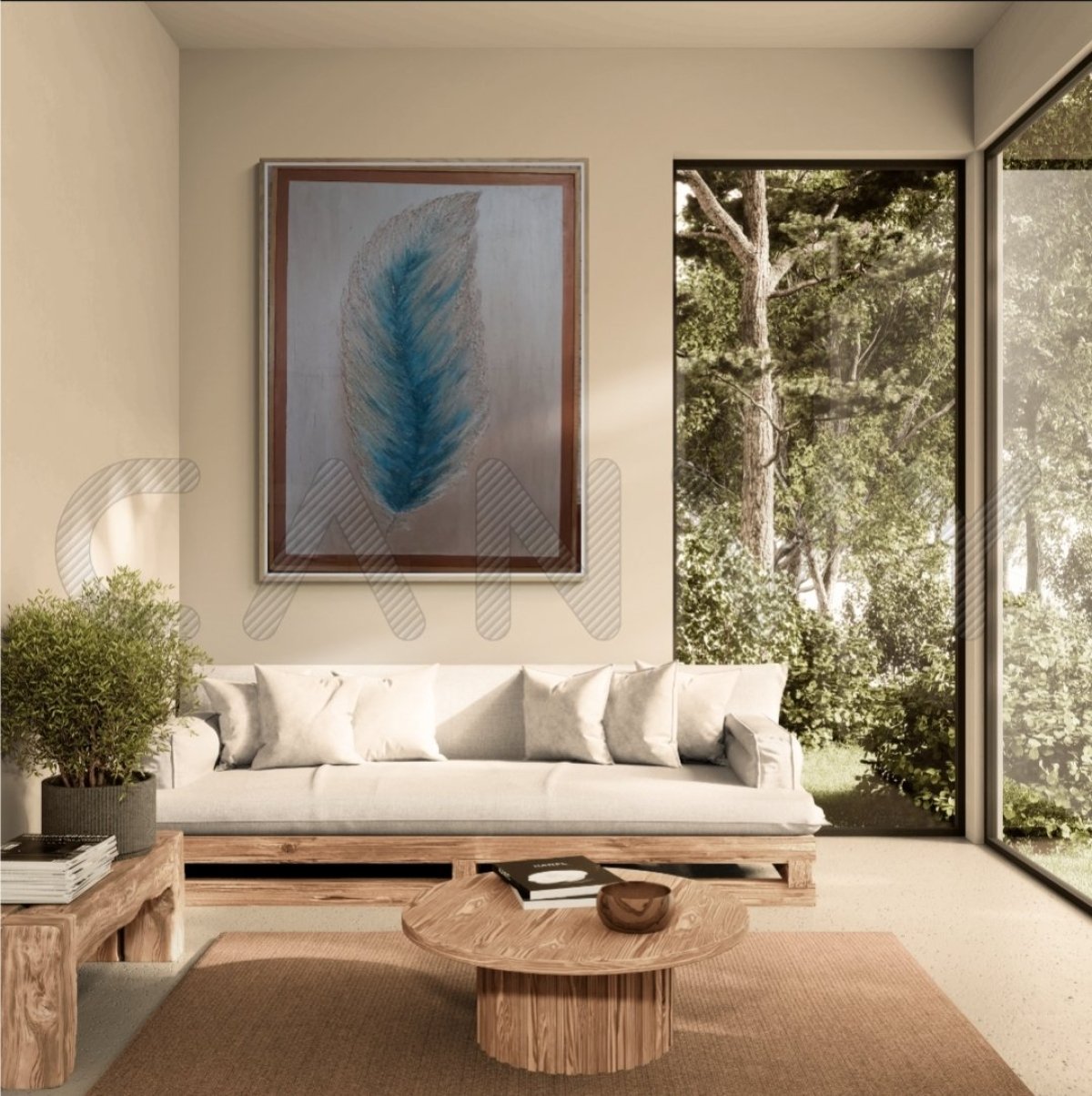 *العنوان: ريشة أنيقة* لوحة تجسد ريشة زرقاء كبيرة بتفاصيل دقيقة وظلال بيضاء وبيج. الريشة بارزة بوضوح على خلفية بلون فاتح، مما يضيف لمسة من الجمال الطبيعي والهدوء.