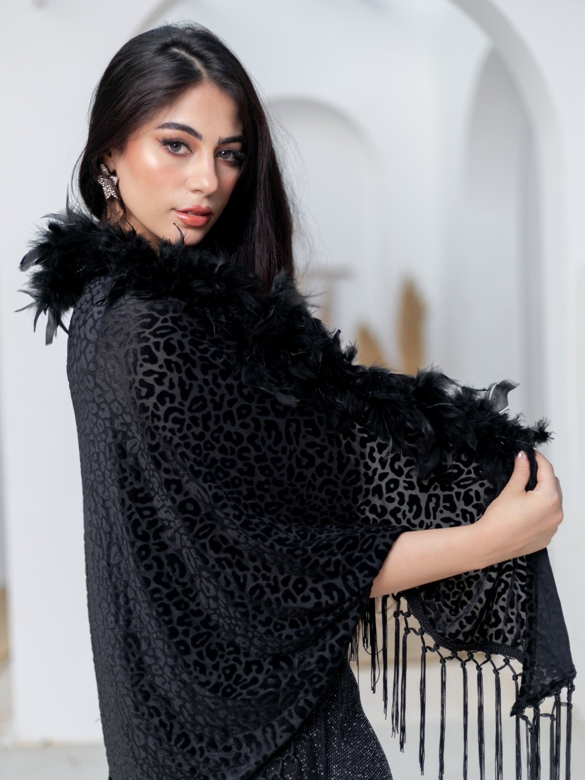 شال جاكار بفرنشة حرير وريش طول كلي 150 سم