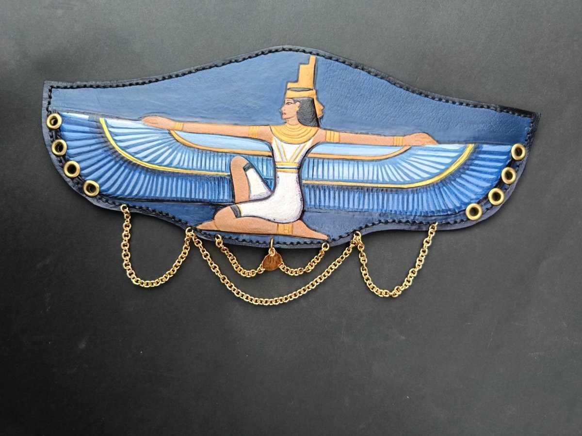 حزام حريمي جلد طبيعي هاند ميد بالكامل رسم ونحت وتلوين مستوحاه من التراث المصري القديم باللون الازرق معه شريط ستان للربط