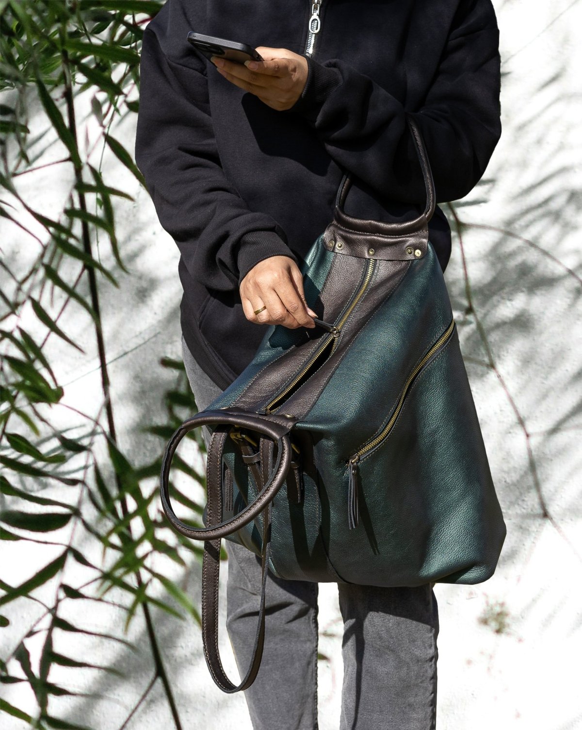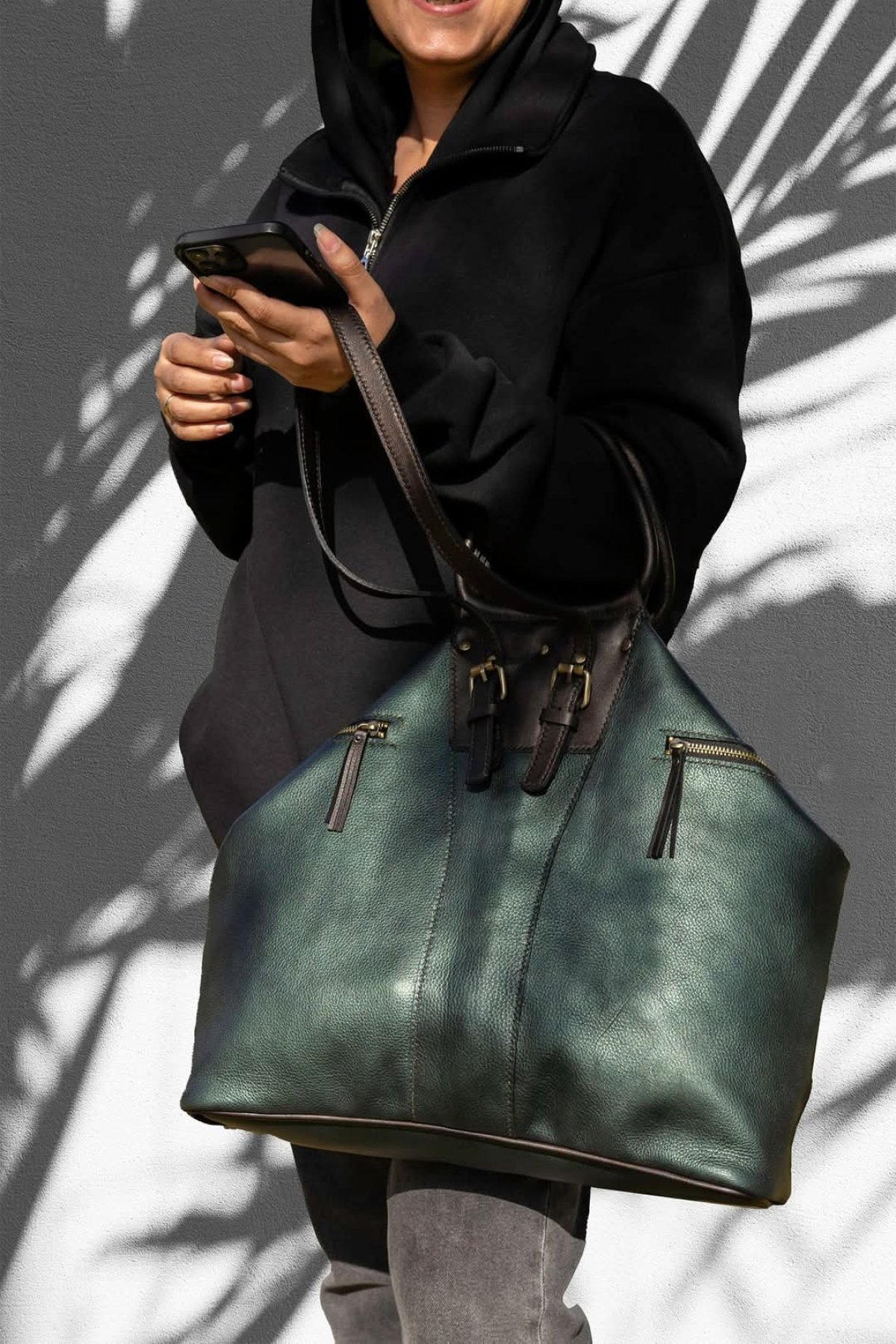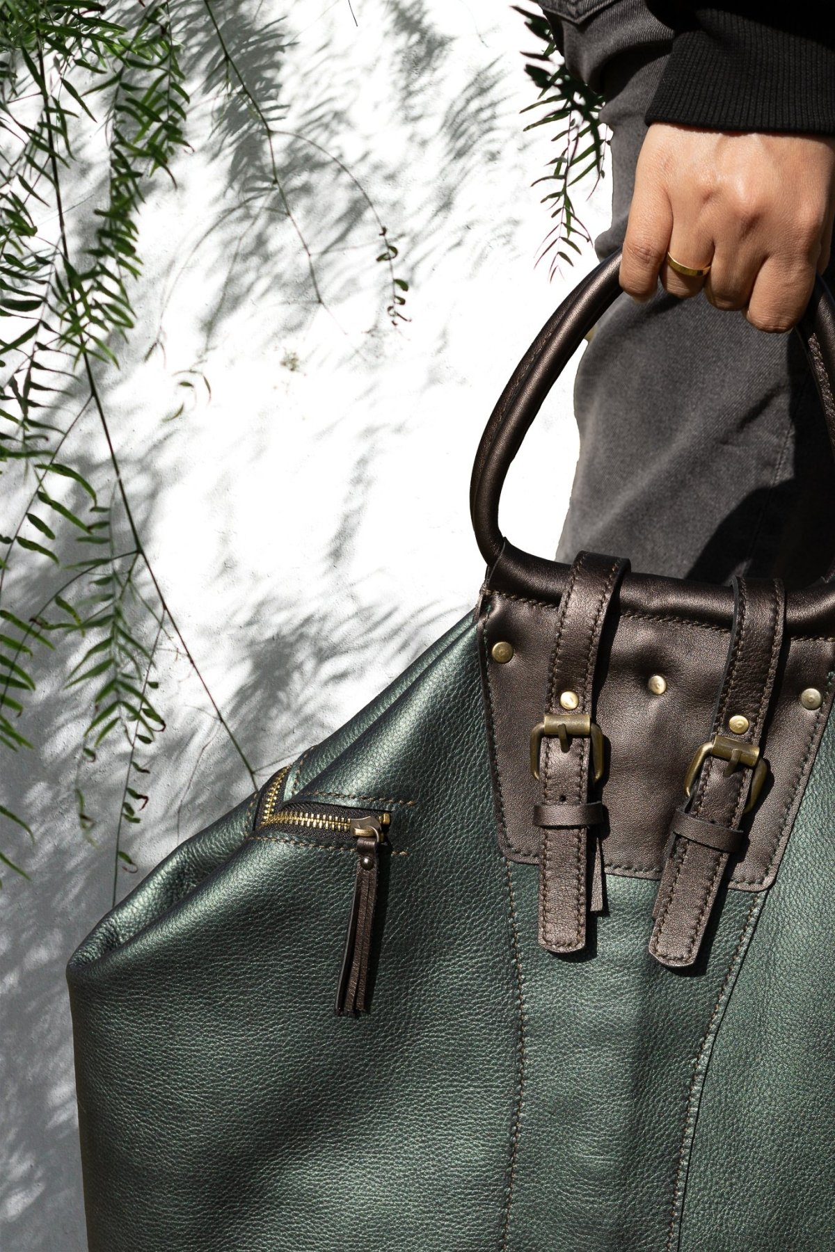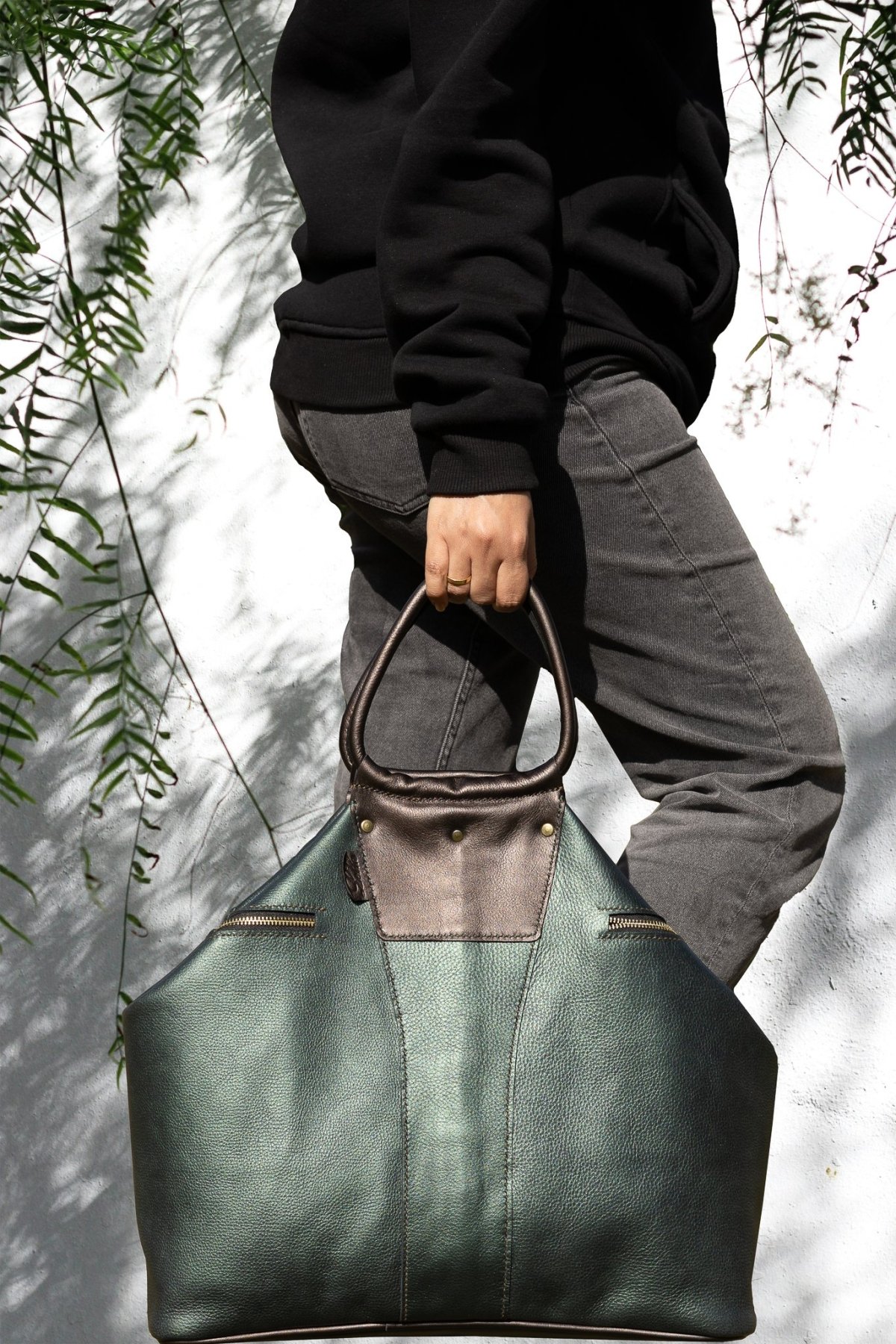 حقيبة كتف نسائيه مصنوعه يدويا من الجلد الطبيعي البقري الميتاليك. لها يد قصيره ويد أخرى طويله. تحتوي على سوستتين خارجيتين. سوسته أخرى لفتح الشنطه. عرضها ٥٠سم وارتفاعها ٤٠سم