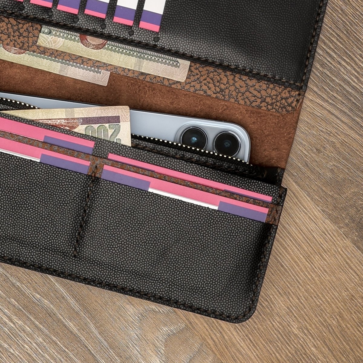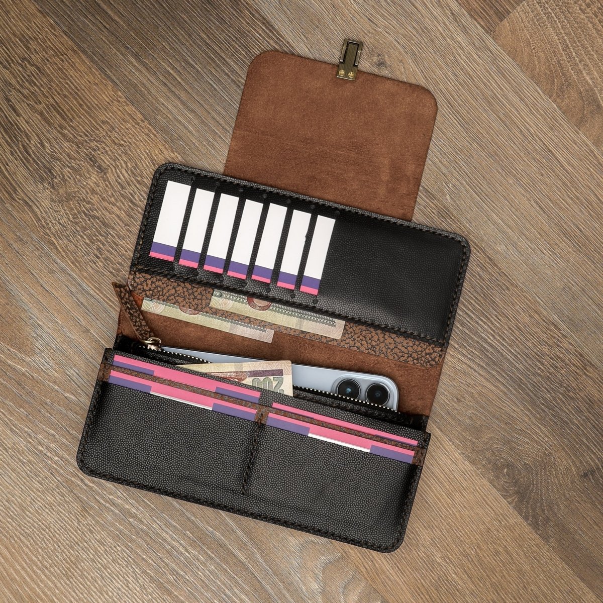 محفظه حريمي طويله مصنوعه يدويا بالكامل من الجلد الطبيعي جلد البقر. عرضها ١١سم.وطولها ٢٠سم. تحتوي على العديد من الجيوب للكروت والعملات الورقيه والمعدنيه والهاتف المحمول وبها جيب بسوسته