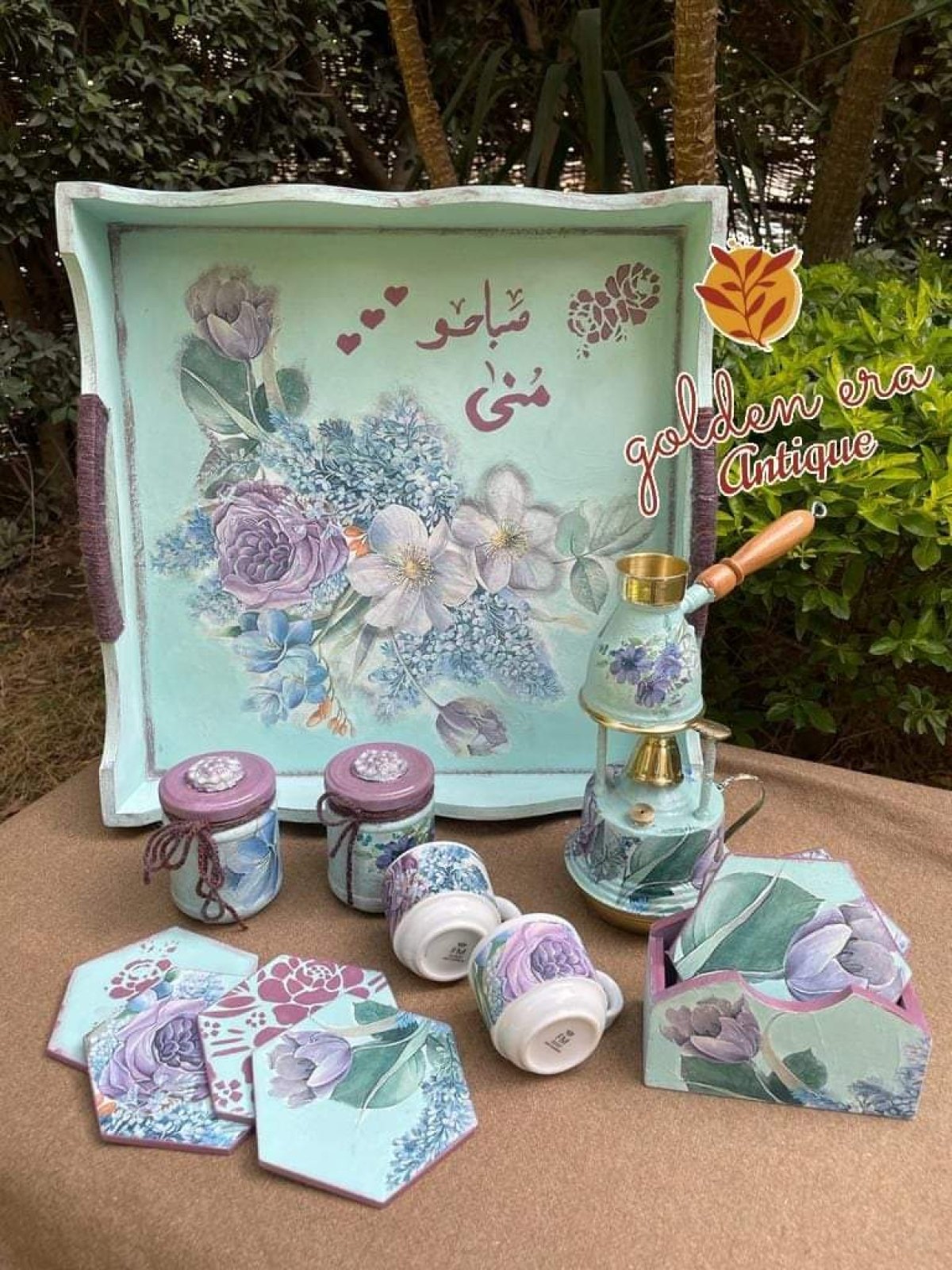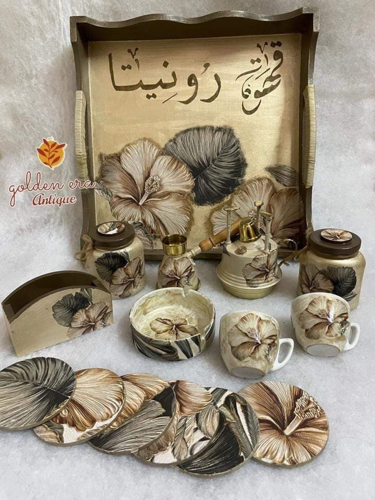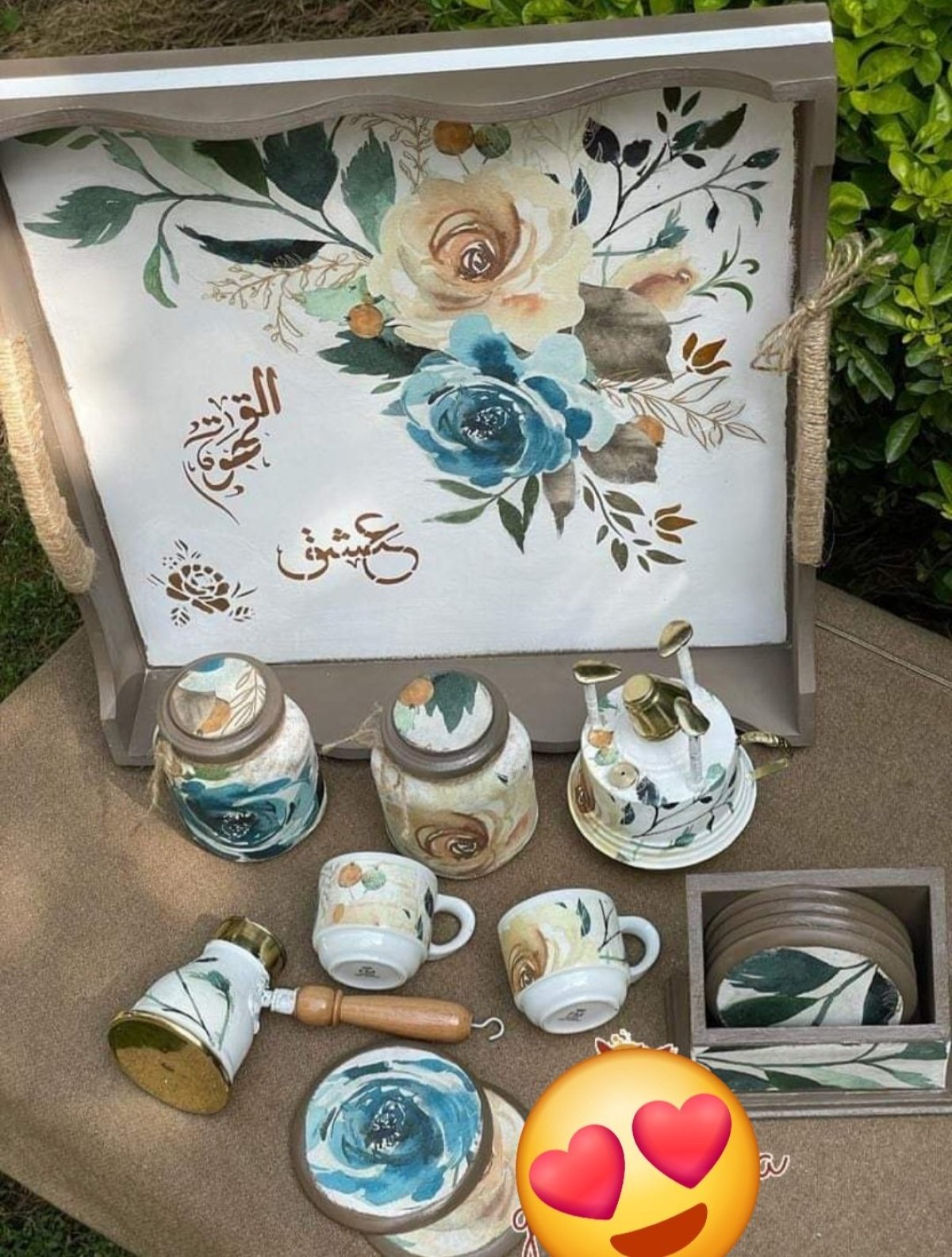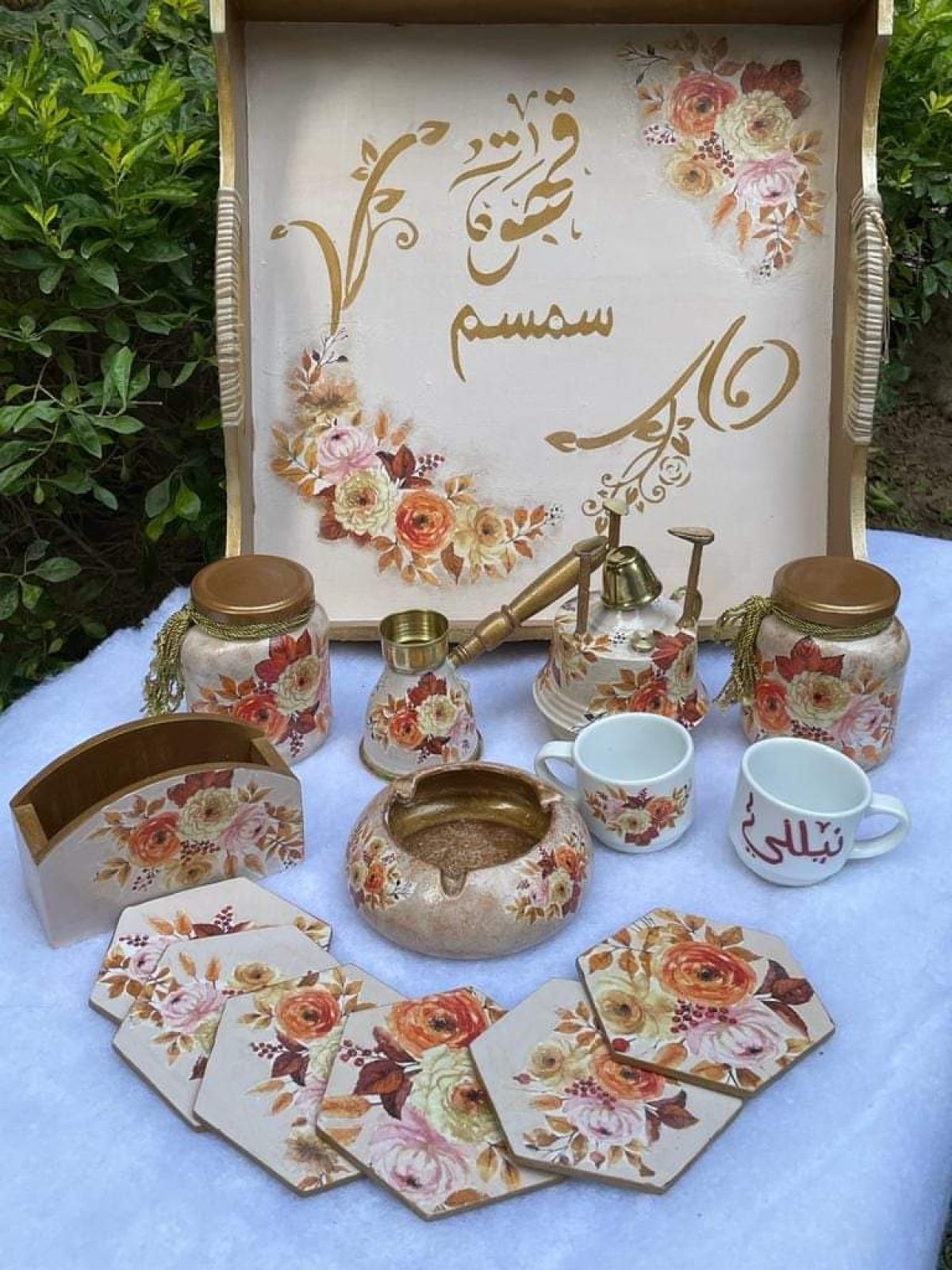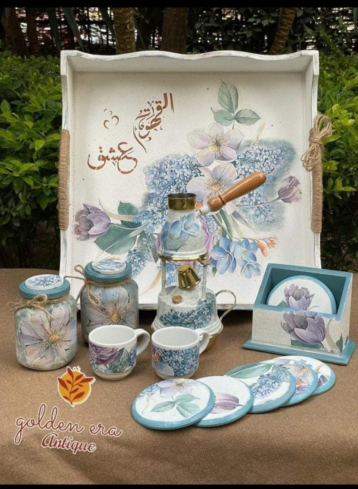 طقم قهوة مكون من ١٤ قطعه صينيه خشب ٣٥ سم × ٣٥ سم سبرتايه نحاس كتكة نحاس عدد ٢ فنجان بورسلين برطمان زجاج للبن برطمان زجاج للسكر طقم كوسترات ) علبه + ٦ كوسترات ( متاح التنفيذ بأى لون وكتابه اى اسم أو عبارة
