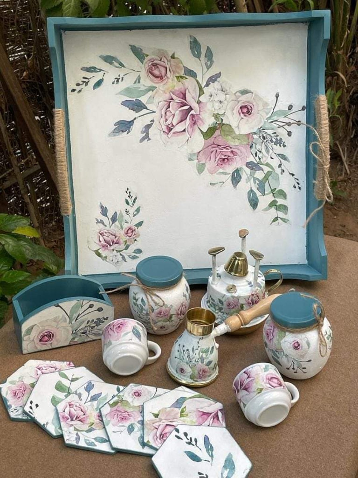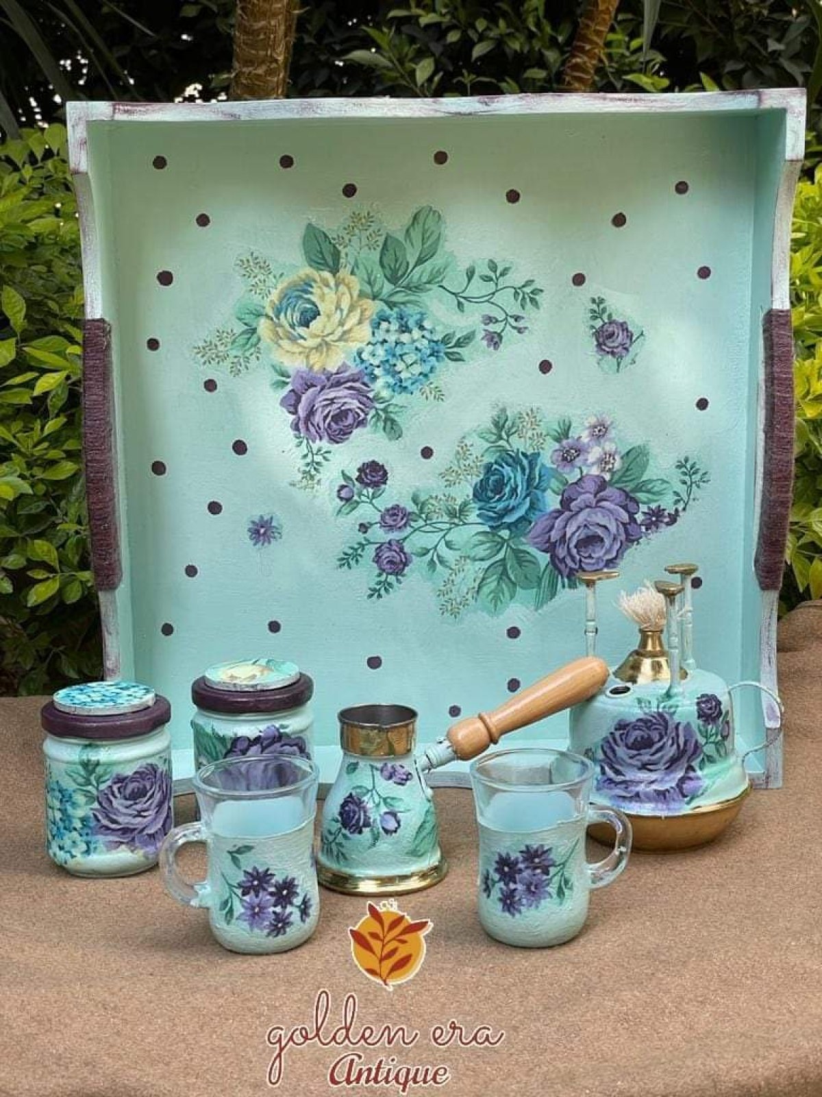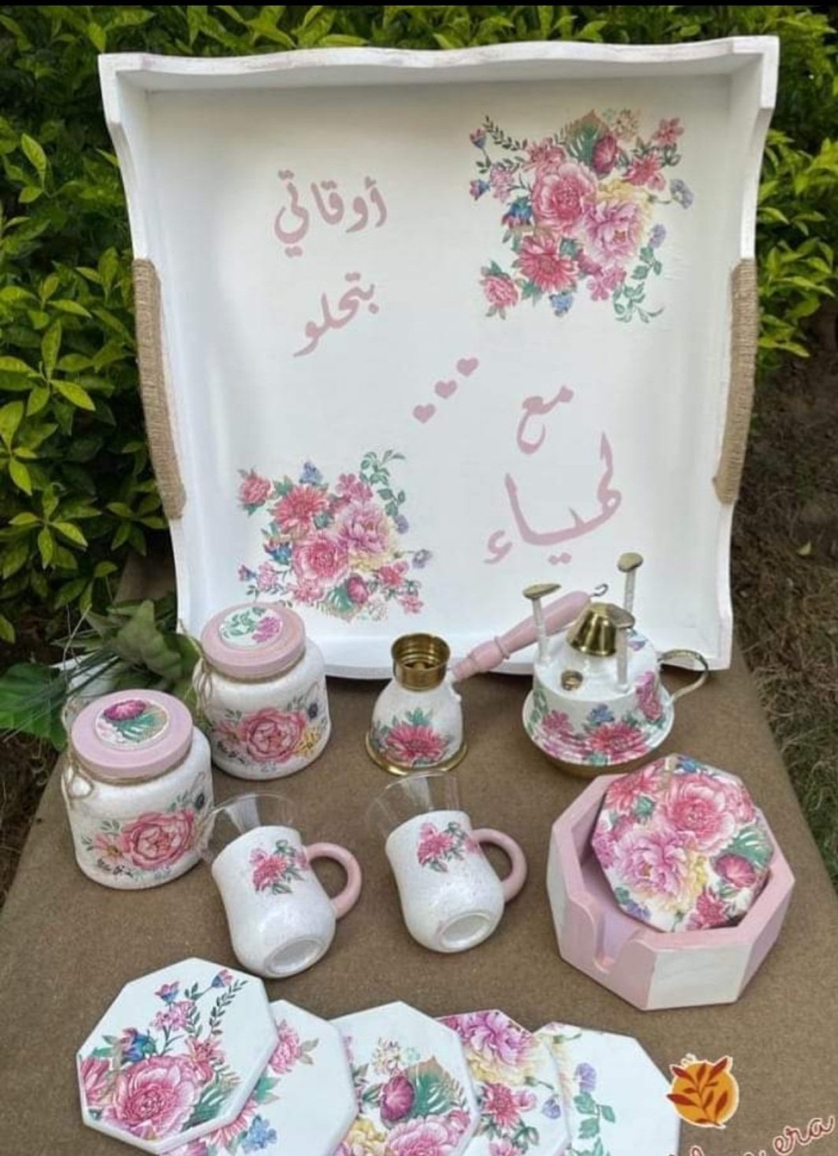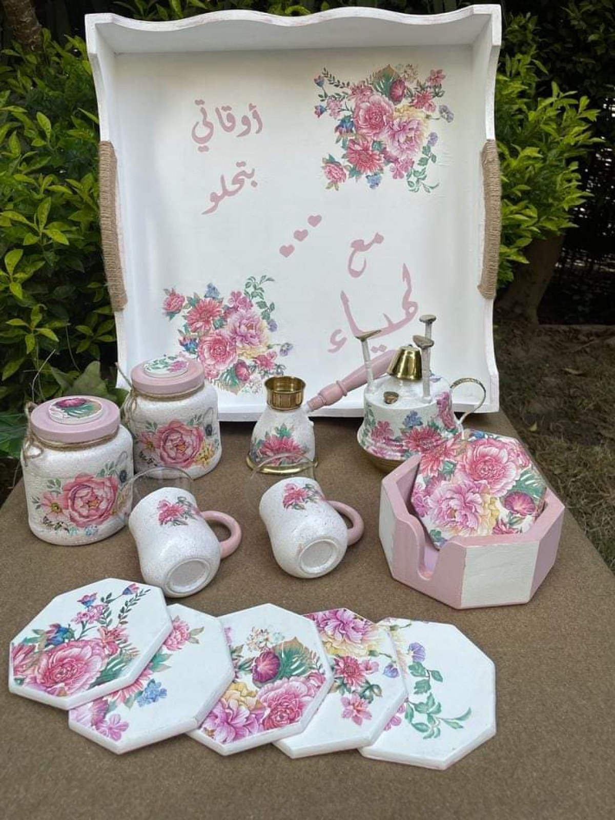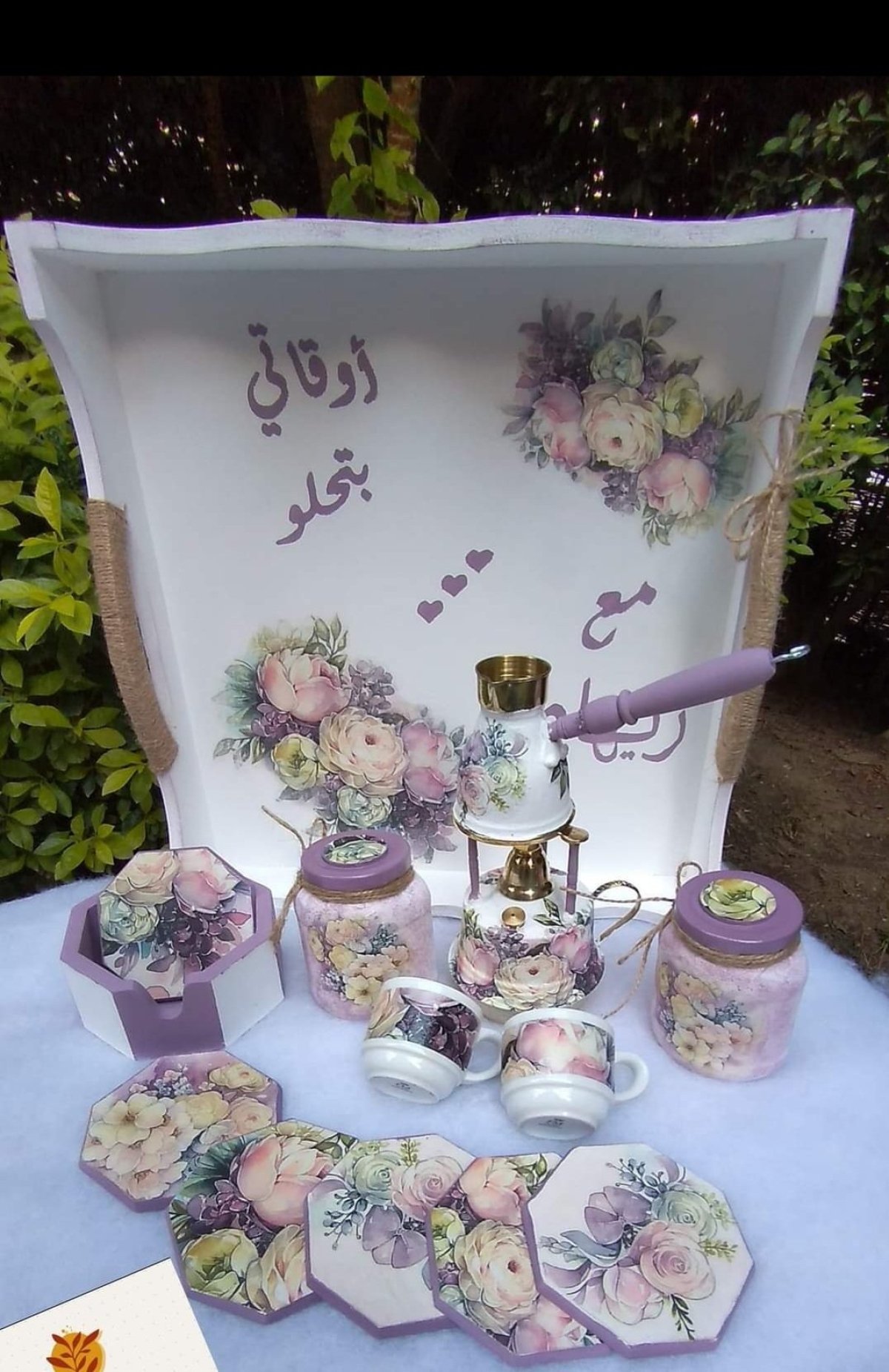 طقم قهوة مكون من ١٤ قطعه صينيه خشب ٣٥ سم × ٣٥ سم سبرتايه نحاس كتكة نحاس عدد ٢ فنجان بورسلين برطمان زجاج للبن برطمان زجاج للسكر طقم كوسترات ) علبه + ٦ كوسترات ( متاح التنفيذ بأى لون وكتابه اى اسم أو عبارة