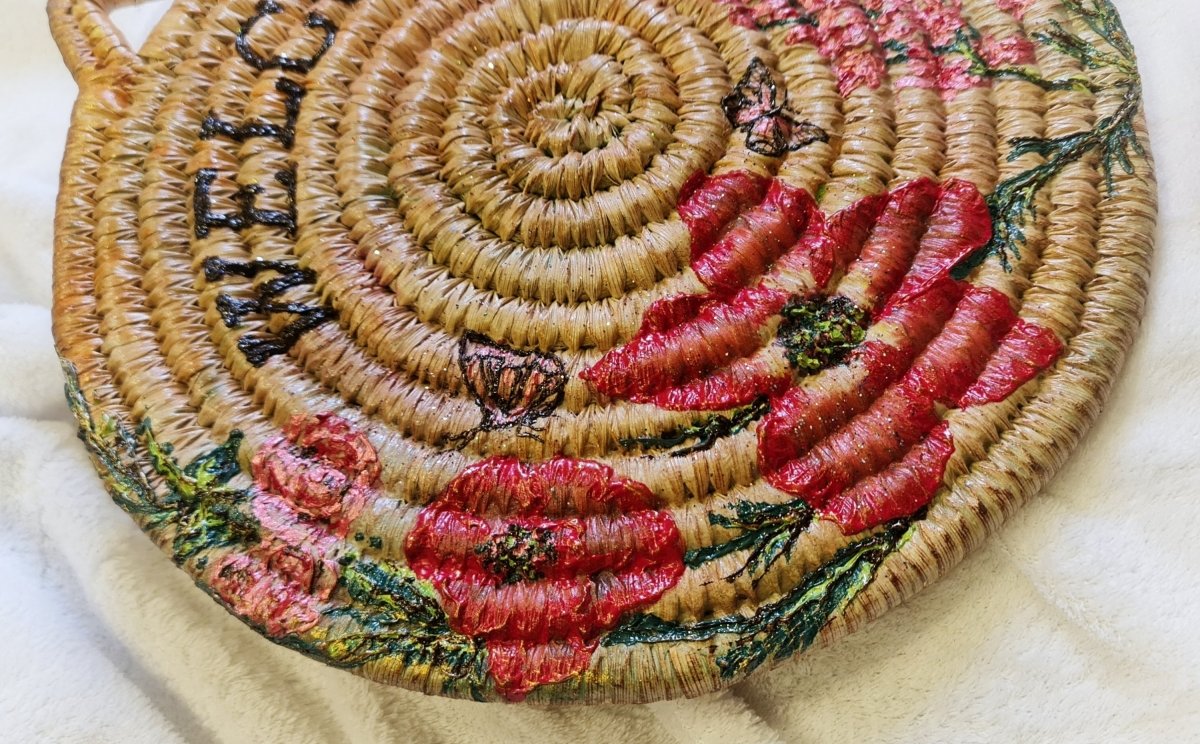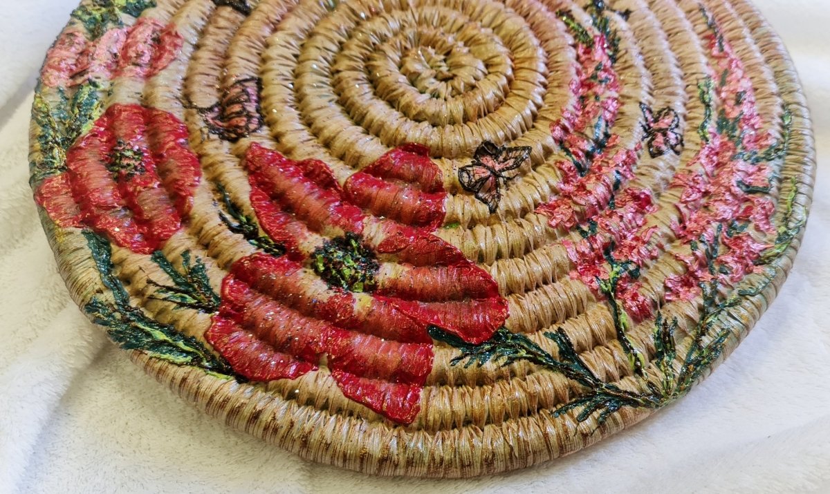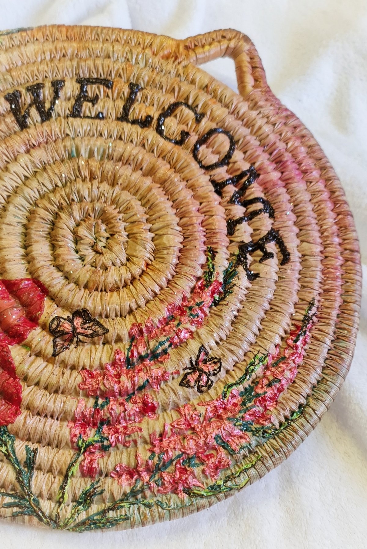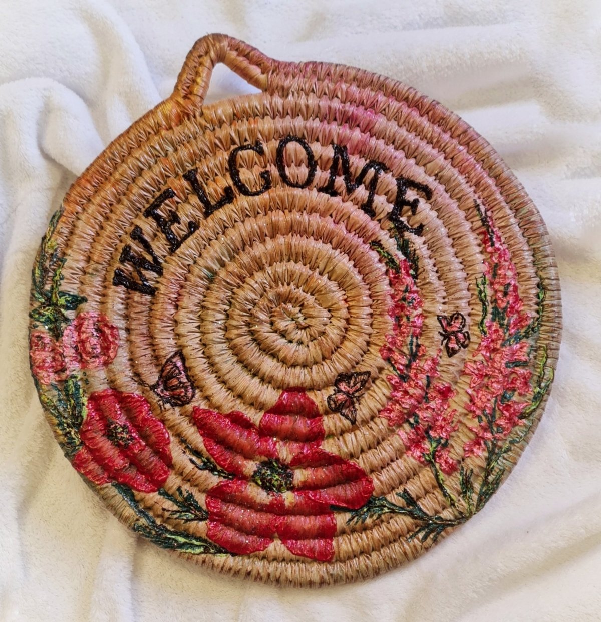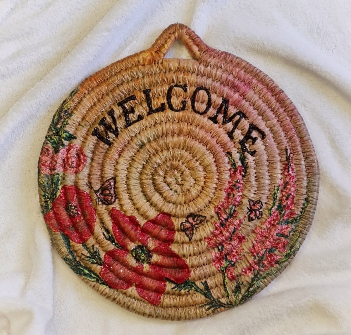 تابلو مصنوع من القش مزين بفن الديكوباج والريليف مقاس٢٩×٢٩سم مظهر نهائي لامع مع بعض الجليتر الملون متاح قطعه واحده غير مكررة