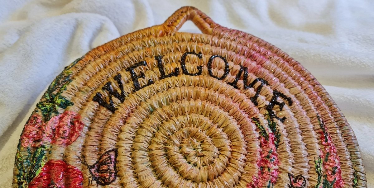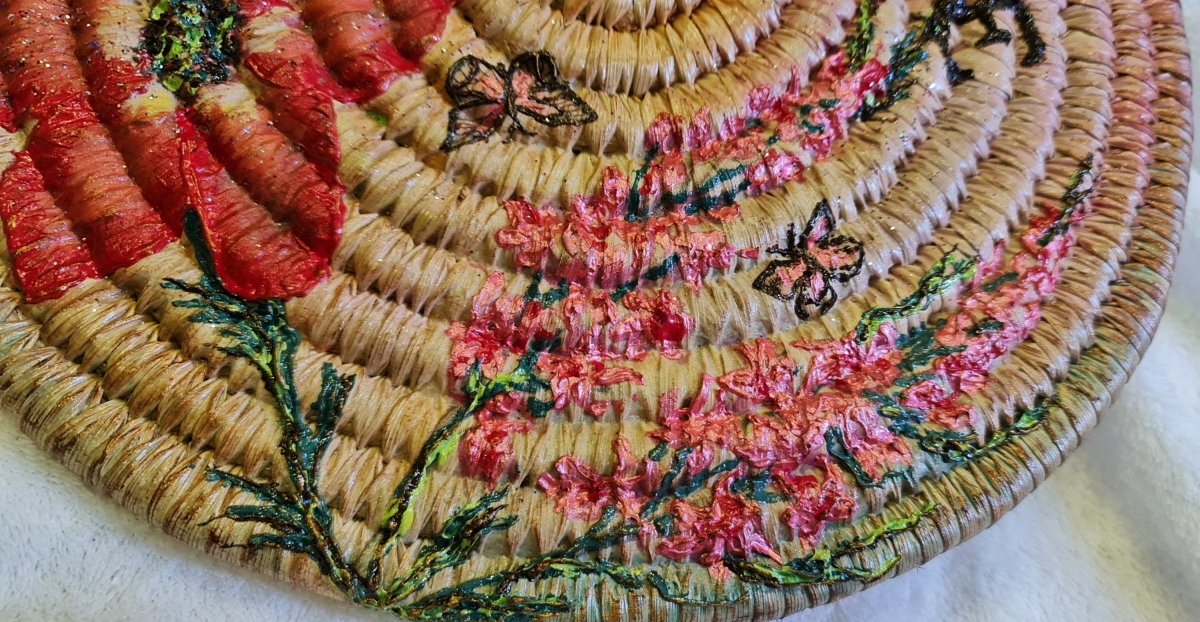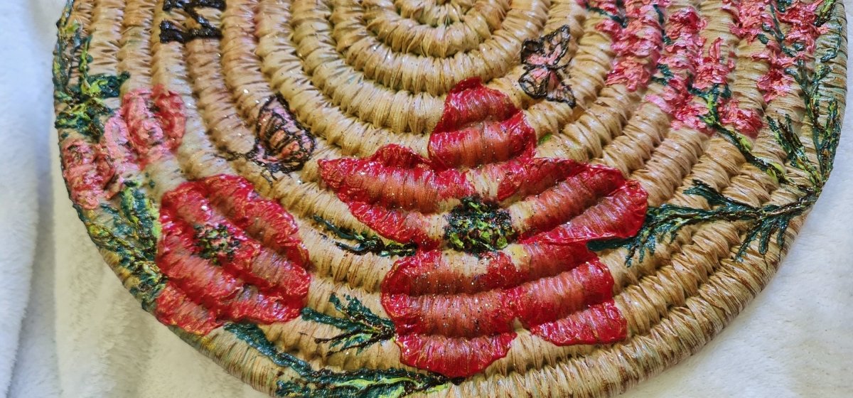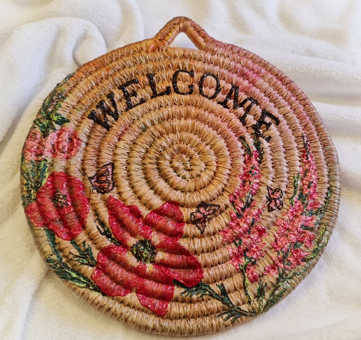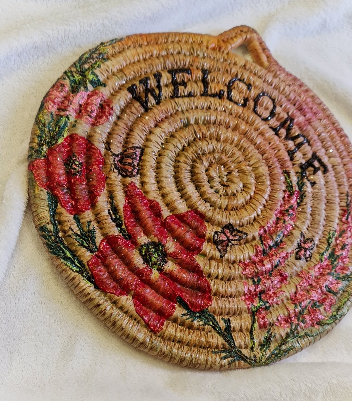 تابلو مصنوع من القش مزين بفن الديكوباج والريليف مقاس٢٩×٢٩سم مظهر نهائي لامع مع بعض الجليتر الملون متاح قطعه واحده غير مكررة