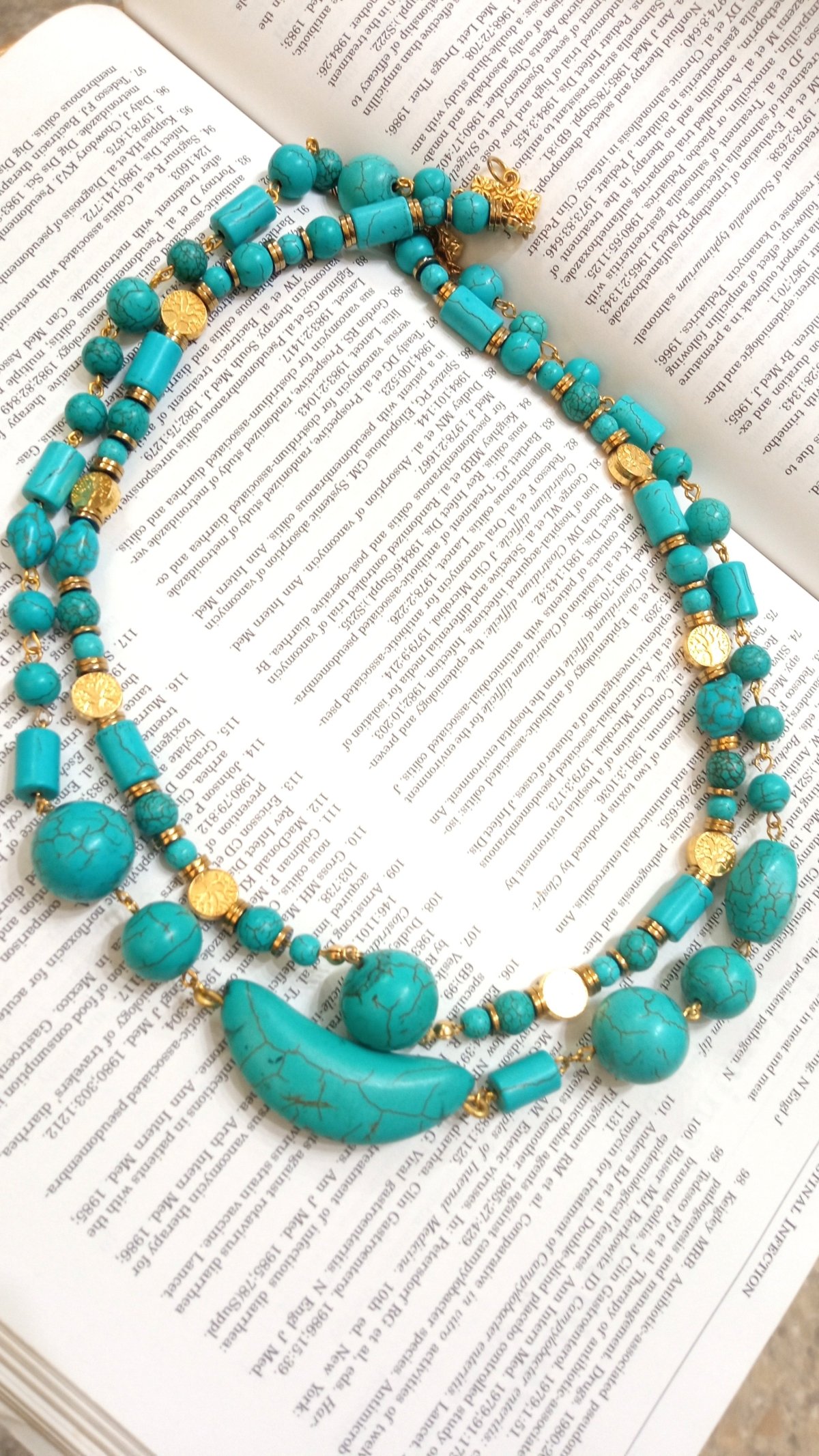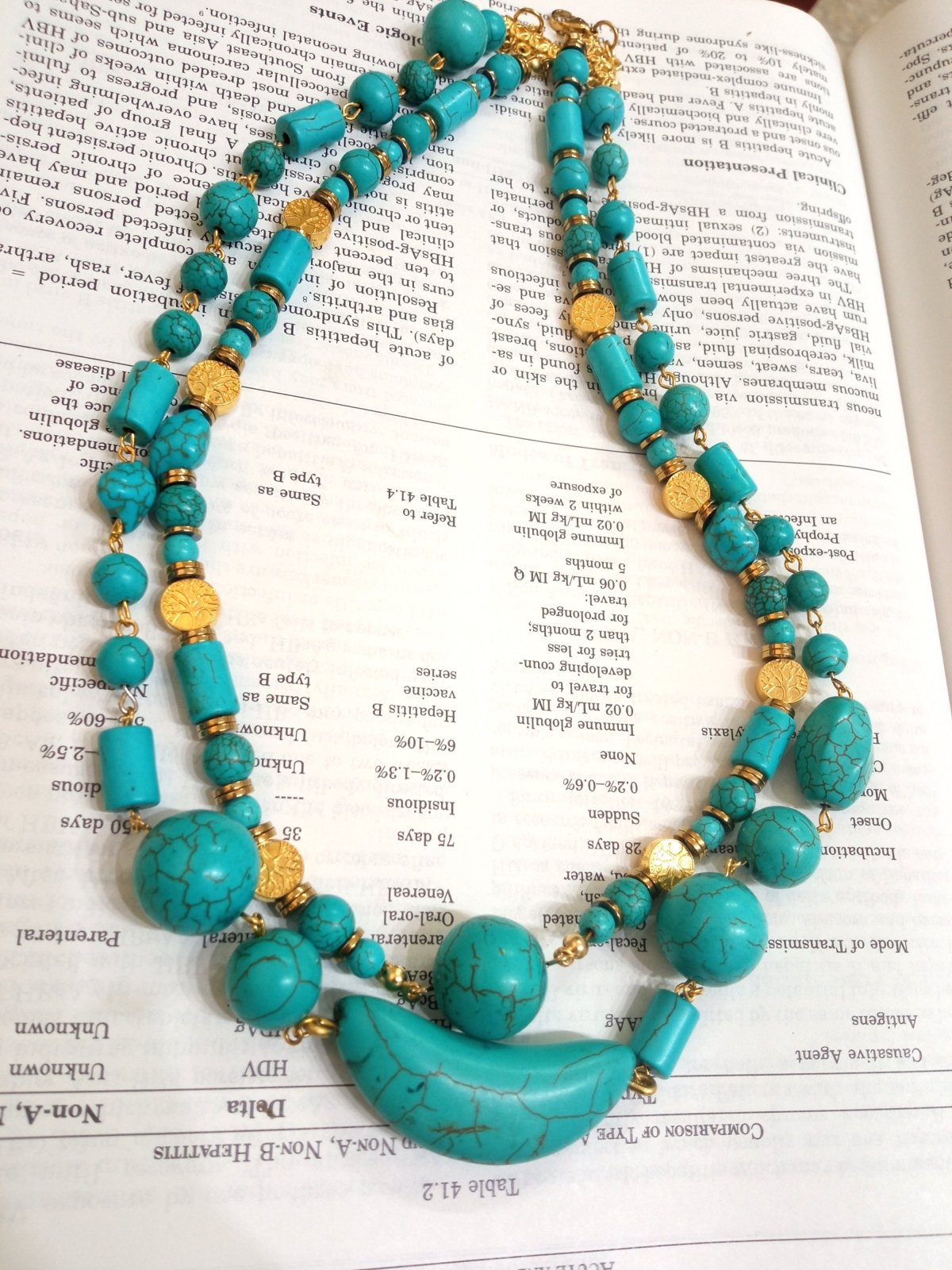كوليه فيروز مع هيماتيت لا تصدأ و فواصل مطلية دهب صيني طول الكوليه 61 سم