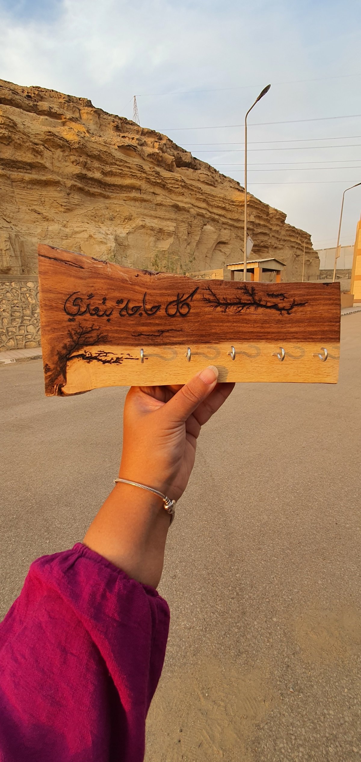 كل حاجة بتعدي عليقة مفاتيح للتعليق بجانب الباب، مصنوعة من جذع خشب من شجر السرسوع، مزين بتصميم فريد، نفَّذناه بفن الحرق اليدوي على الخشب. الأبعاد: ارتفاع حوالي ١٠ سم، عرض حوالي ٢٦ سم، سمك ٣,٥ - ٤,٥ سم