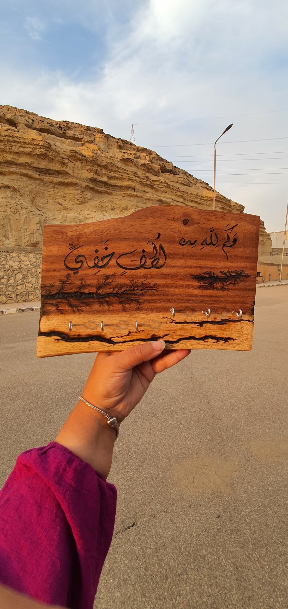 وكم لله من لطفٍ خفي عليقة مفاتيح للتعليق بجانب الباب، مصنوعة من جذع خشب من شجر السرسوع، مزين بتصميم فريد، نفَّذناه بفن الحرق اليدوي على الخشب. الأبعاد: ارتفاع حوالي ١٨ سم، عرض حوالي ٢٧ سم، سمك ١ - ١,٥ سم