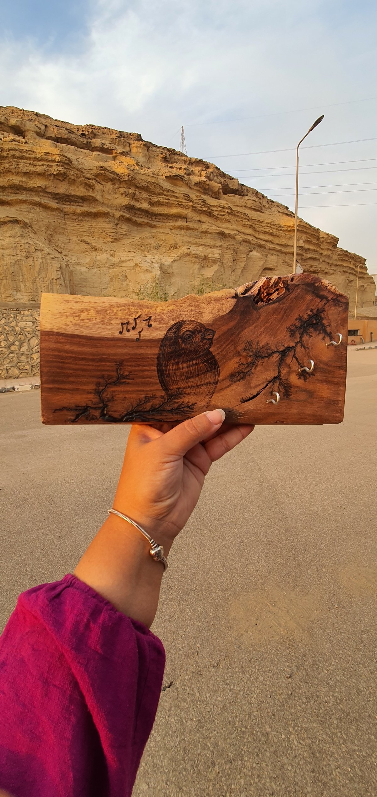 عليقة مفاتيح للتعليق بجانب الباب، مصنوعة من جذع خشب من شجر السرسوع، مزين بتصميم فريد، نفَّذناه بفن الحرق اليدوي على الخشب. الأبعاد: ارتفاع حوالي ١١-١٥ سم، عرض حوالي ٢٧ سم، سمك ٣ - ٤ سم