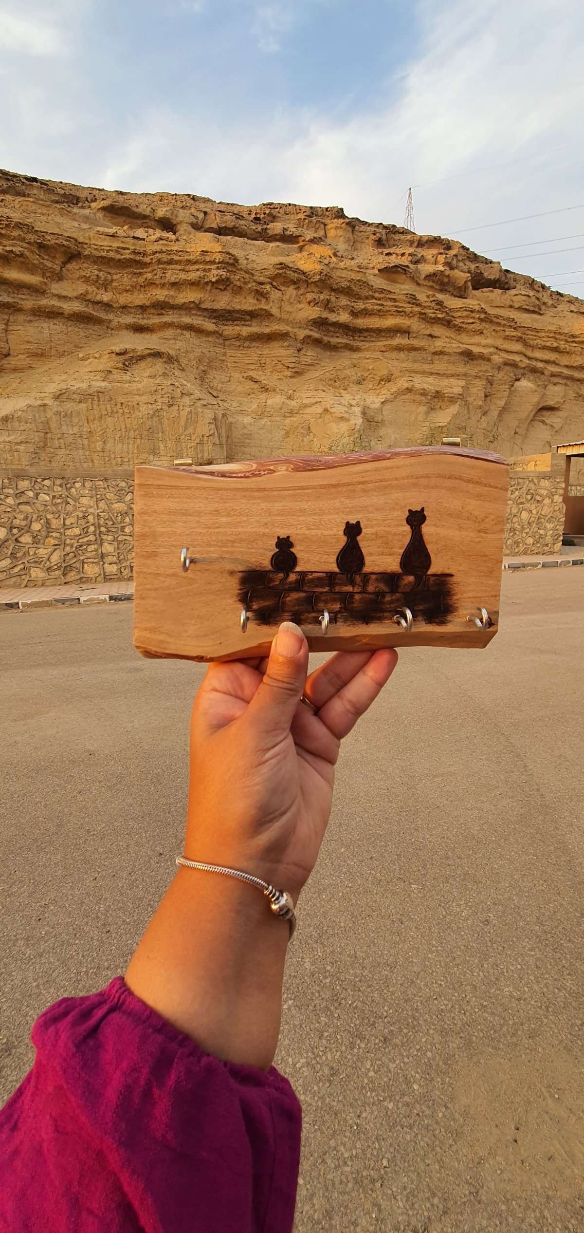 عليقة مفاتيح للتعليق بجانب الباب، مصنوعة من جذع خشب من شجر البزروميا، مزين بتصميم فريد، نفَّذناه بفن الحرق اليدوي على الخشب. الأبعاد: ارتفاع حوالي ٩ سم، عرض حوالي ١٨ سم، سمك ٢,٥ سم