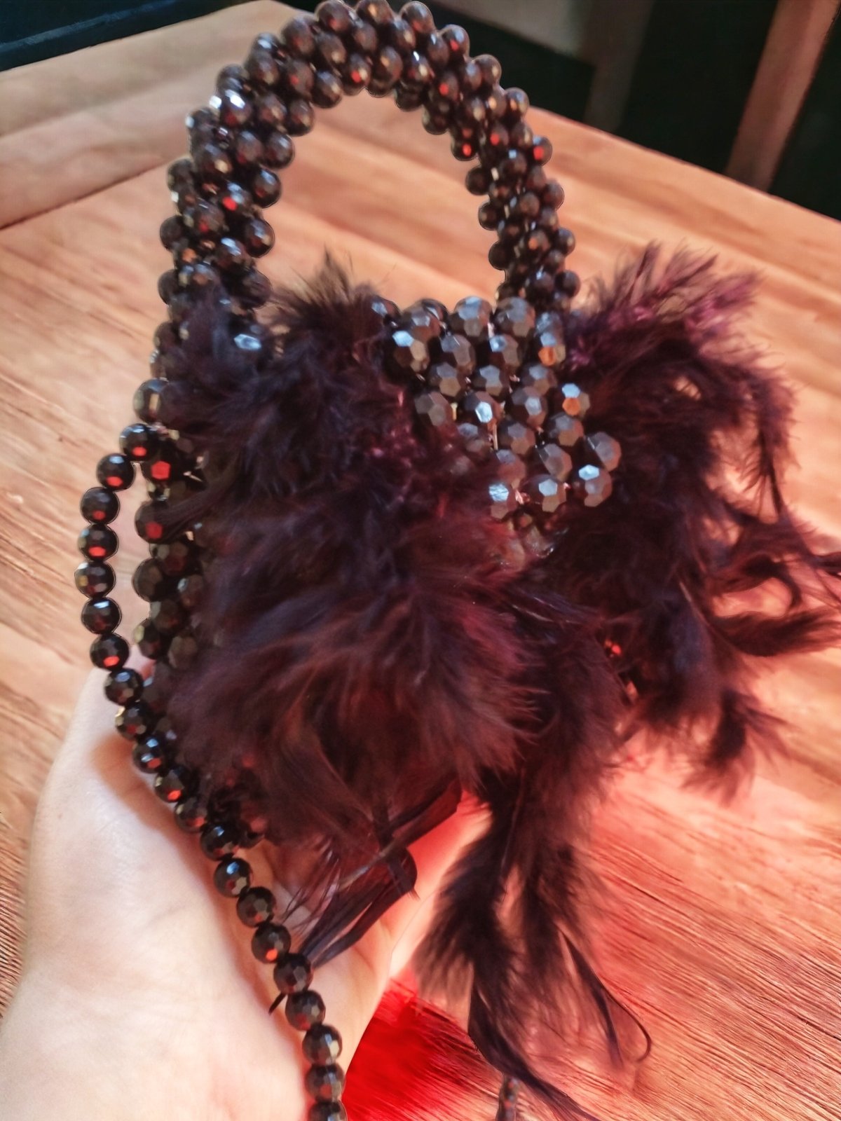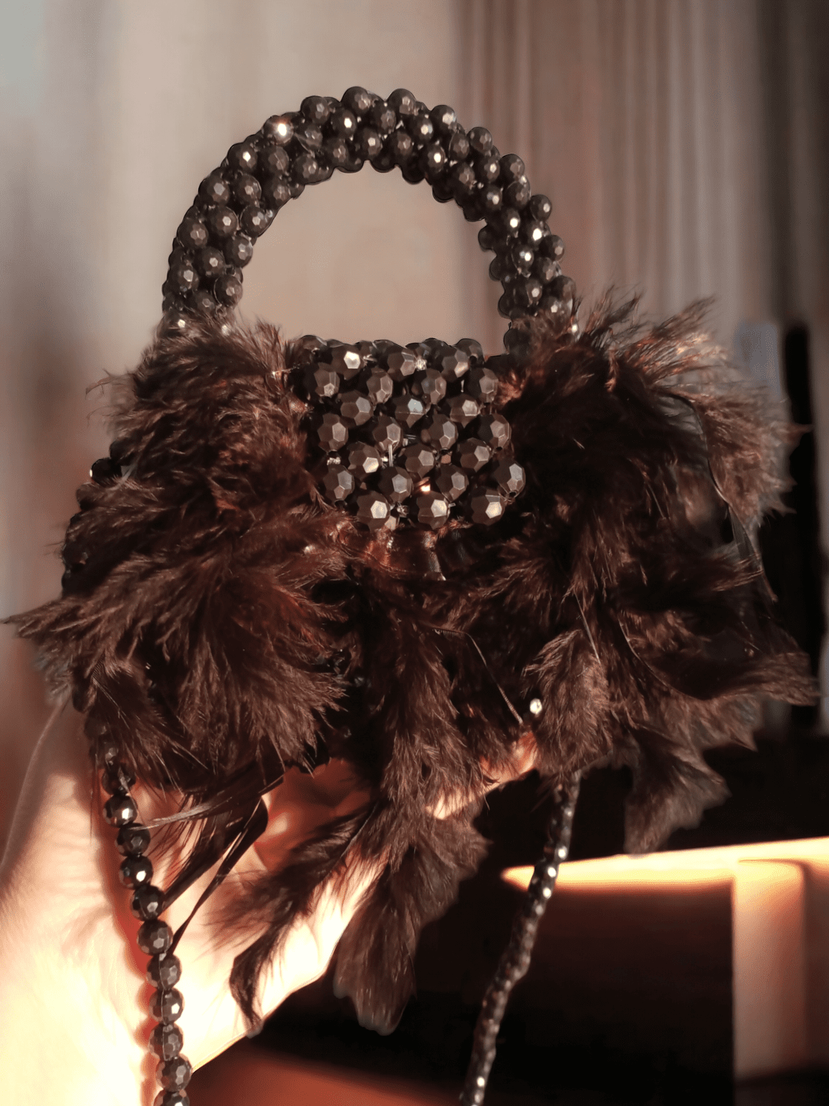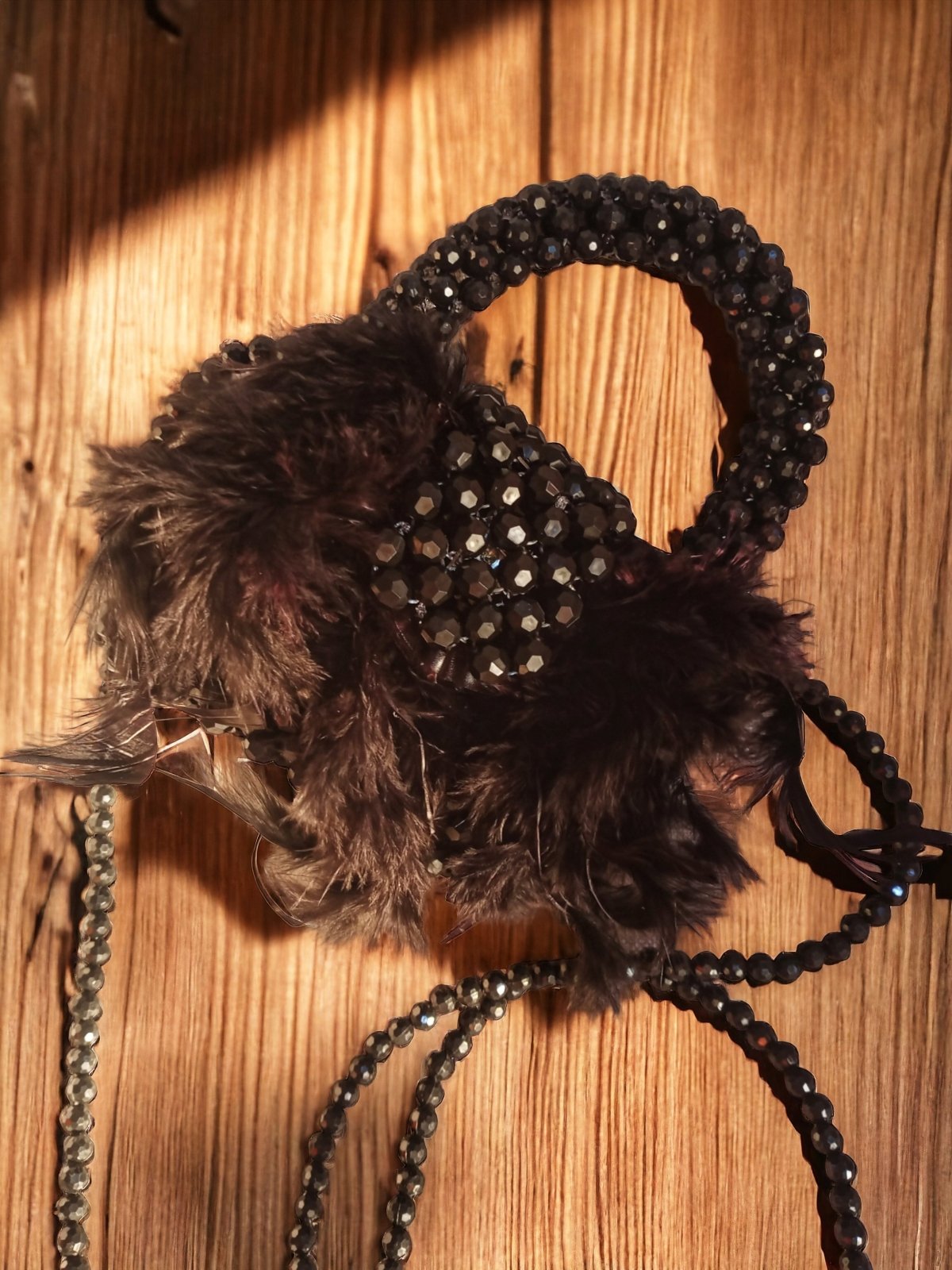 شنطه من الكريستال الاسود صنعت يدويا مزوده بريش اسود وذراع كروس مقاس 15/12