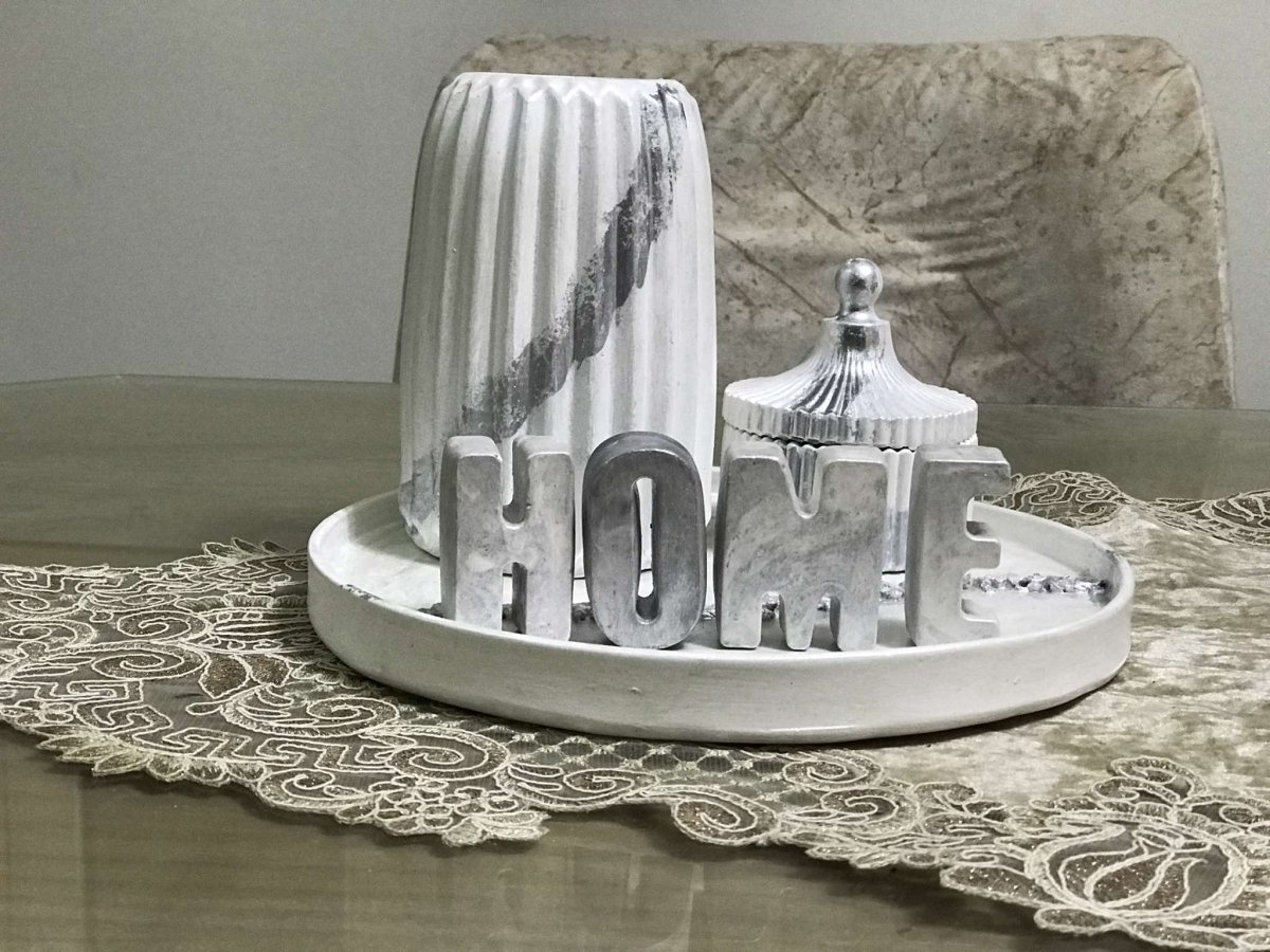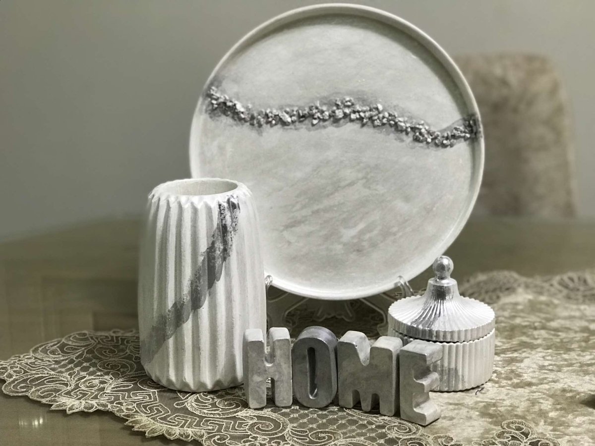 ** طقم ديكور كونكريت انيق ** الخامه : كونكريت **المكونات:** صينية دائرية : مقاس 26سم - بلون أبيض ناعم مع لون رمادى مع زخرفة فضية على شكل خط متموج يضيف لمسة فنية. مزهرية طويلة مضلعه : مقاس 15سم - تصميم مضلع بلمسة من اللون الرمادي الداكن تمتد بشكل قطري. بونبونيره مزخرفه : مقاس (10سم ) عرض (8 سم ) - لونها أبيض ناعم، ومزودة بتفاصيل فضيه تضفي لمسة فخامة. حروف كلمة "HOME" - باللون الرمادي، تمثل قطعة زخرفية تضيف شعورًا بالدفء والراحة. **الاستخدامات:** تزيين الأرفف: يعد مثاليًا لوضعه على أرفف غرف المعيشة أو المكاتب ليضيف جمالية بسيطة وأنيقة. ركن استقبال الضيوف: يمكن استخدامه كجزء من ديكور ركن الاستقبال ليمنح شعورًا بالدفء والترحاب. مناسبات خاصة: يناسب استخدامه في حفلات صغيرة مثل حفلات الشاي أو الاستقبالات. ديكور منزلي: يمكن وضعه على طاولة الطعام أو طاولة القهوة لإضافة لمسة جمالية بسيطة وأنيقة. قطعة عرض في المناسبات: مثالي للاستخدام كجزء من ديكور حفلة صغيرة أو استقبال في المنزل. هدية منزلية: يمكن تقديم هذا الطقم كهدية مميزة لأصدقاء أو عائلة عند الانتقال إلى منزل جديد. إضافة لمسة جمالية: بفضل تصميمه البسيط والألوان المحايدة، يمكن تنسيقه مع الشموع، الزهور أو أي قطعة ديكور إضافية. ديكور للمكاتب: مناسب لوضعه في المكاتب كقطعة فنية أنيقة تضيف جمالًا للبيئة العملية. **الألوان والتصميم:** - تصميم بسيط وألوان محايدة (أبيض ورمادي) تجعله يتماشى بسهولة مع أي ديكور داخلي. - يناسب أنماط الديكور المختلفة مثل الكلاسيكي أو العصري. 💡 **نصيحة:** أضف شموعًا أو زهورًا صغيرة بجانب هذا الطقم لزيادة الجمالية وجعل الجو أكثر دفئًا وأناقة.