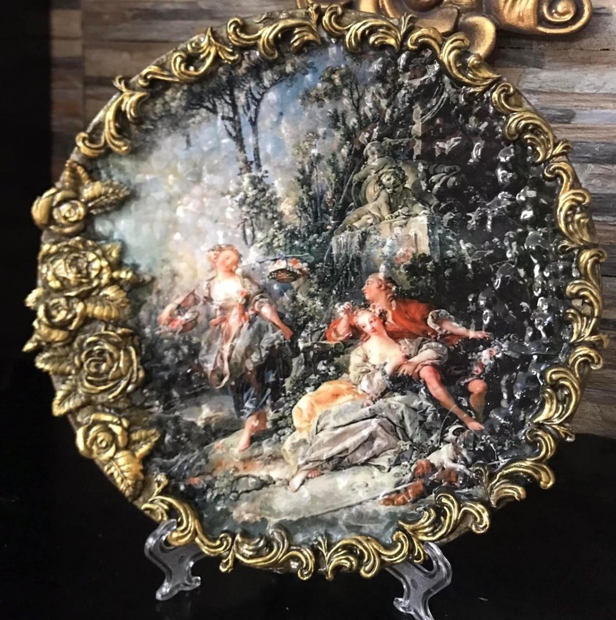 لمسة من الأناقة العتيقة، ينقلك هذا الطبق الخزفي إلى عصر ماضي. يثير الإطار المزخرف والمشهد الرومانسي إحساسًا بالحنين والحب الخالد