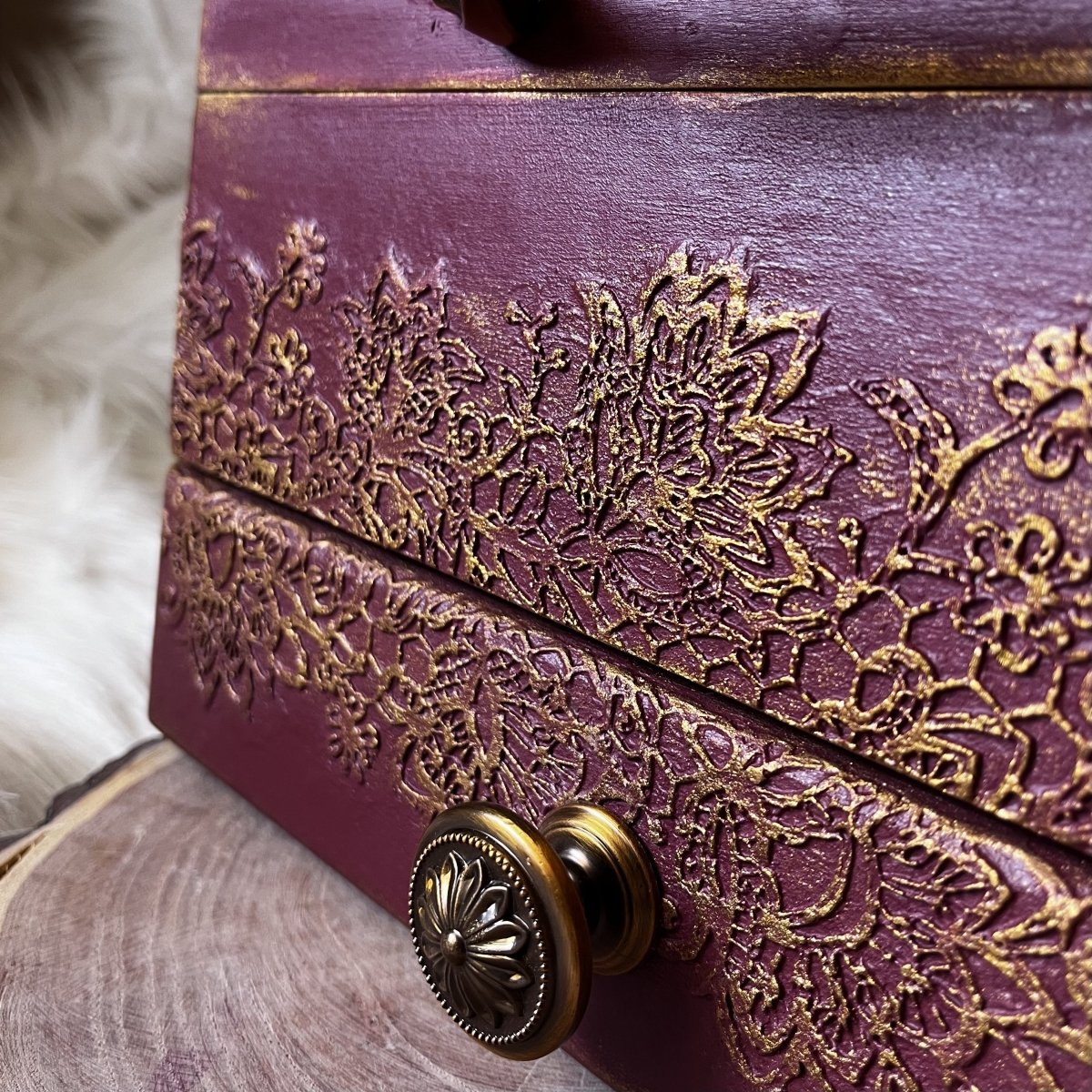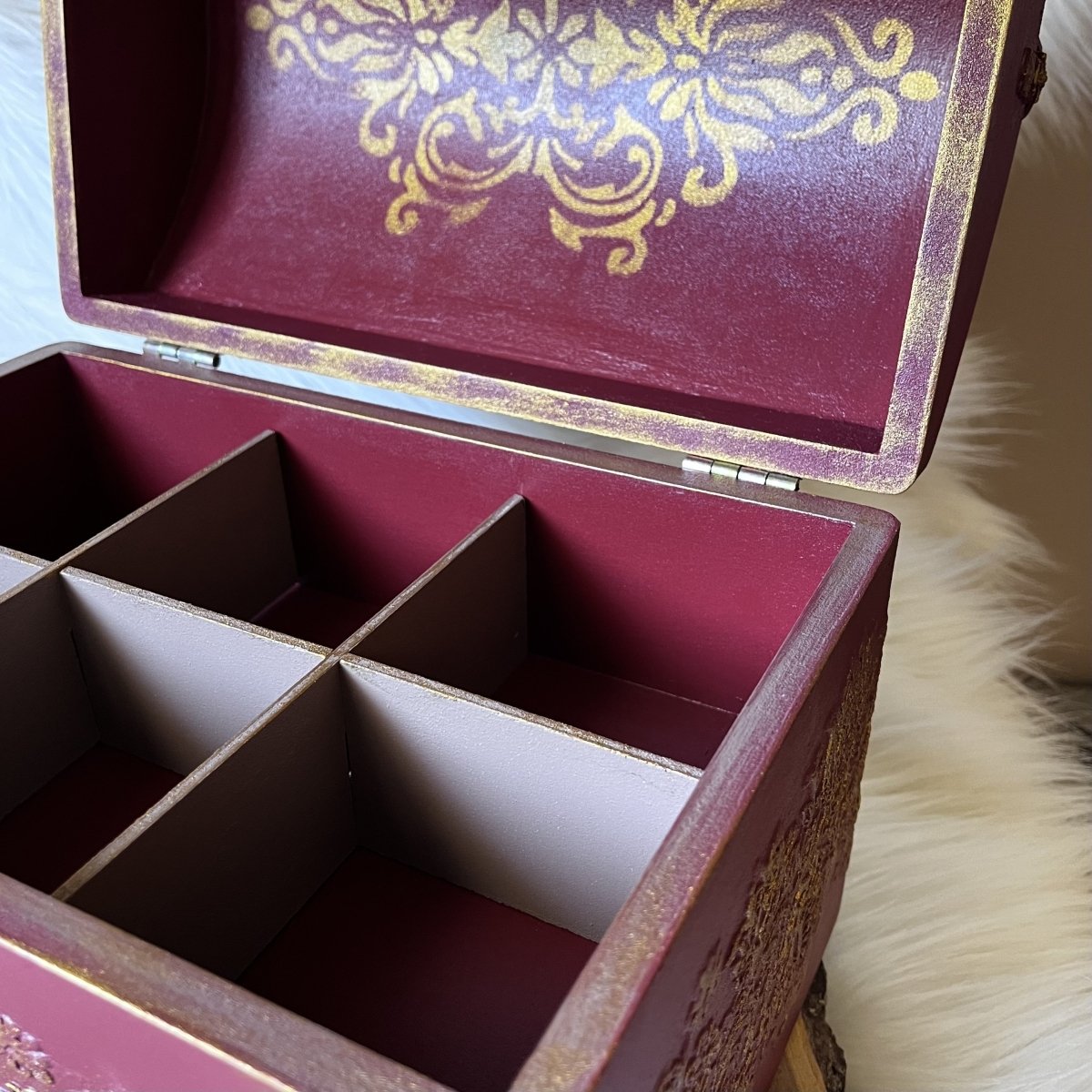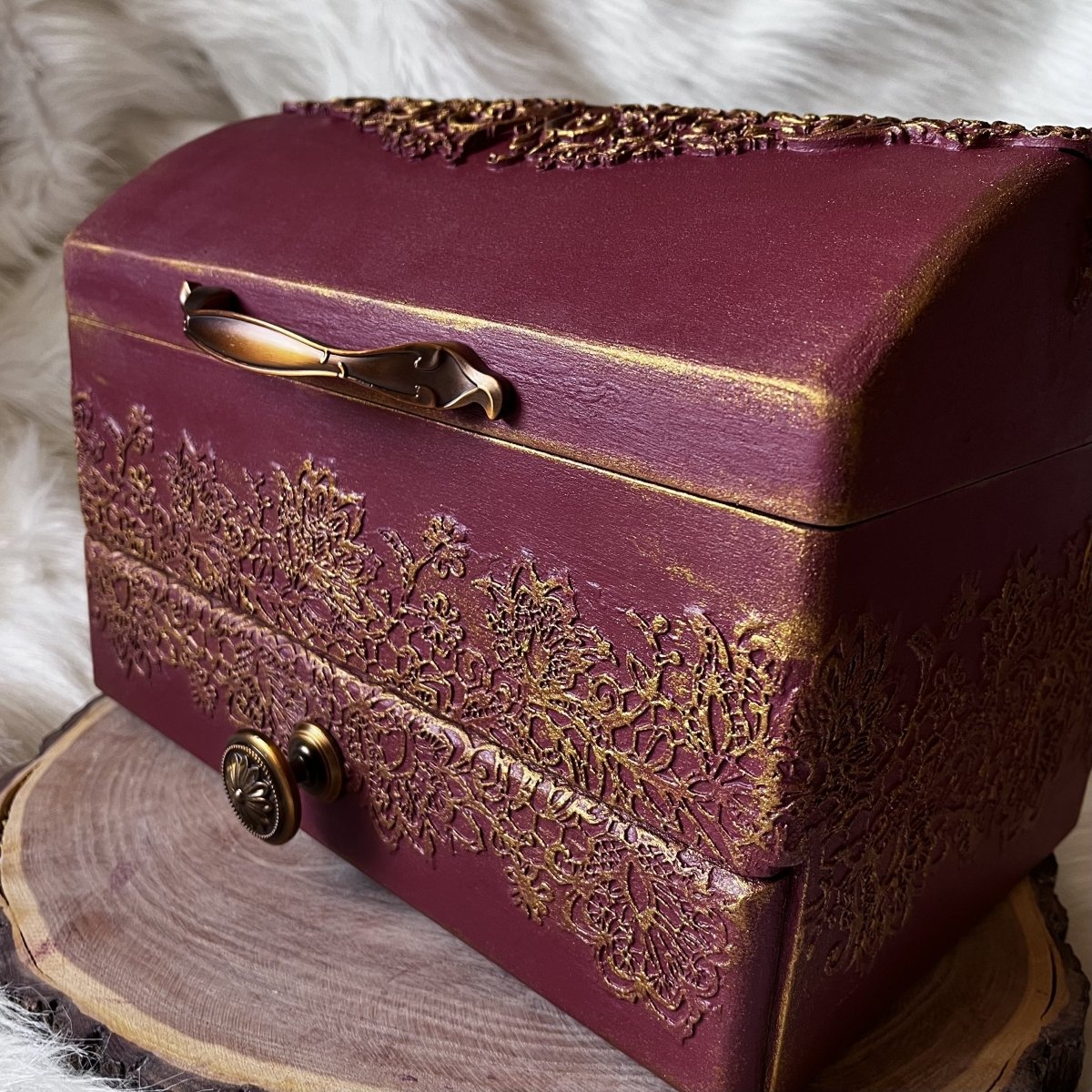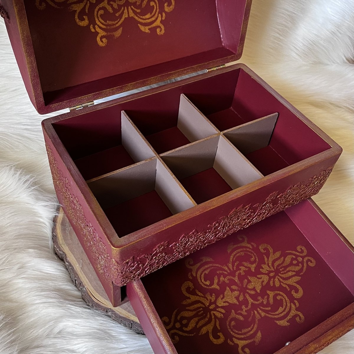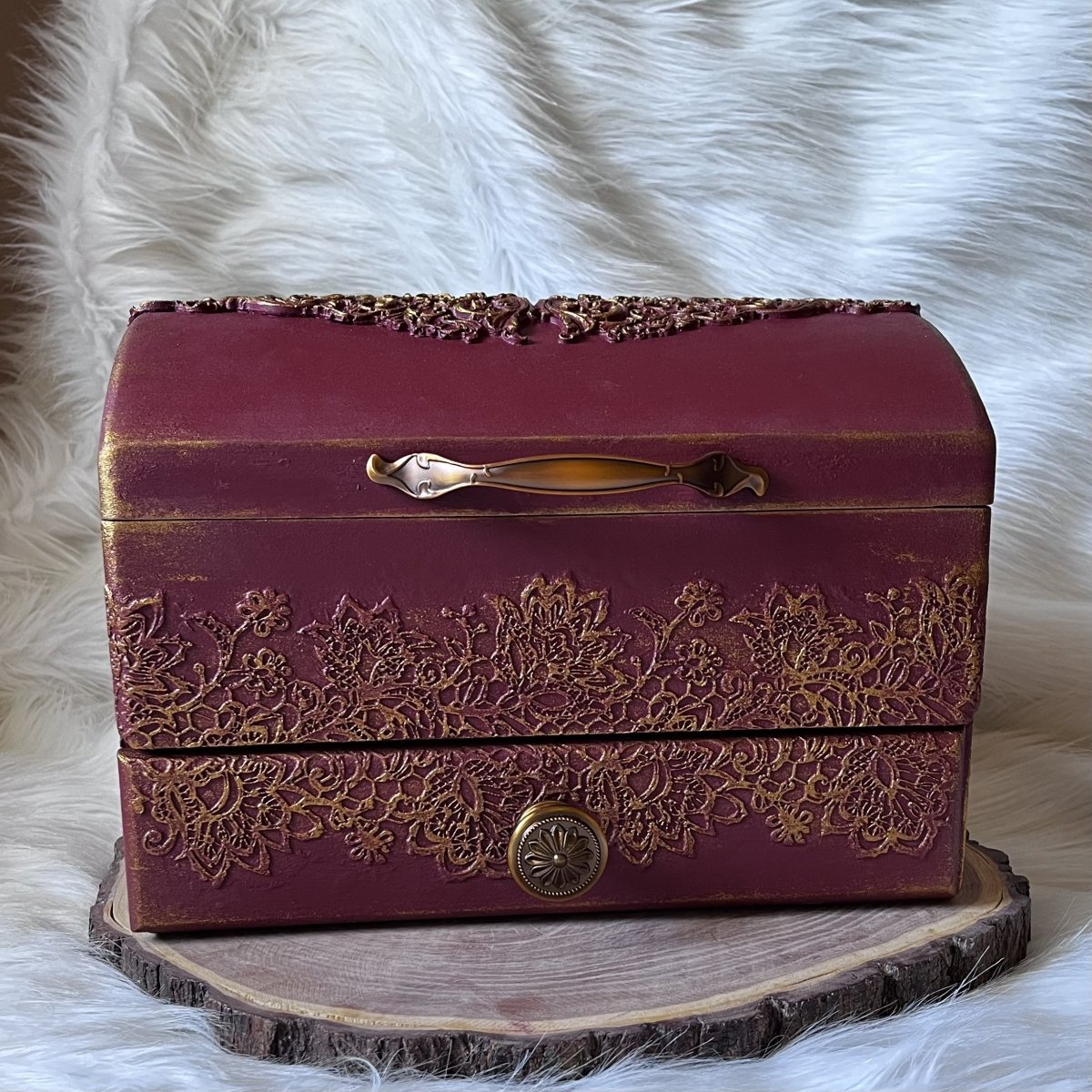 صندوق مجوهرات خشبي كبير الحجم 30*25 سم، ارتفاع 22 سم اللون: أحمر قرمزي ونحاسي