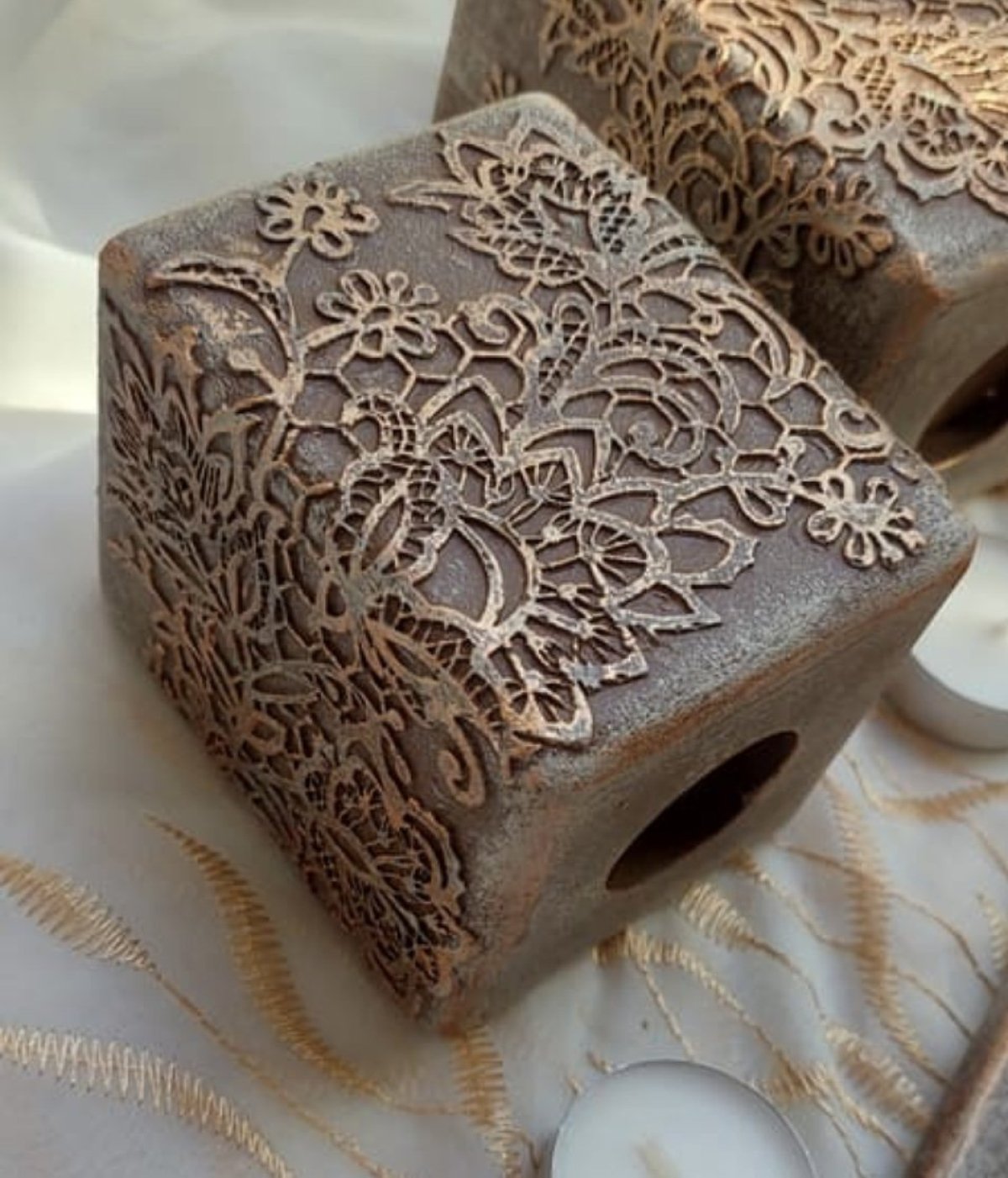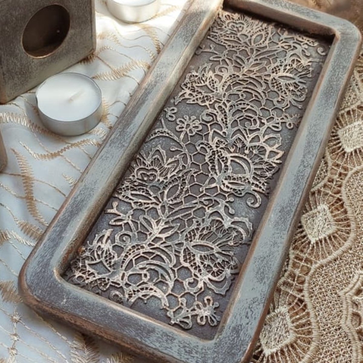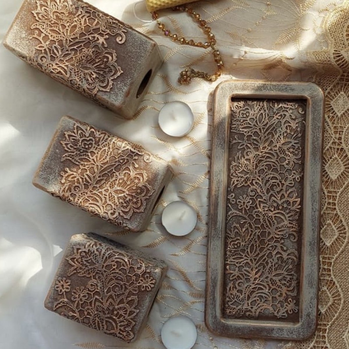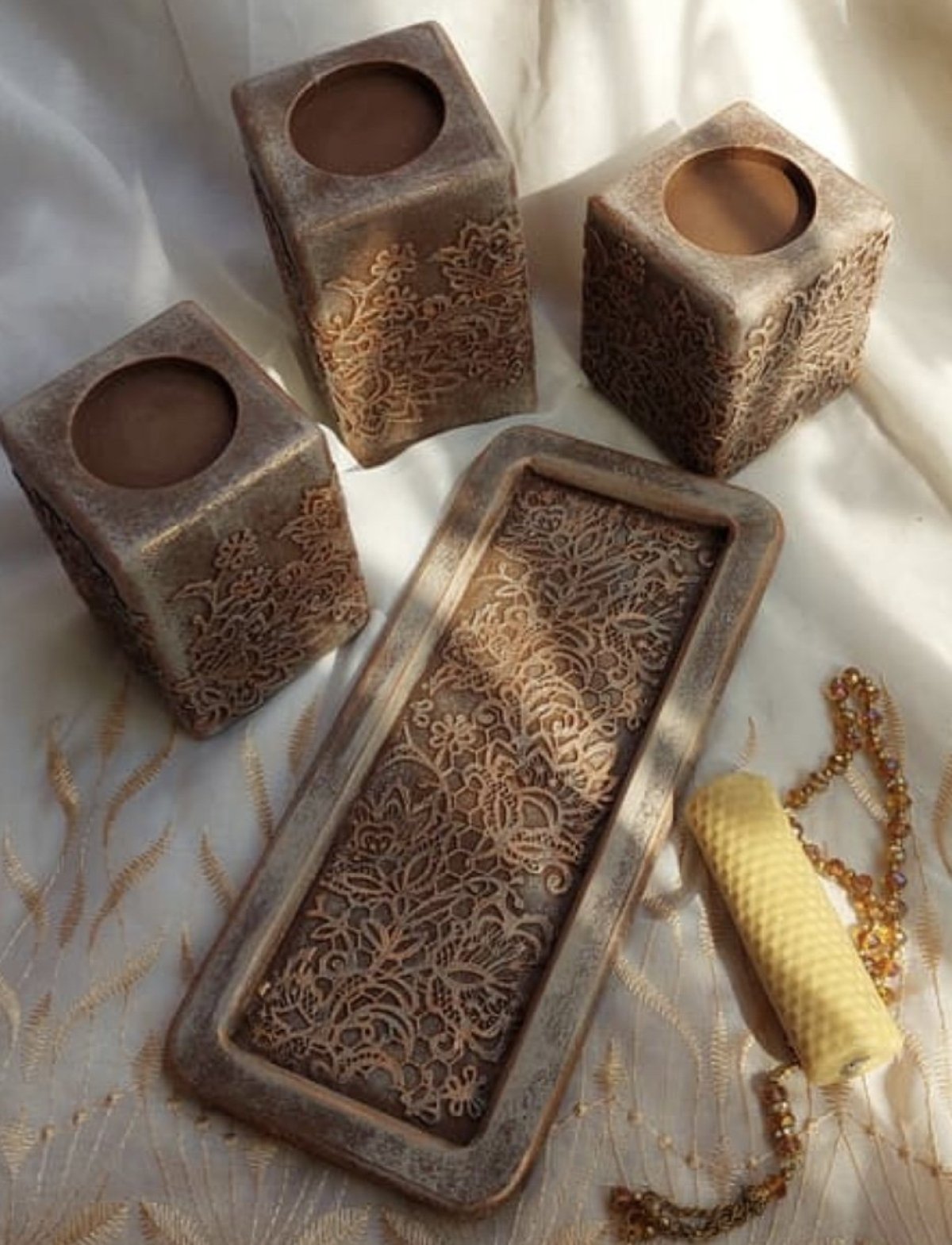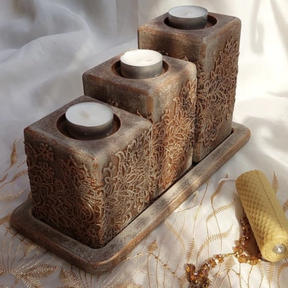 طقم مكون من ٣ قطع من قواعد الشموع الخشب باللون البني والنحاسي مقاس ١٤، ١١، ٩ سم والصينية مقاس : ٢٧*١١ سم