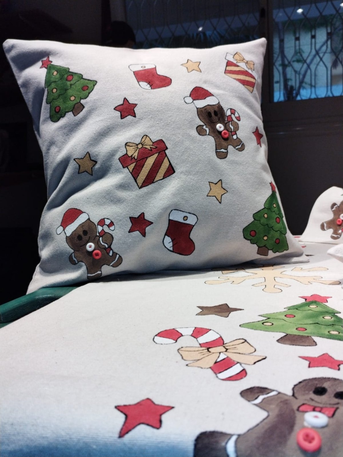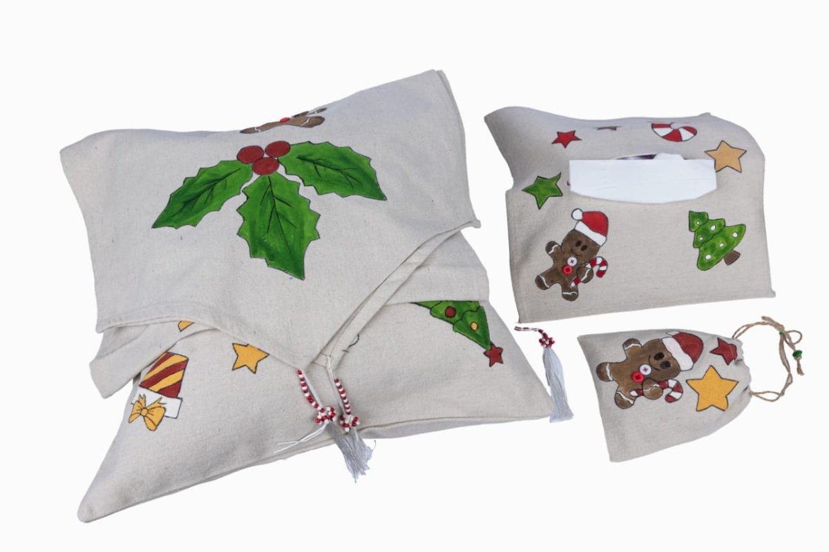 سيت الكريسماس يتكون من (رانر 1.5سم هاند ميد الوان لا تتاثر بالمياه ) +(كفر مناديل 35*35سم - هاند ميد الوان لا تتاثر بالمياه ) +(كوشن 64*64 سم هاند ميد الوان لا تتاثر بالمياه ) +( كيس الهديه 19*15 سم هاند ميد الوان لا تتاثر بالمياه