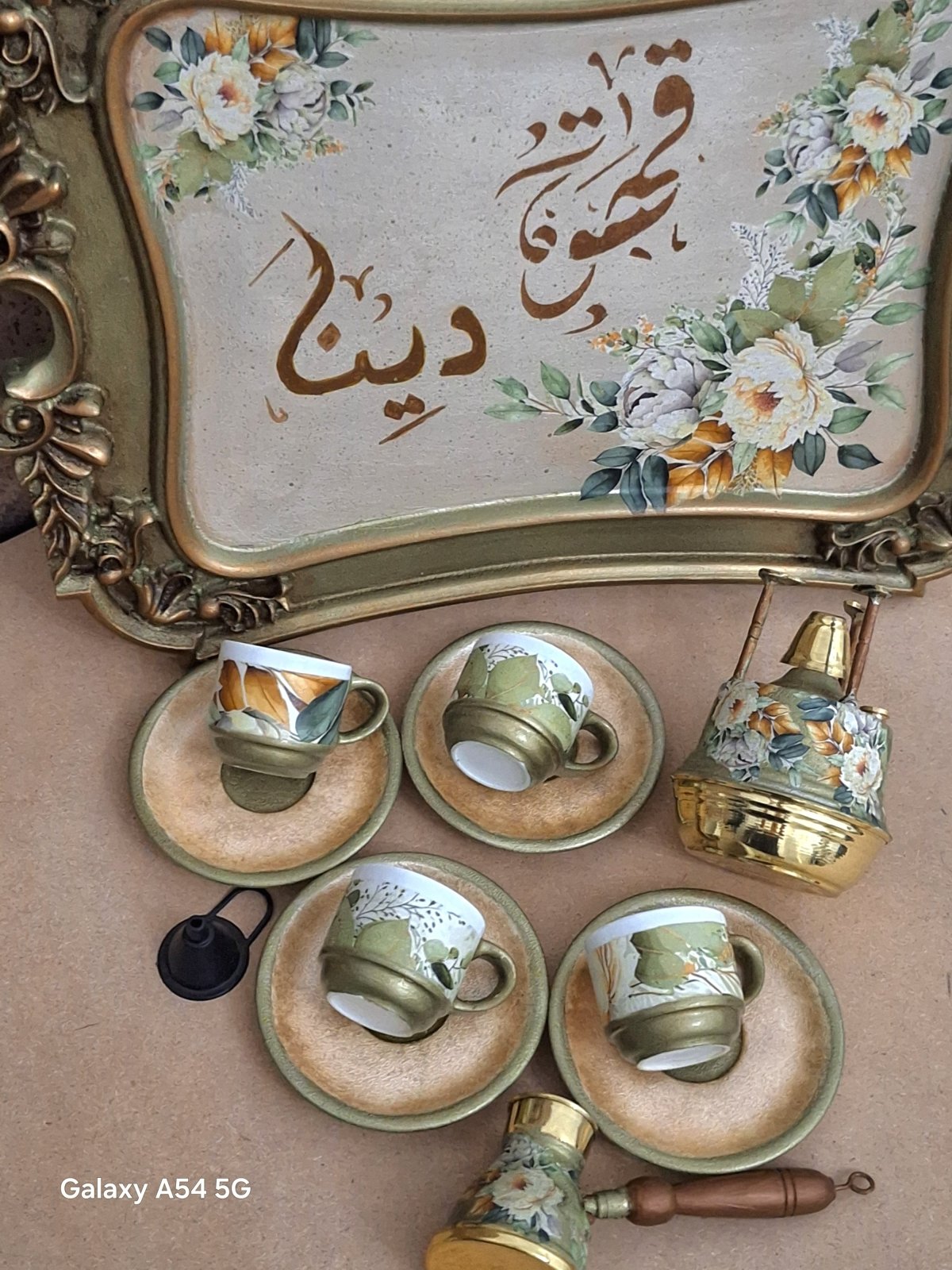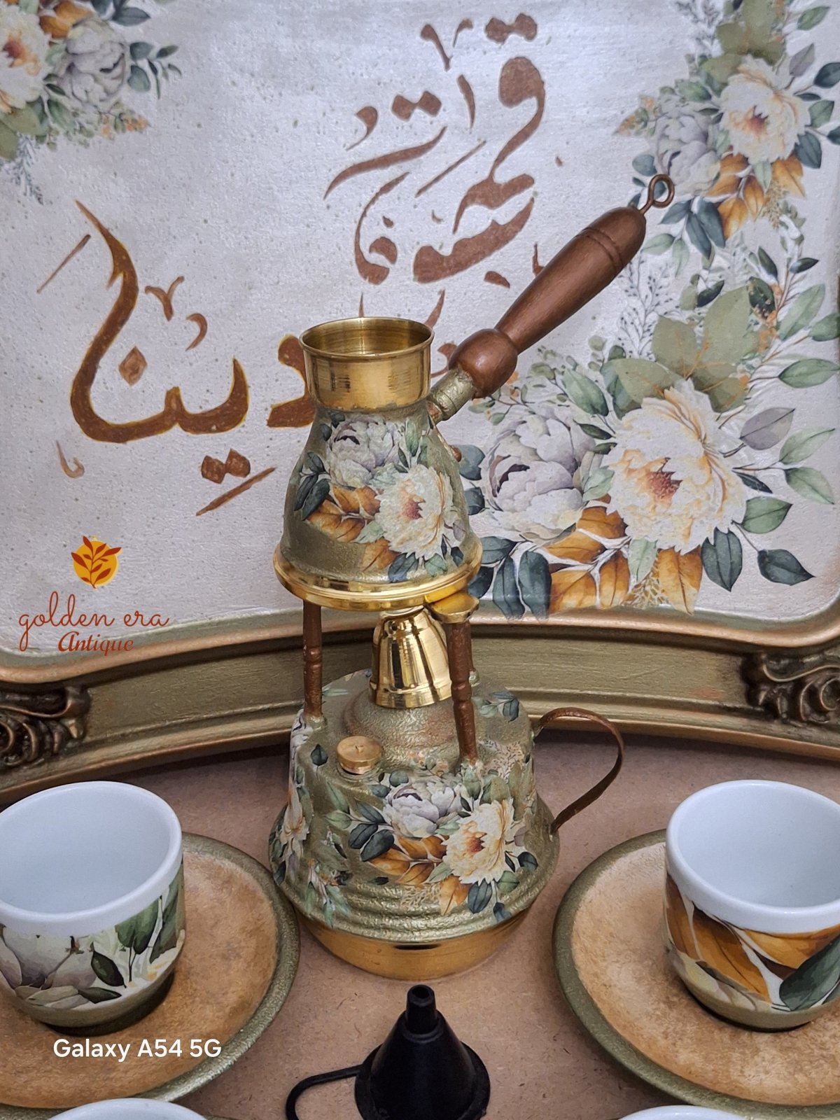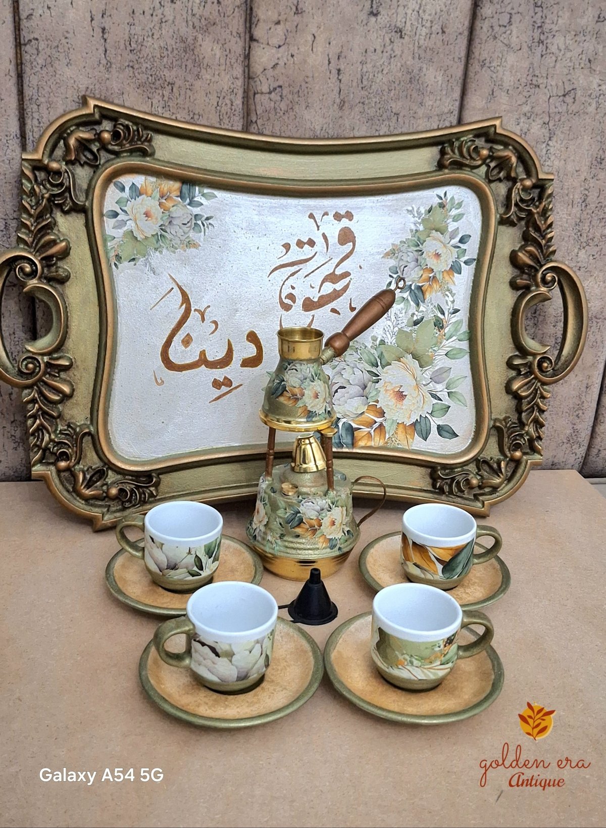 طقم قهوة ملكى لعشاق التميز مكون من صينيه انتيك اويما ٤٠ ×٦٠ سبرتاية نحاس كتكة نحاس عدد ٤ فنجان بورسلين عدد ٤ أطباق بورسلين متاح التنفيذ بأى لون وتغيير عدد الفناجين