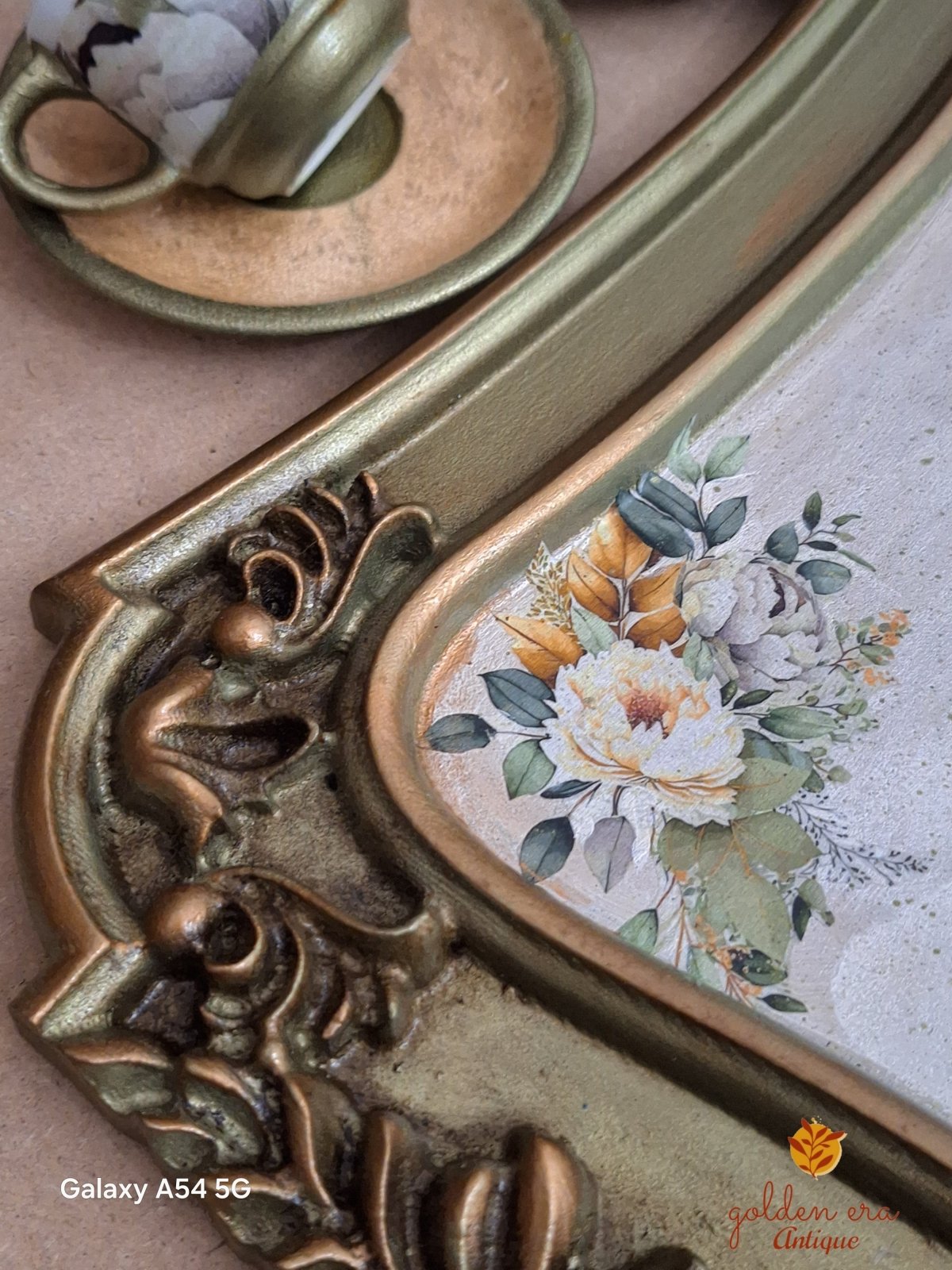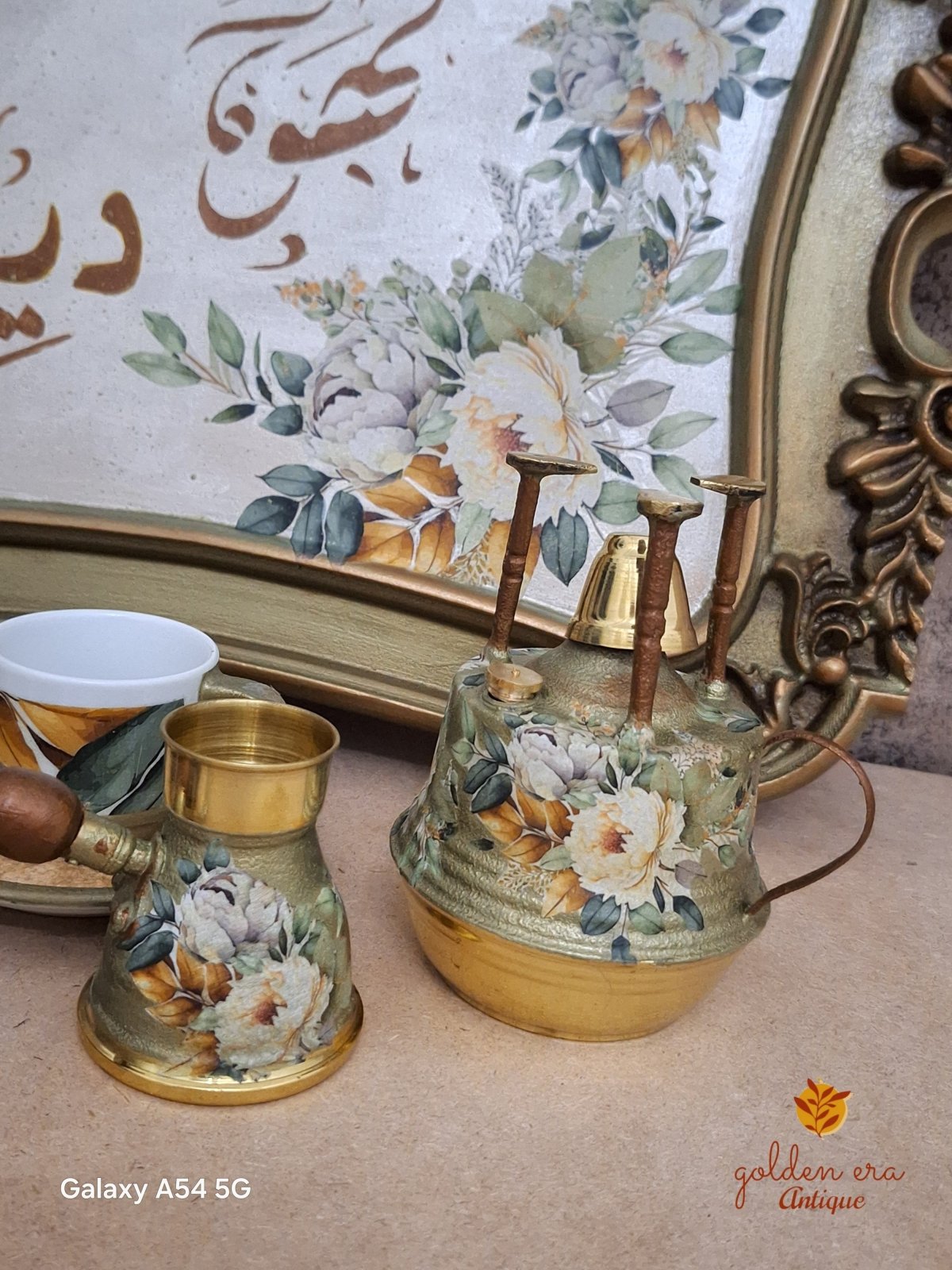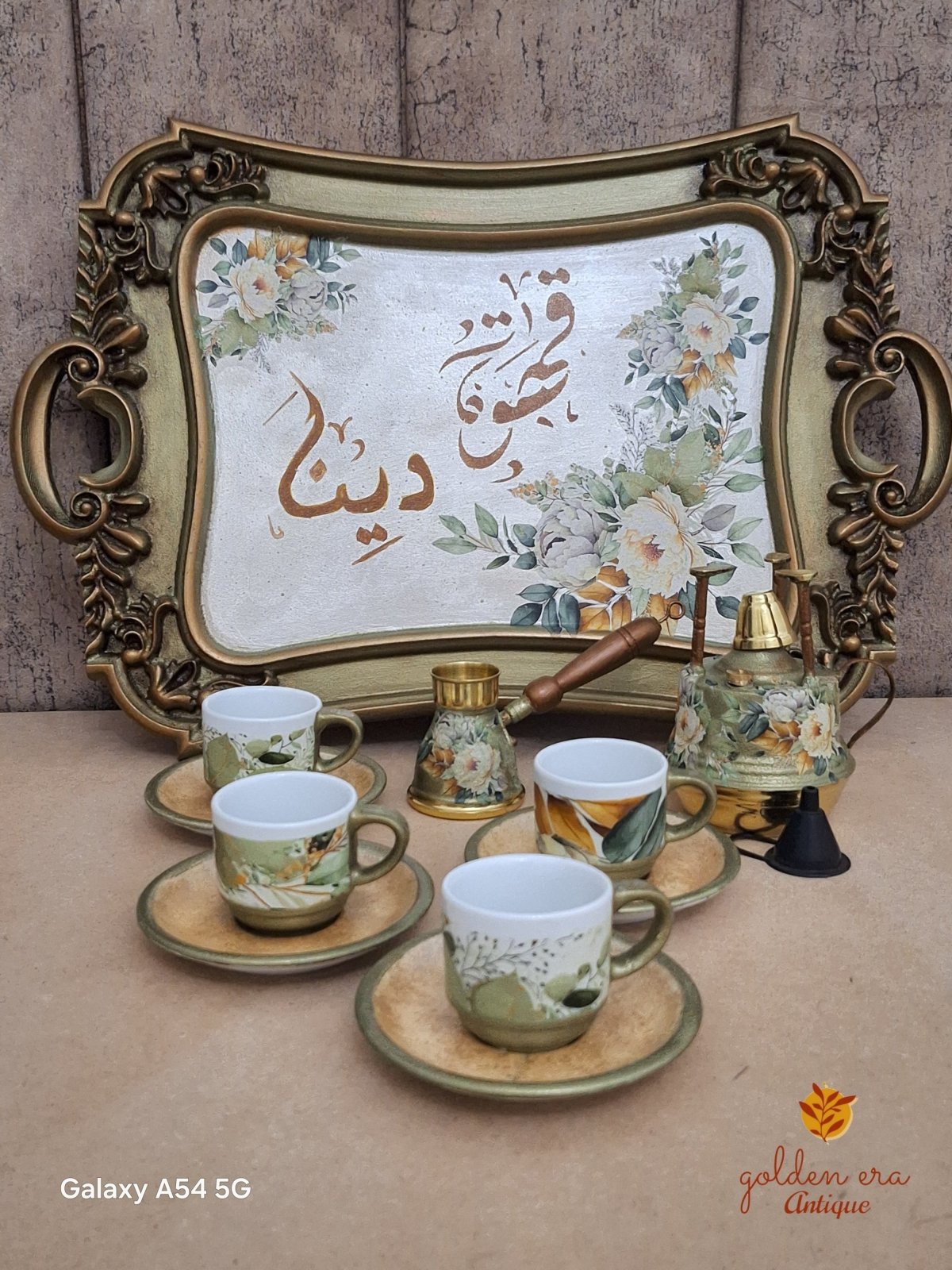 طقم قهوة ملكى لعشاق التميز مكون من صينيه انتيك اويما ٤٠ ×٦٠ سبرتاية نحاس كتكة نحاس عدد ٤ فنجان بورسلين عدد ٤ أطباق بورسلين متاح التنفيذ بأى لون وتغيير عدد الفناجين