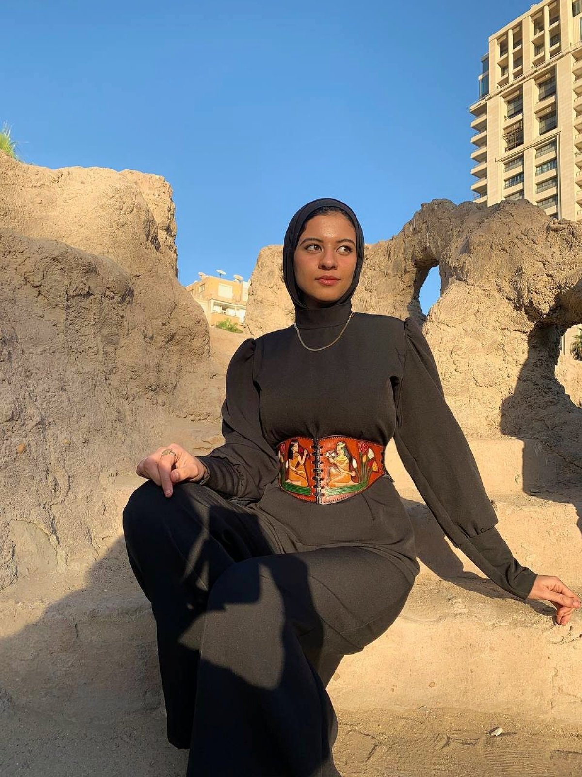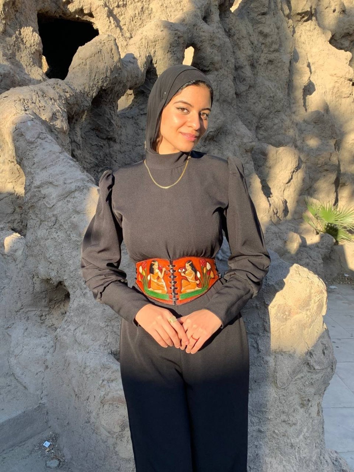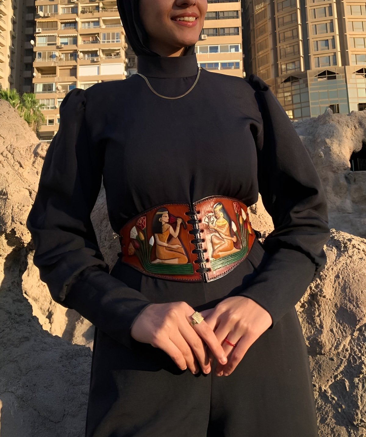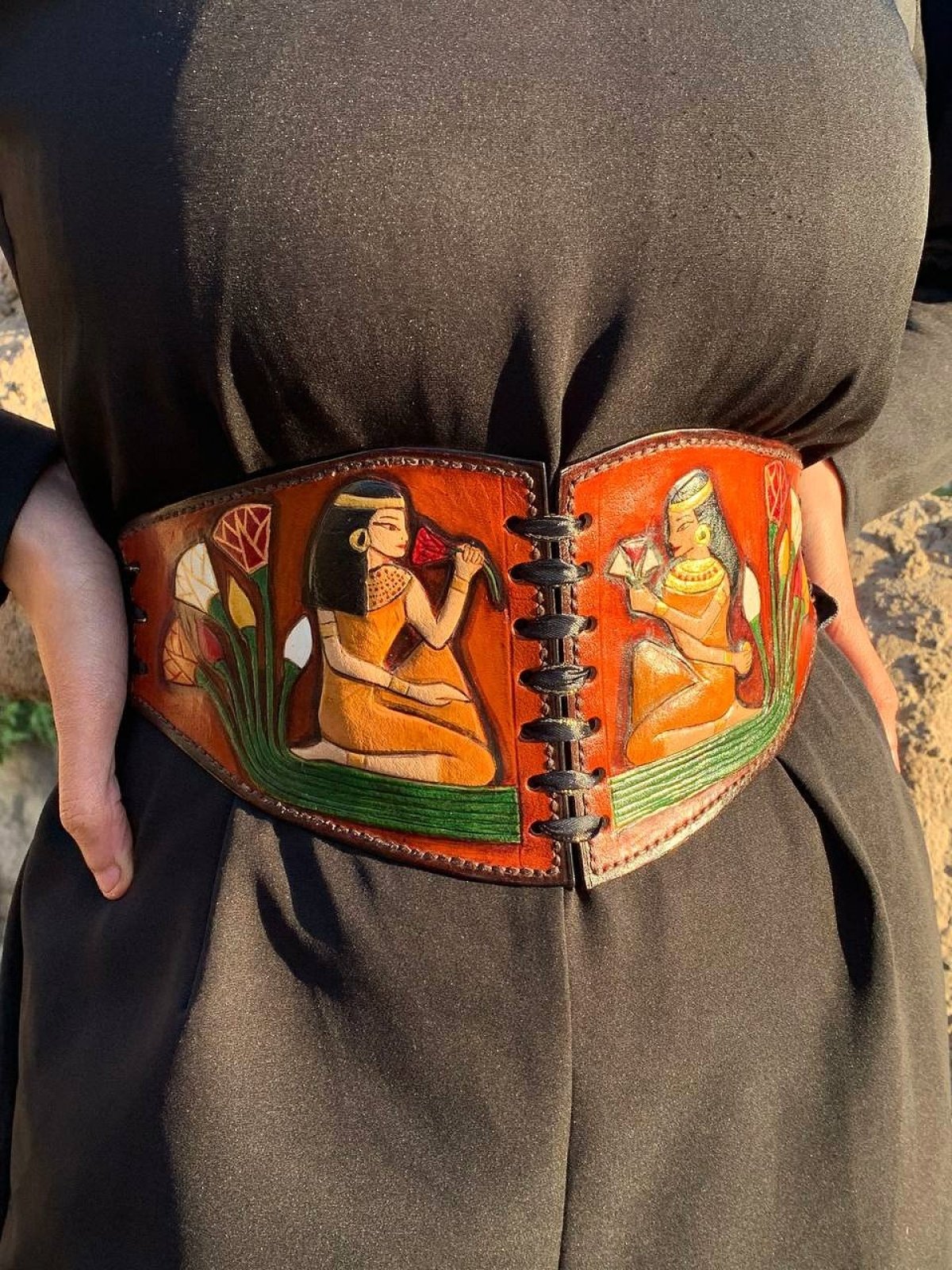 حزام مصري قديم جلد طبيعي هاند ميد بالكامل بطانه جلد طبيعي مستوحي من جداريه حاملات زهور اللوتس 3 قطع معهم شريط ستان للربط بتقنيات الرسم والنحت والتلوين و الدق حزام مصنوع يديويا بالكامل