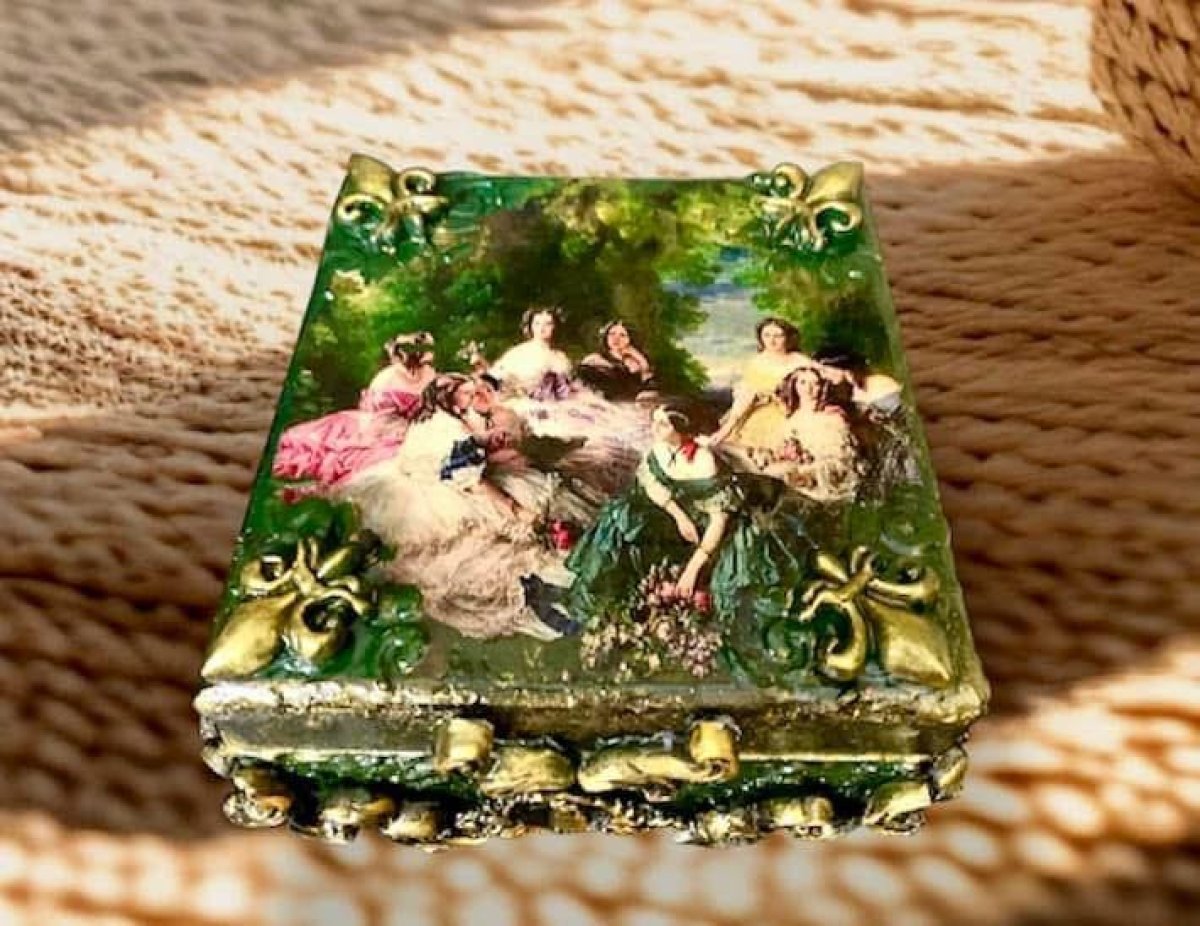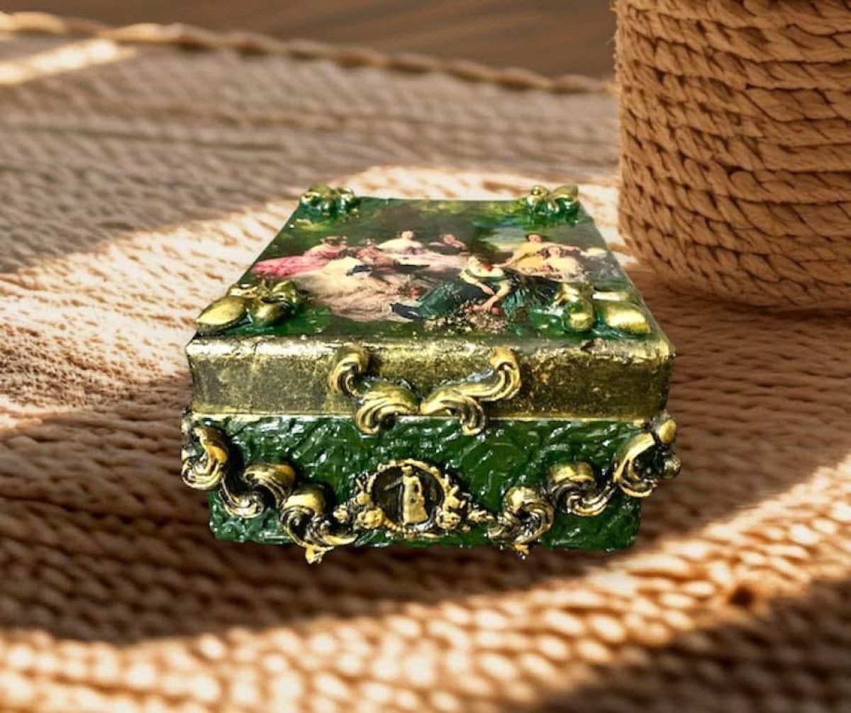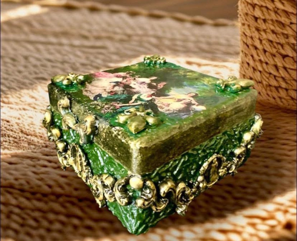ادخل إلى عصر الفخامة مع هذا الصندوق المزخرف المصنوع يدويًا والمستوحى من الطراز العتيق. يتميز هذا الصندوق بزخارف معقدة على الطراز الباروكي ولمسات ذهبية ولوحة رعوية آسرة، وهو ينضح بالفخامة والسحر الخالد. المواد: سيراميك عالي الجودة مع تفاصيل مرسومة يدويًا وإبرازات معدنية التصميم: تصميم مستوحى من الطراز الباروكي يتميز بزخارف مزخرفة وزخارف مذهبة وقطعة مركزية رعوية كلاسيكية الأبعاد: مثالية لتخزين التذكارات أو المجوهرات أو الحلي الصغيرة الغرض: قطعة ديكور مذهلة أو هدية أنيقة لشخص يحب الرقي العتيق يجمع هذا الصندوق الرائع بين الفن والفائدة معًا، مما يجعله عنصرًا حقيقيًا لهواة الجمع.