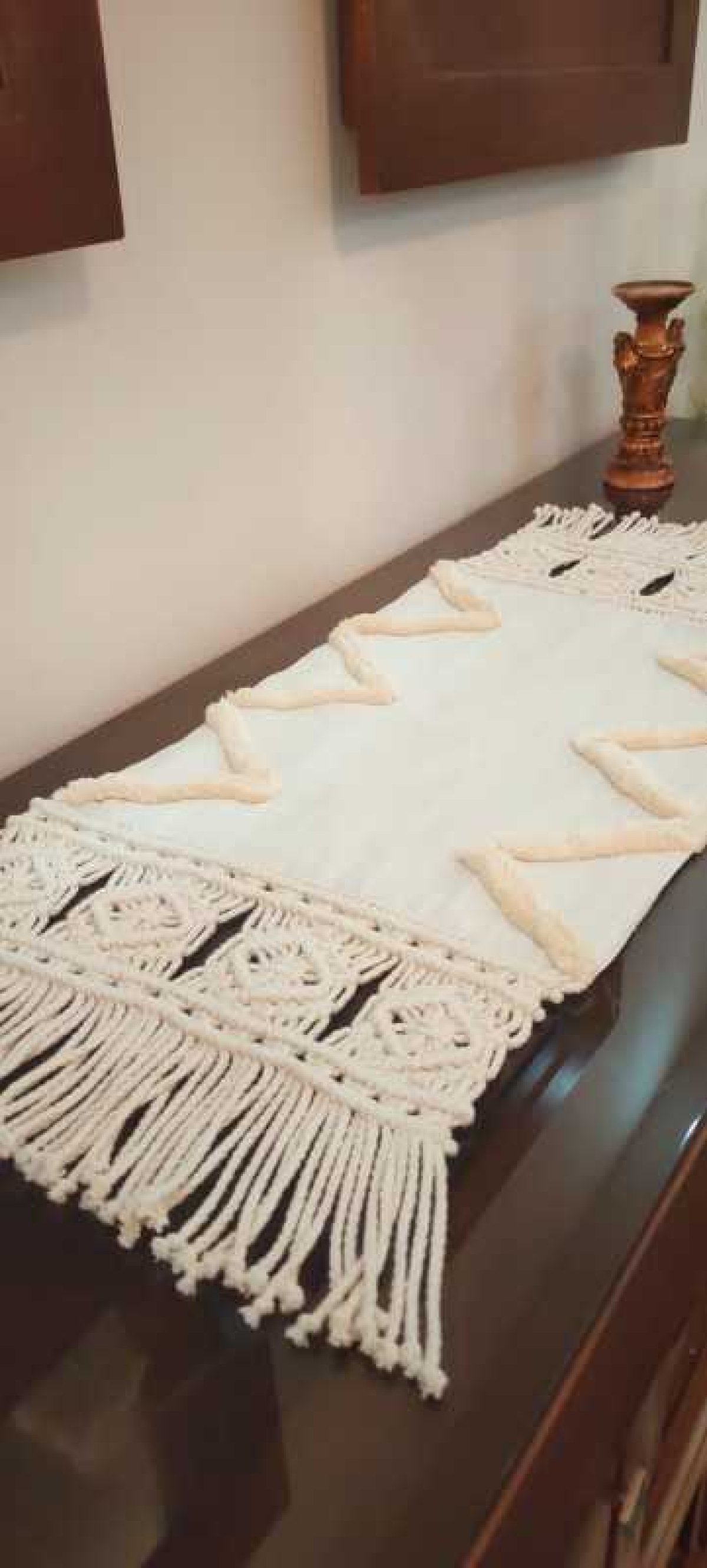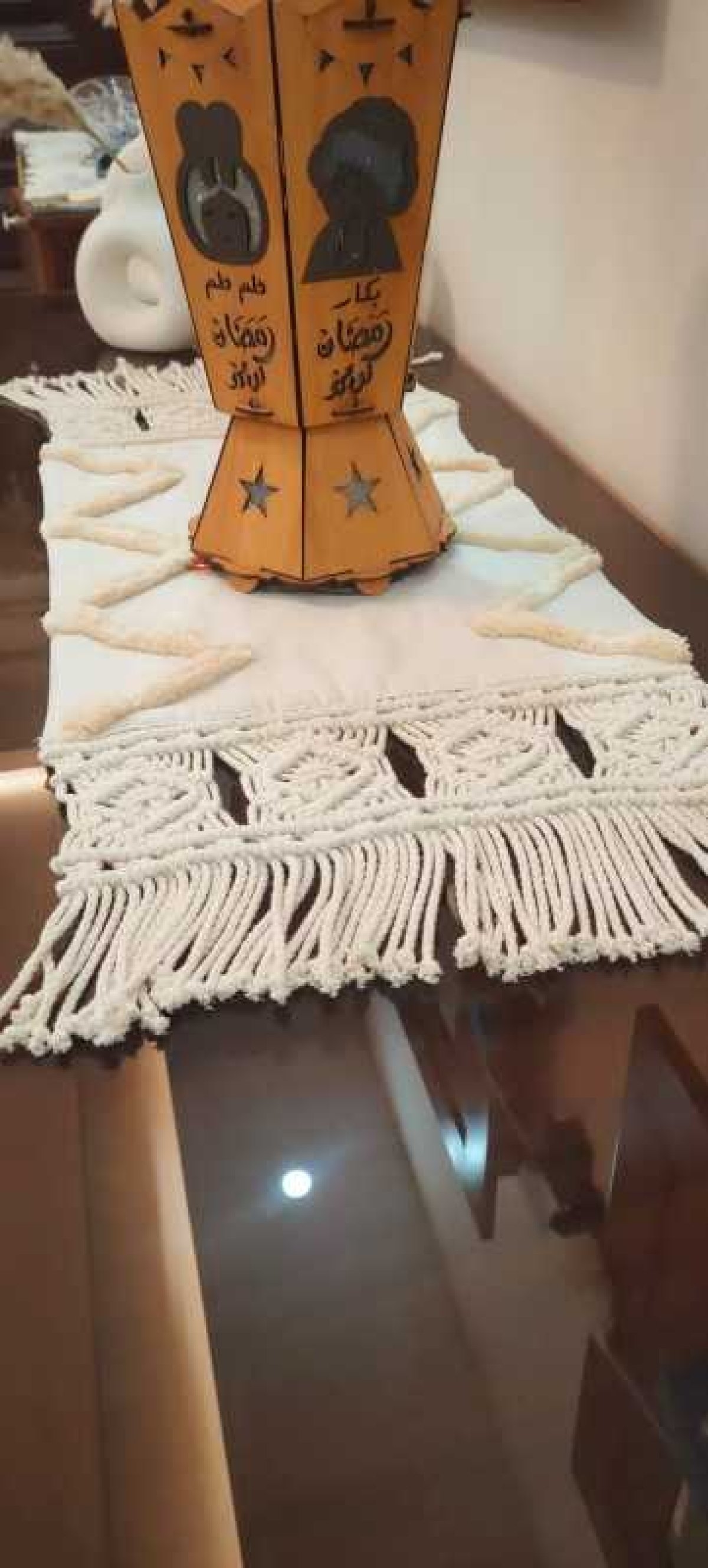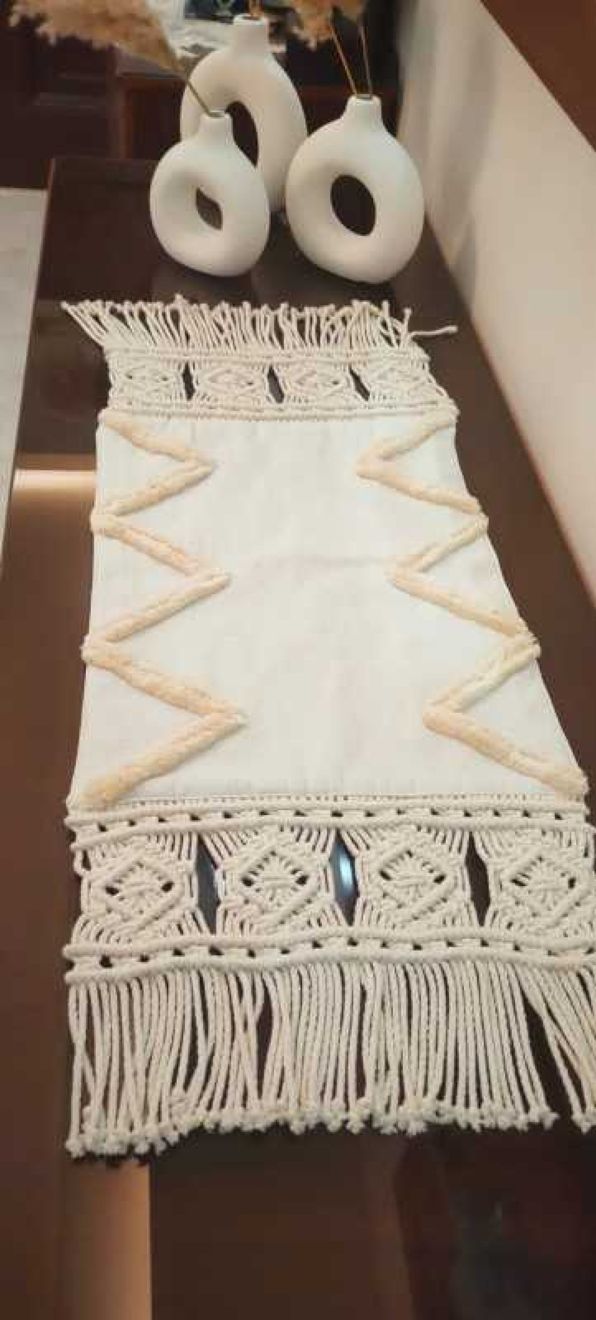 رانر لطاولة صغيره مصنوع من قماش قطني طبقتين (دك) مزين بخيوط قطن علي شكل زجزاج والأطراف بعقد المكرمية عرض ٤٠ سم تقريبا في طول ١٢٠ سم تقريباً