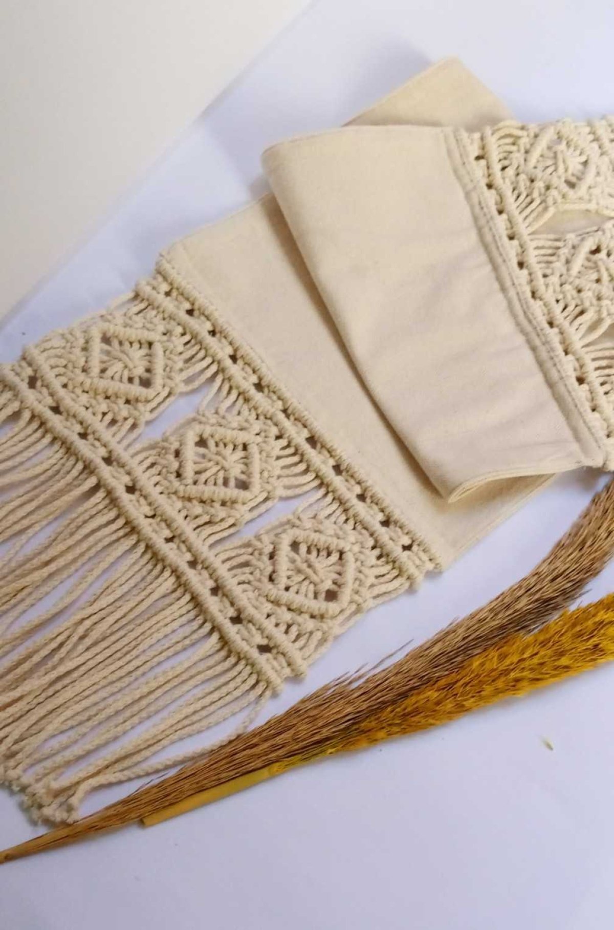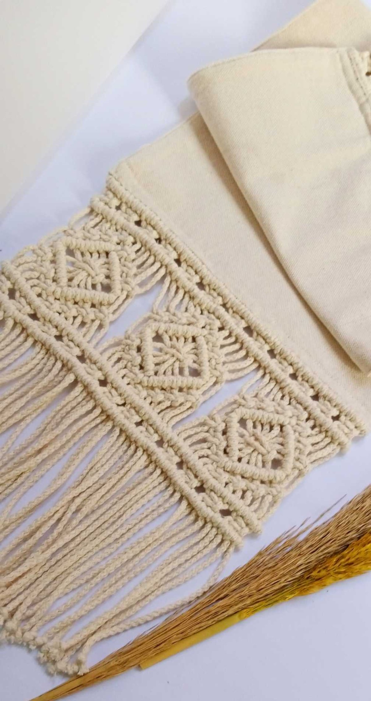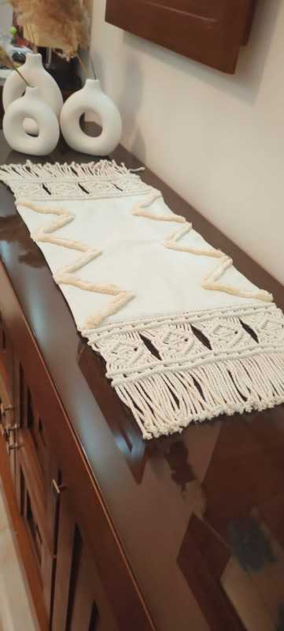 رانر لطاولة صغيره مصنوع من قماش قطني طبقتين (دك) مزين بخيوط قطن علي شكل زجزاج والأطراف بعقد المكرمية عرض ٤٠ سم تقريبا في طول ١٢٠ سم تقريباً