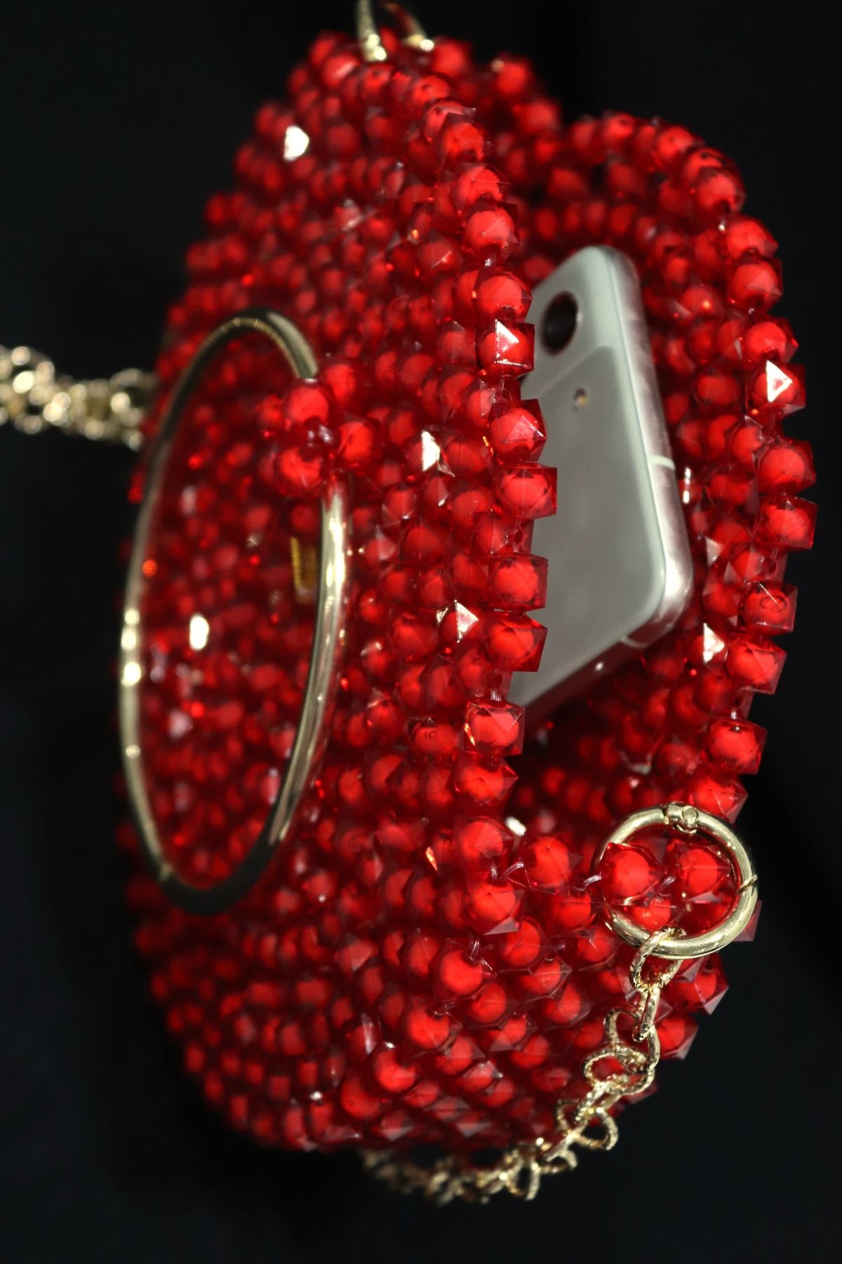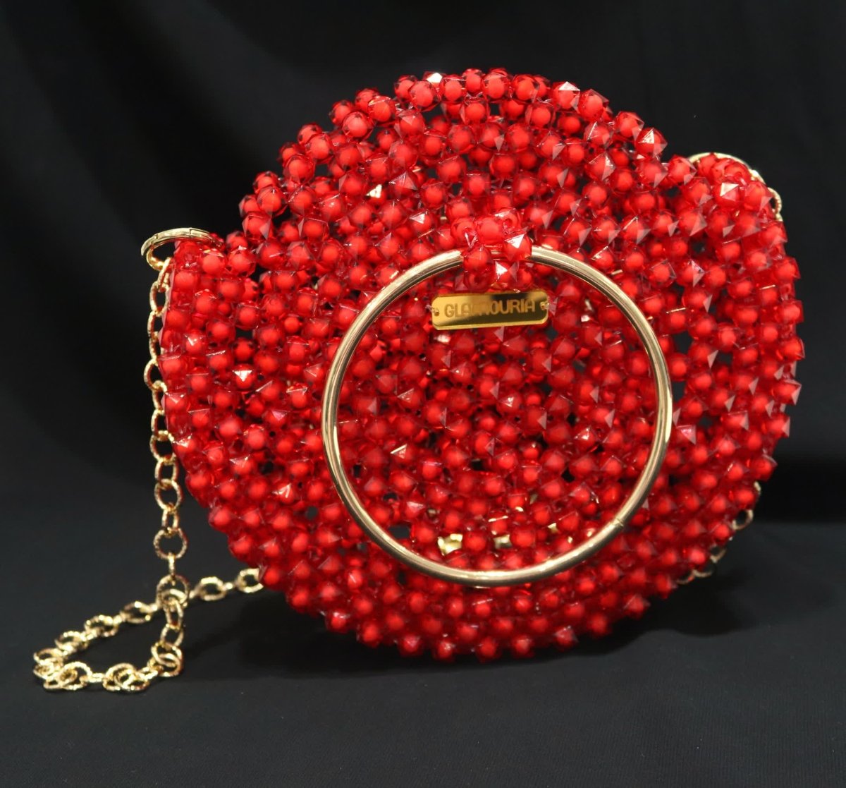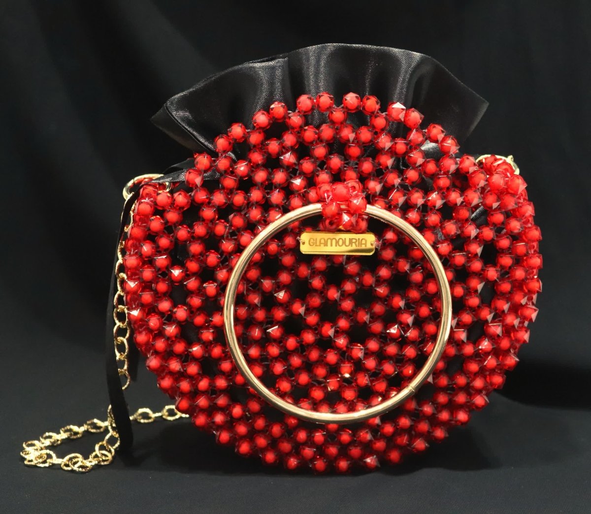 شنطة دائرية بمقبض يد معدني ذهبي ويد طويلة كروس ذهبي مقاس مناسب جداً يدخل فيه الهاتف ومحفظة وعنصر آخر مرفقة ببطانة متحركة سوداء ساتان