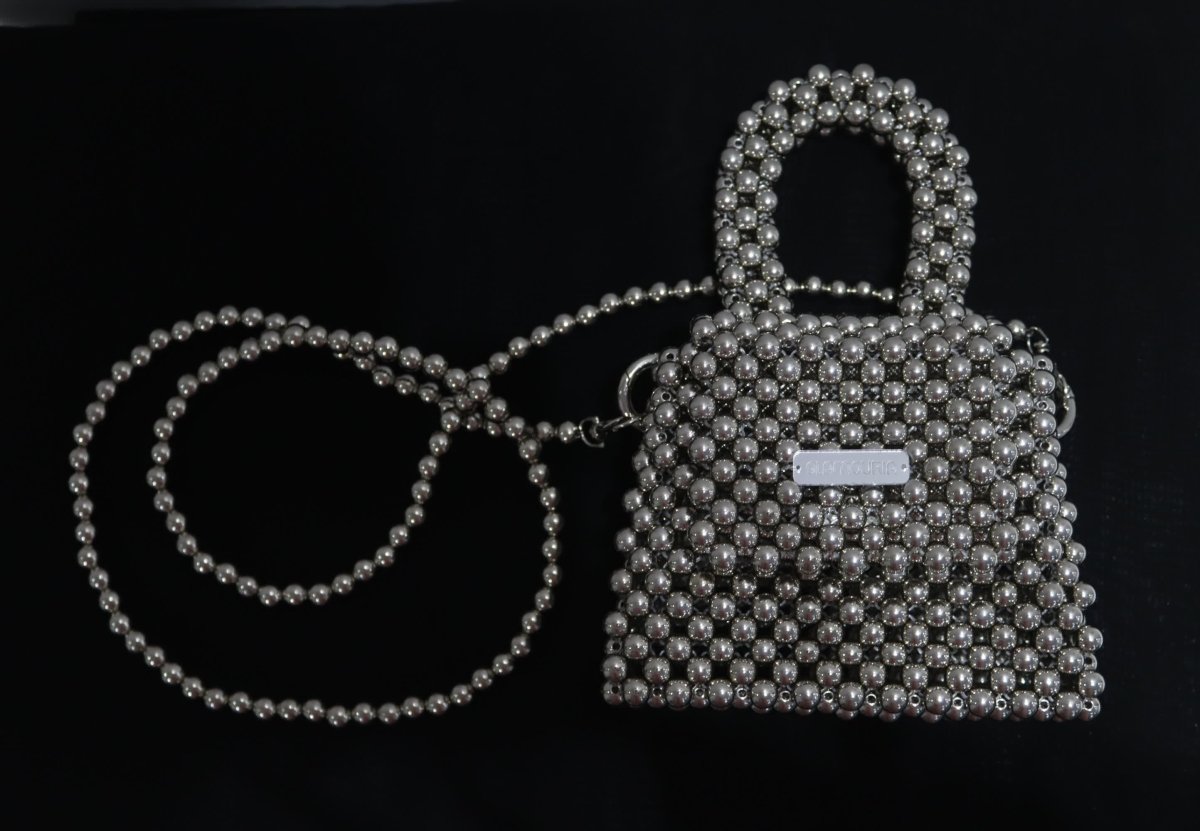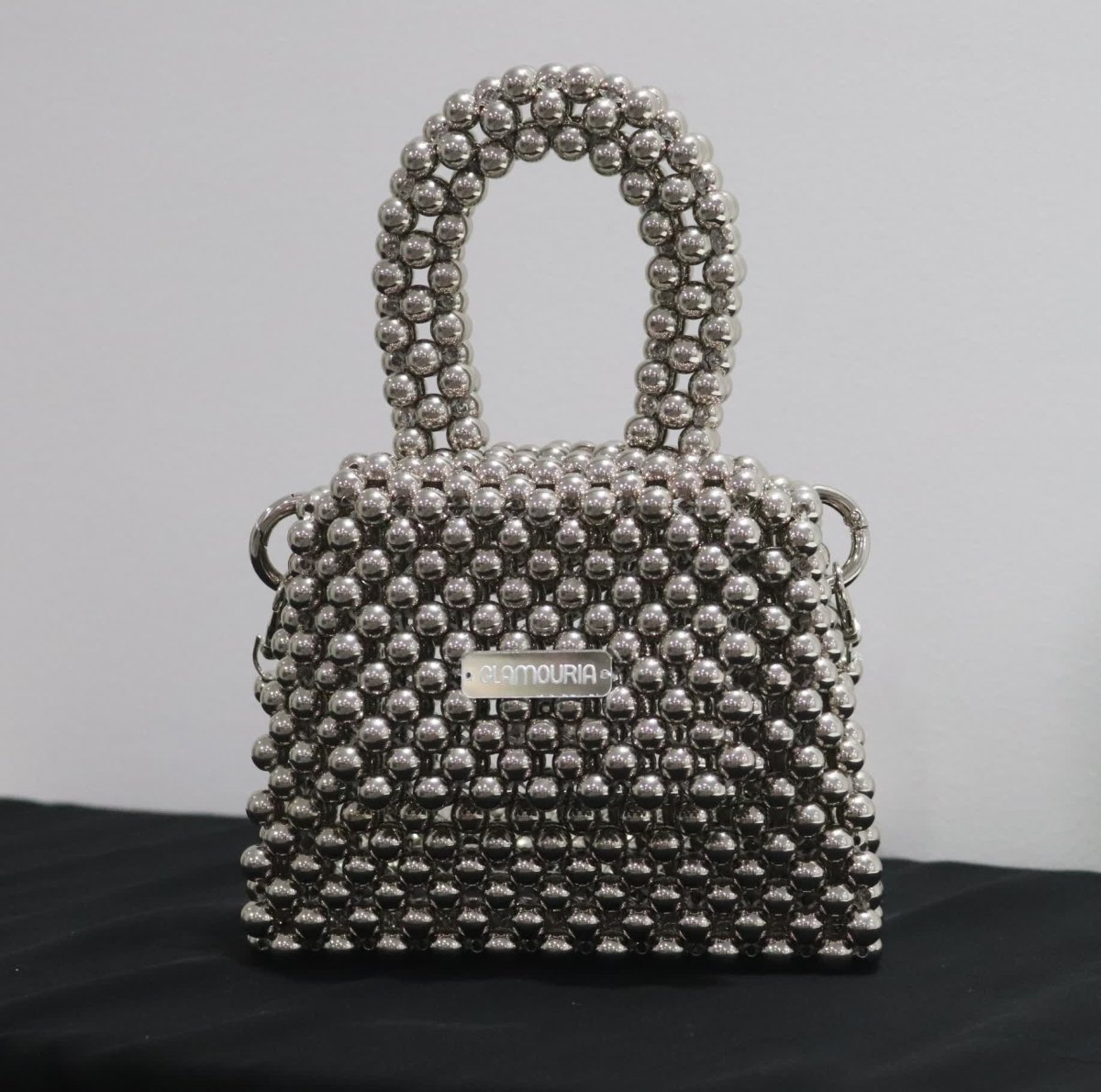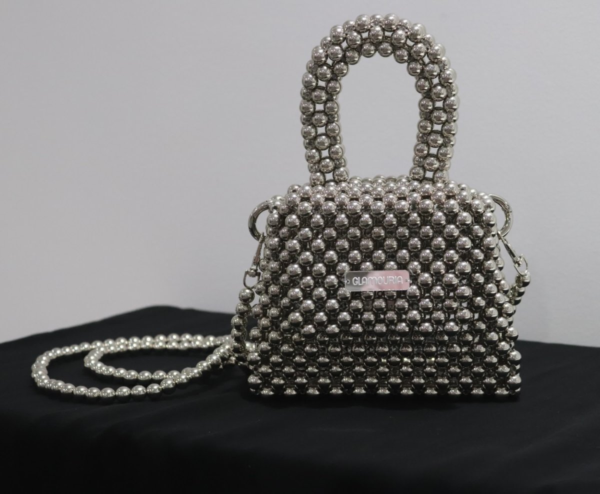 شنطة من اللؤلؤ الفضي حجم صغير لا يحمل تليفون مقاس : 14سم×13سم مرفق بيد كروس طويلة من اللؤلؤ الفضي وبها يد ثابتة