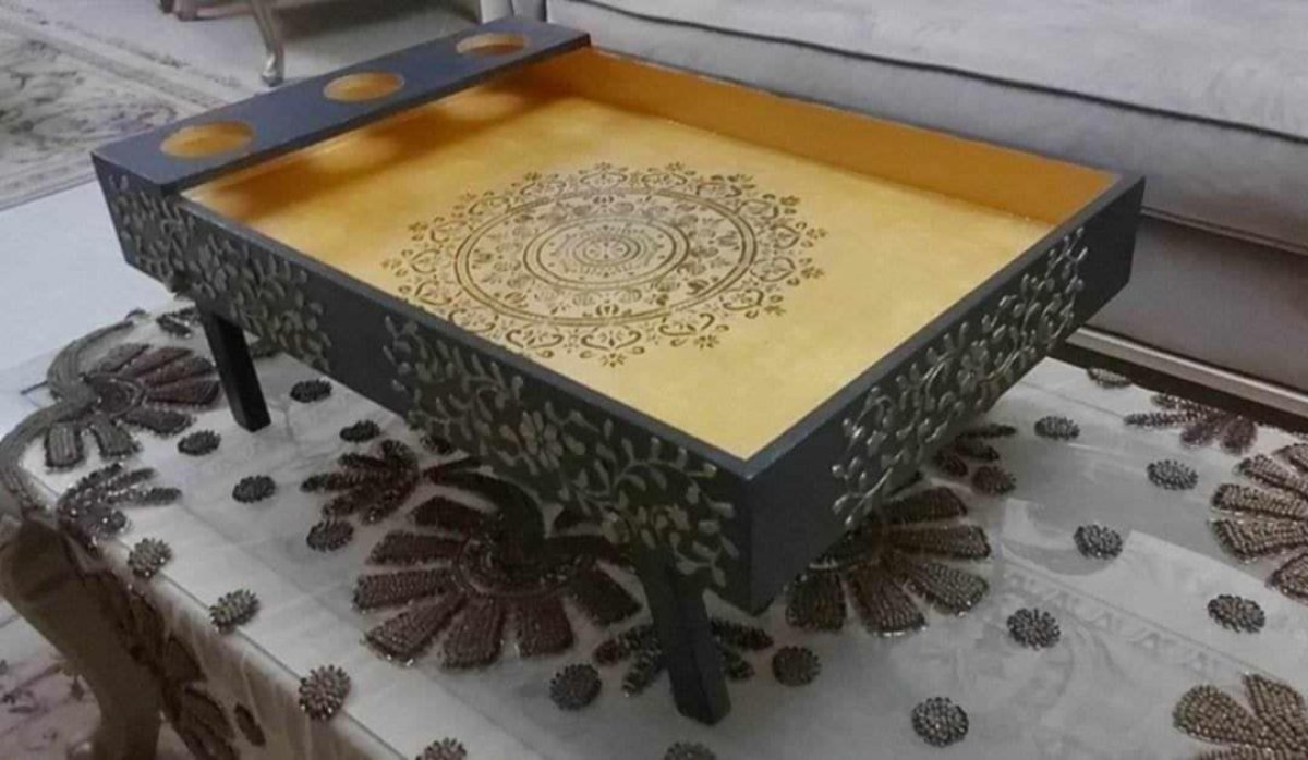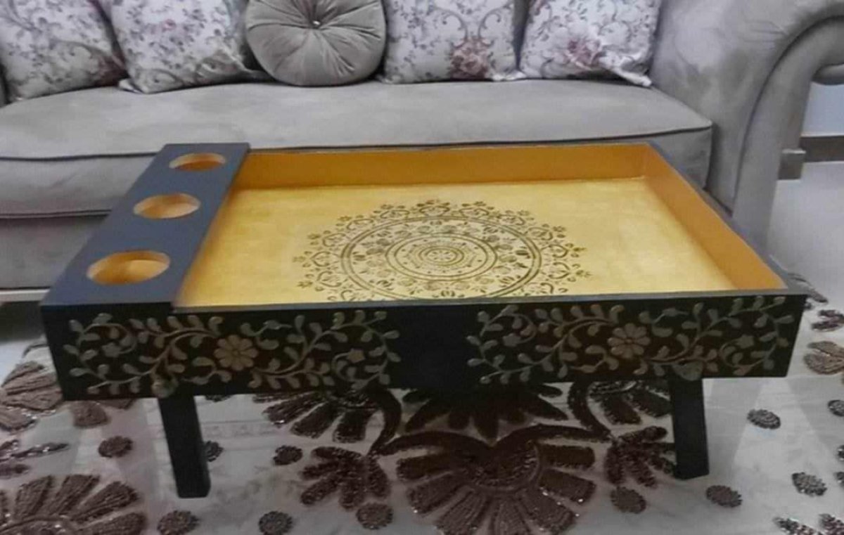 صنيه خشب للسرير هاند ميد بشغل بارز و٣ عيون للاكواب ٤٠ ×٦٠ وارتفاع ١٠ سم والارجل بتطوى يمكن استخدامها صنيه عاديه مقاس كبير
