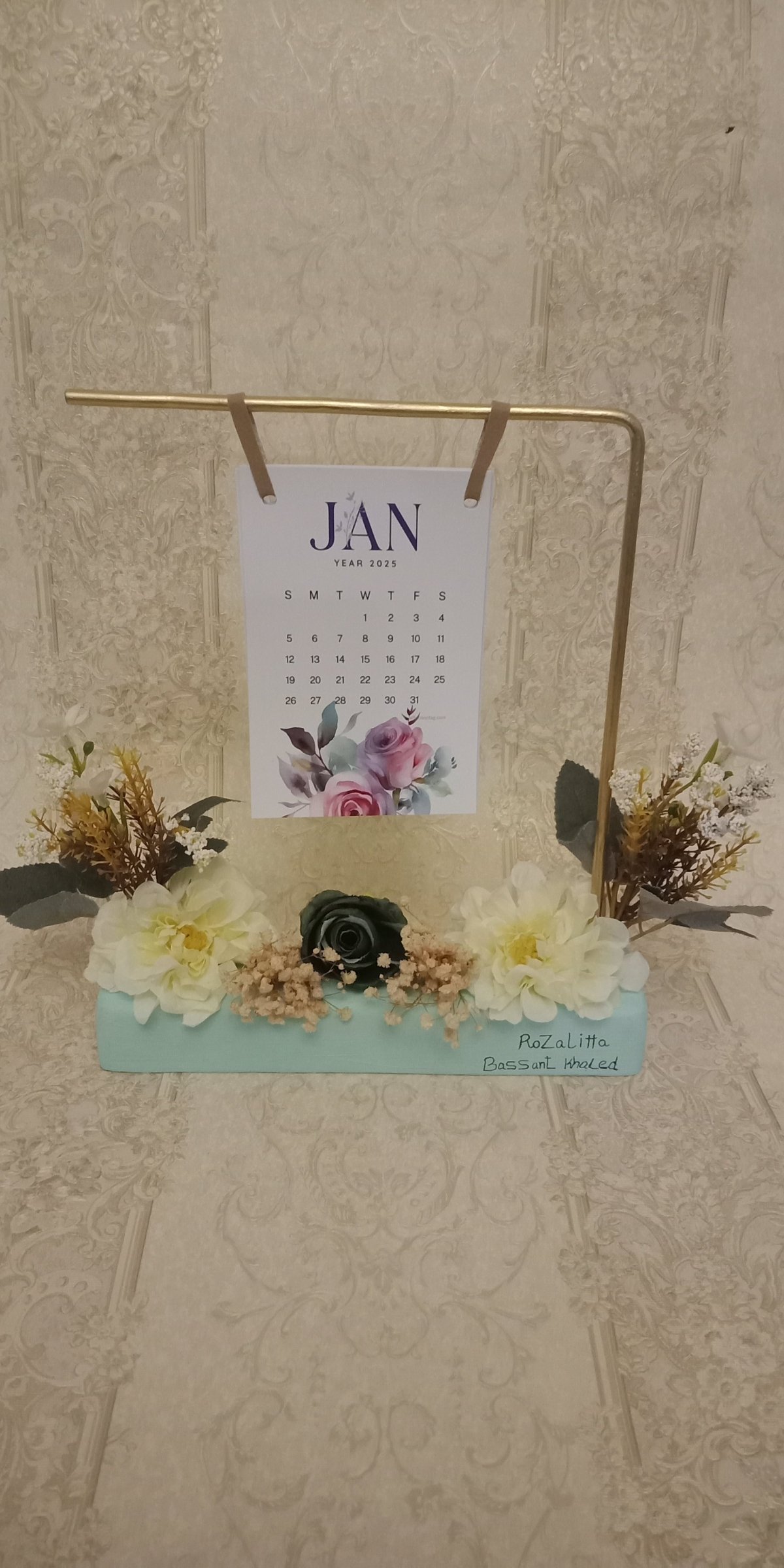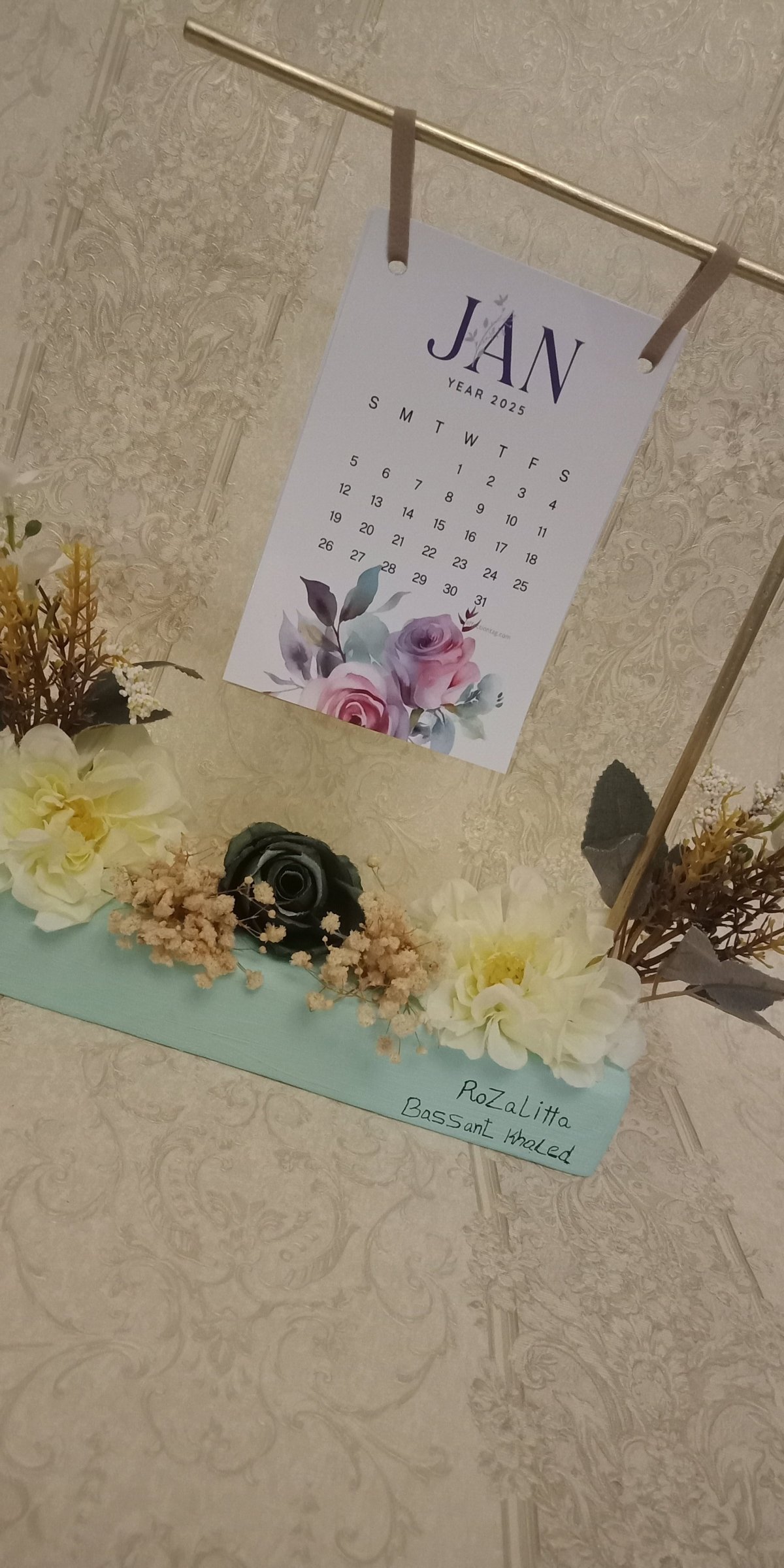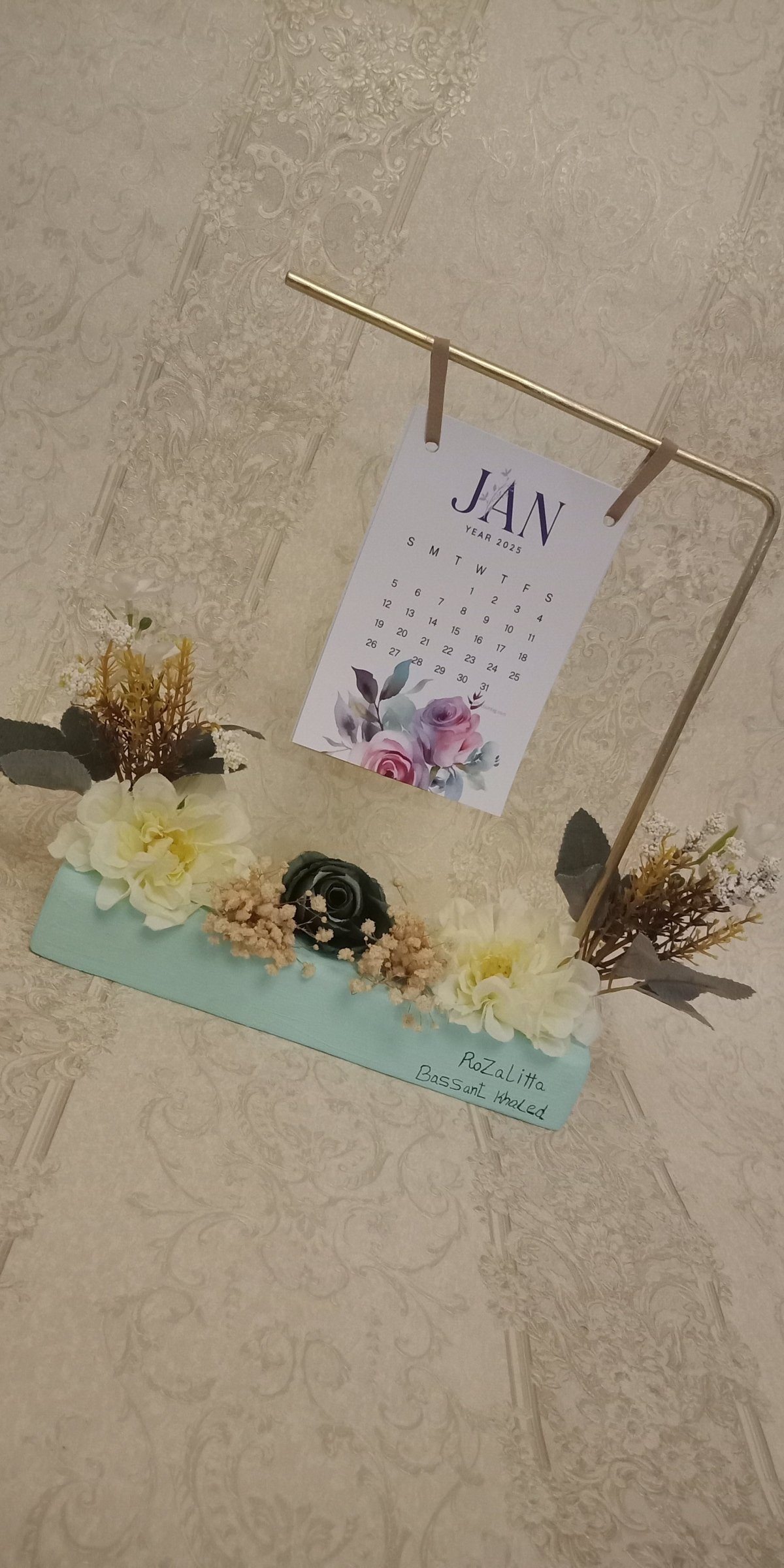 ستاند مكتب تقويم عام 2025 مقاسات 25*25*22.5 . القاعدة مصنوعه من الخشب والحامل من المعدن مه ورد صناعي *متاح تغير الوان الورد