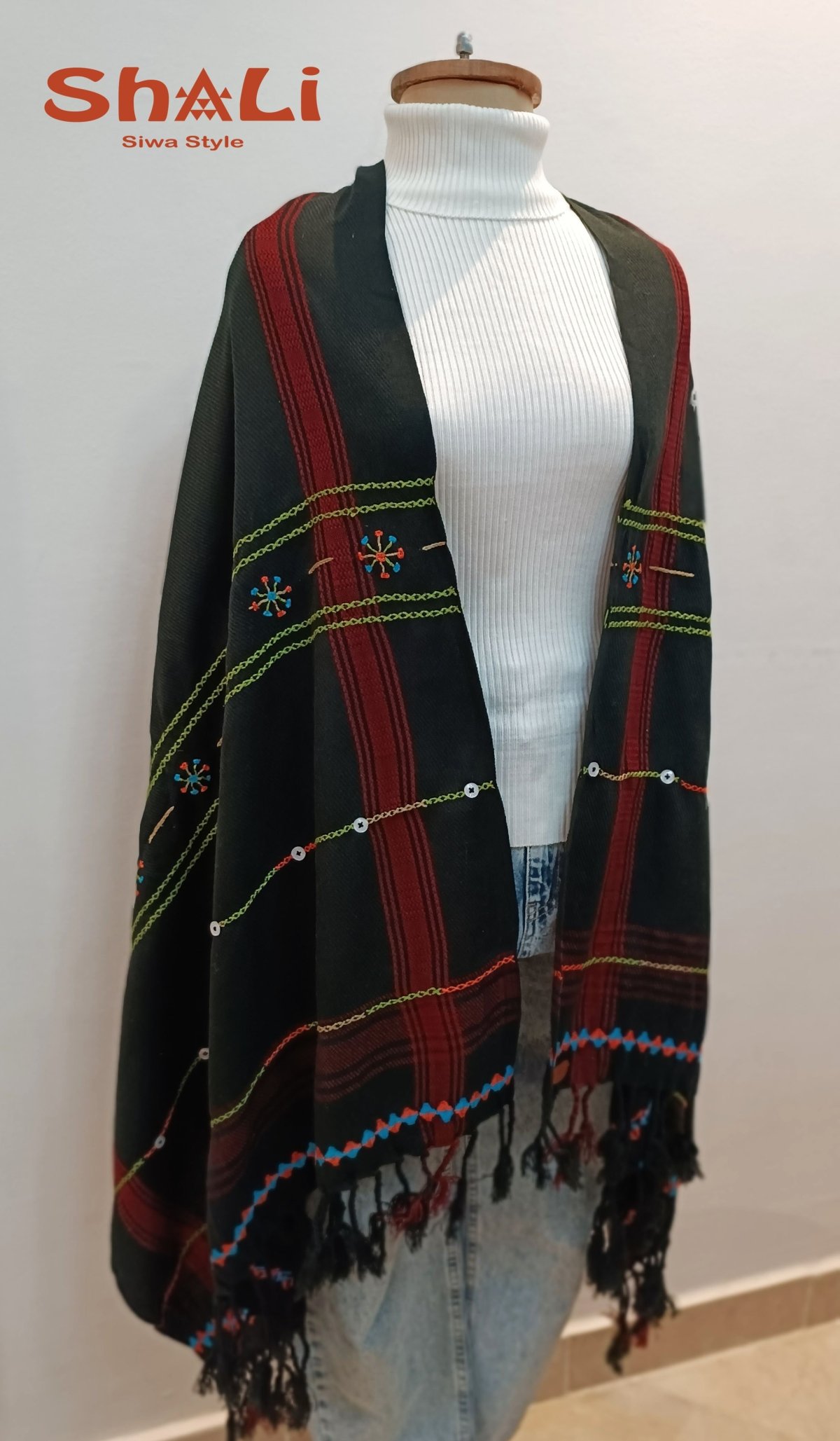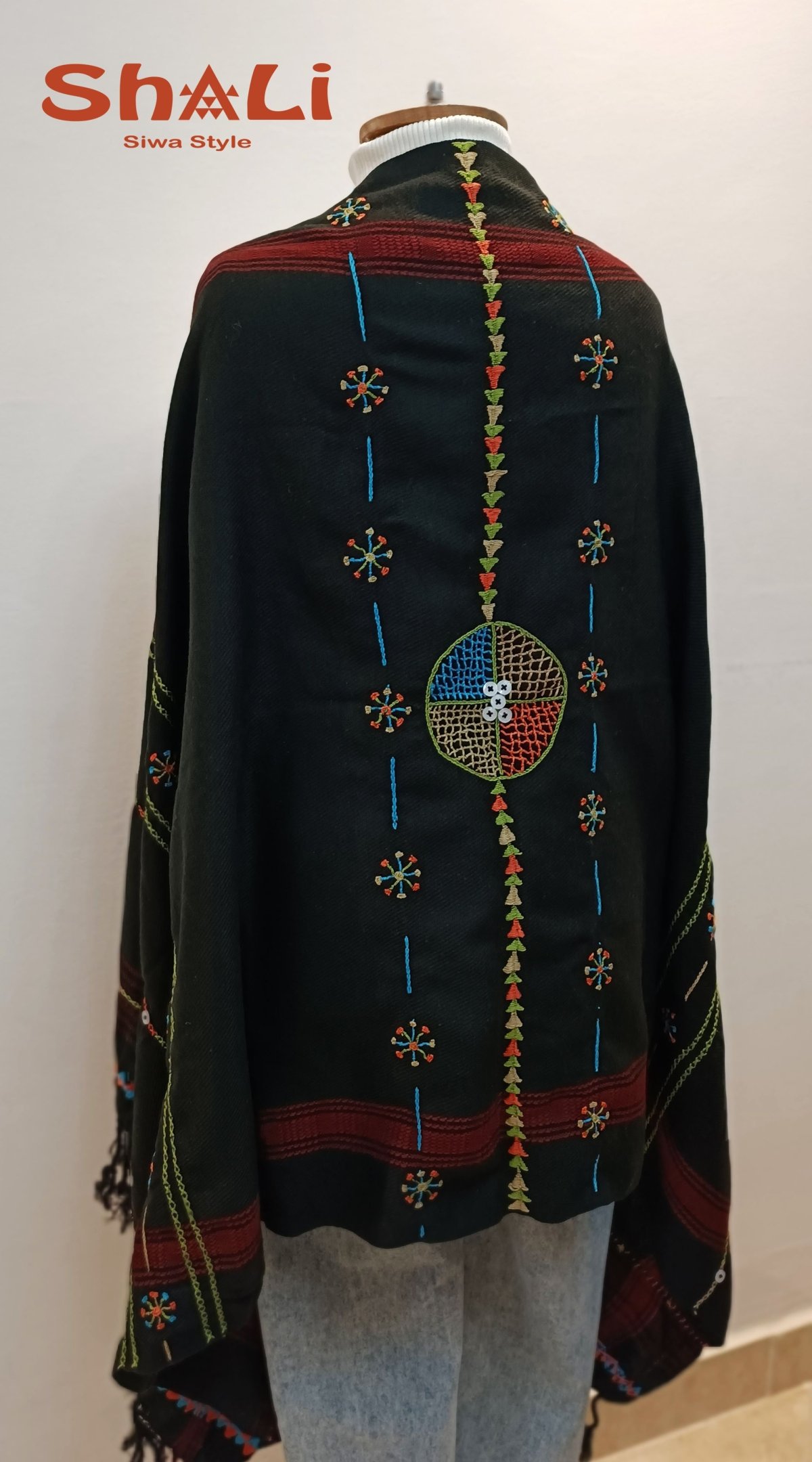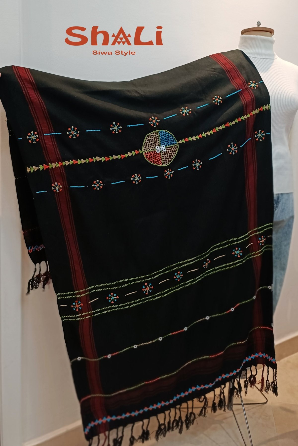 شال صوف خفيف مطرز يدويًا من سيدات واحة سيوة الموهوبات المقاس: ٢٠٠*٩٠ سم - زخارف تقليدية من تراث سيوة بتصميم جديد بخيوط ثابتة وألوان مميزة. - يُنظف تنظيفًا جافًا أو يُغسل يدويًا بدون مبيض. - يُكوى على درجة حرارة منخفضة.