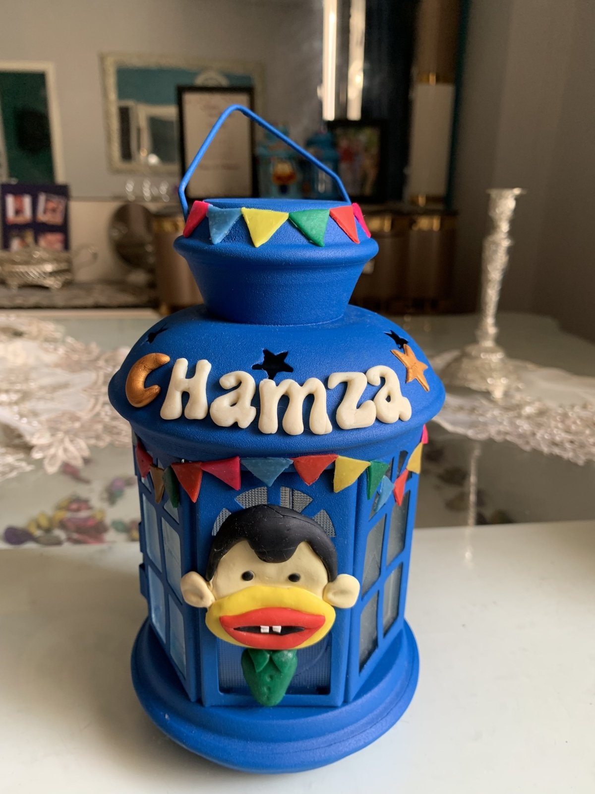 فانوس معدن عليه اشكال من الصلصال حراري طوله 22 سم ابواب ازاز