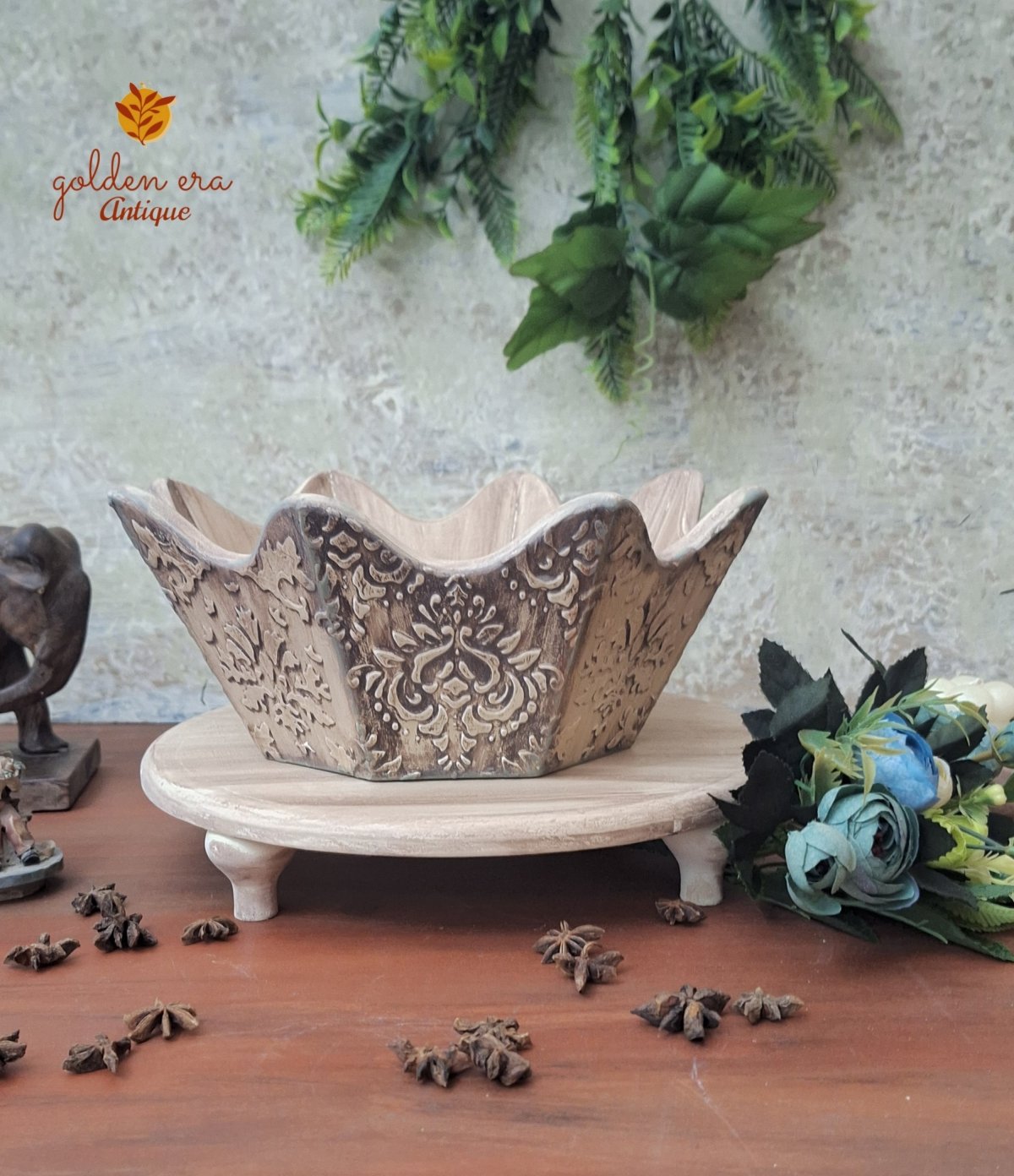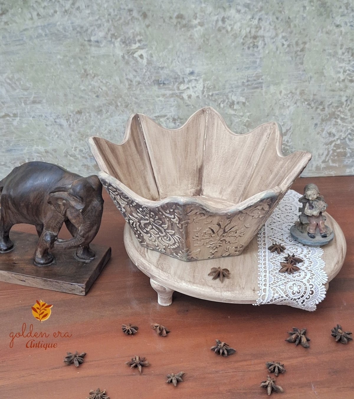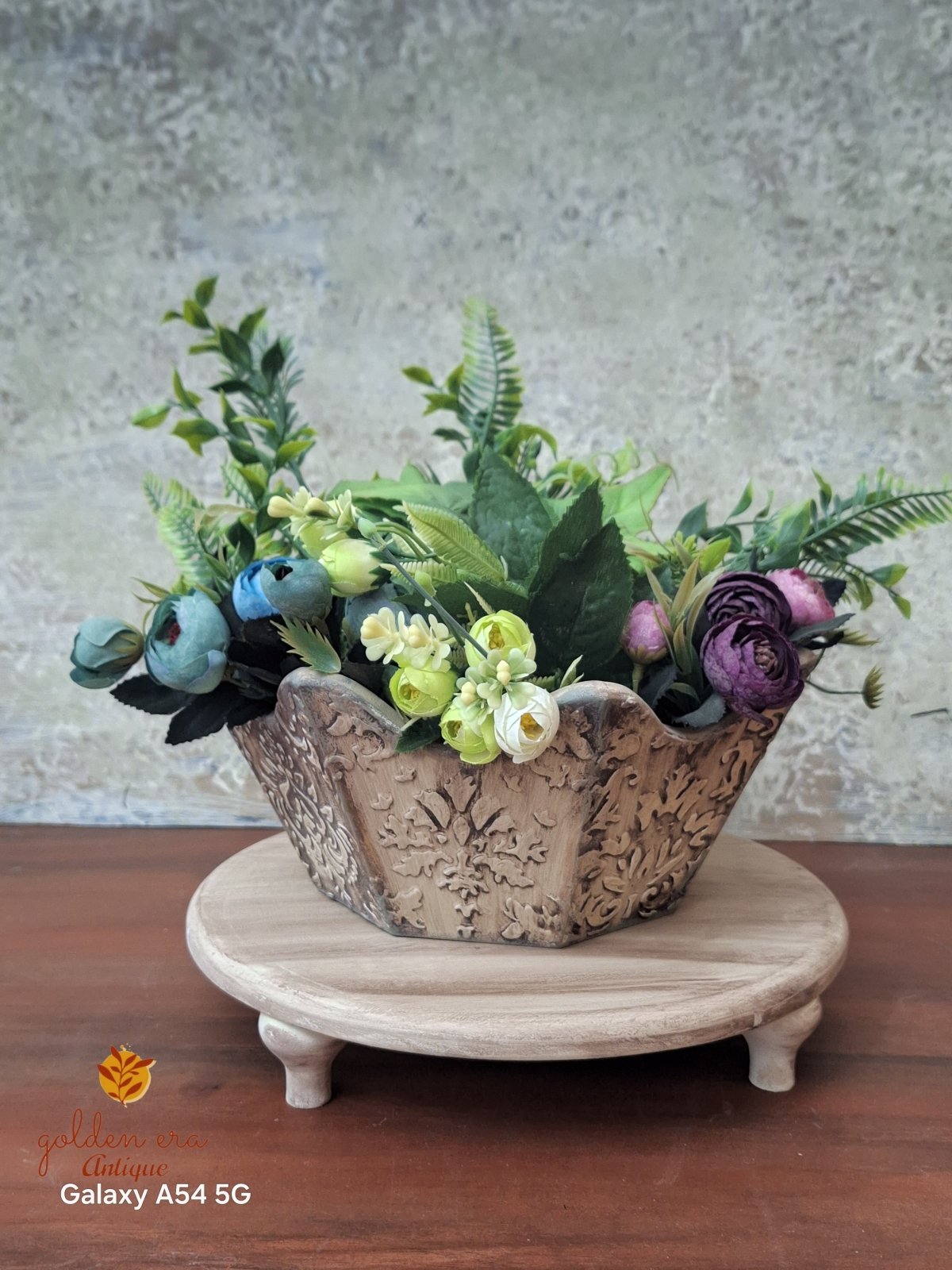 قطعه ديكوريه Center piece عبارة عن صينيه دائرية قطر ٣٠ سم و جاردنيير ثمانيه الأضلاع القاعدة عرض ١٦ سم ارتفاع ١٣ سم الفتحه العلويه عرض ٣٠ سم باللون البيج والاستايل Vintage يمكن استخدامها بعده أشكال