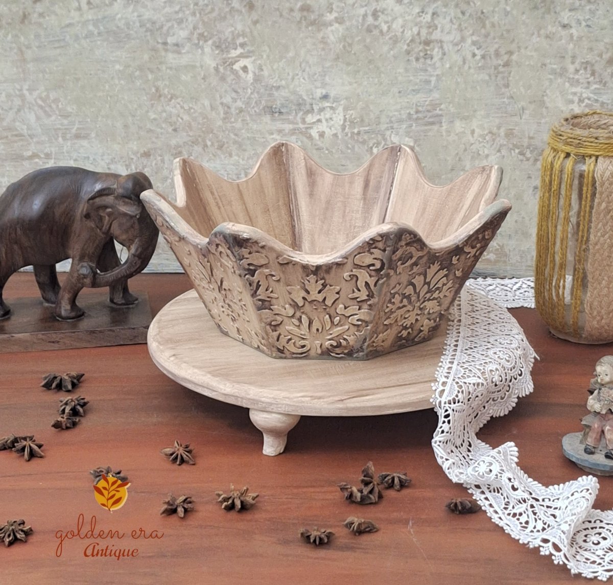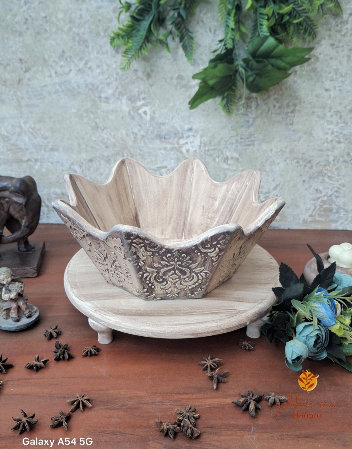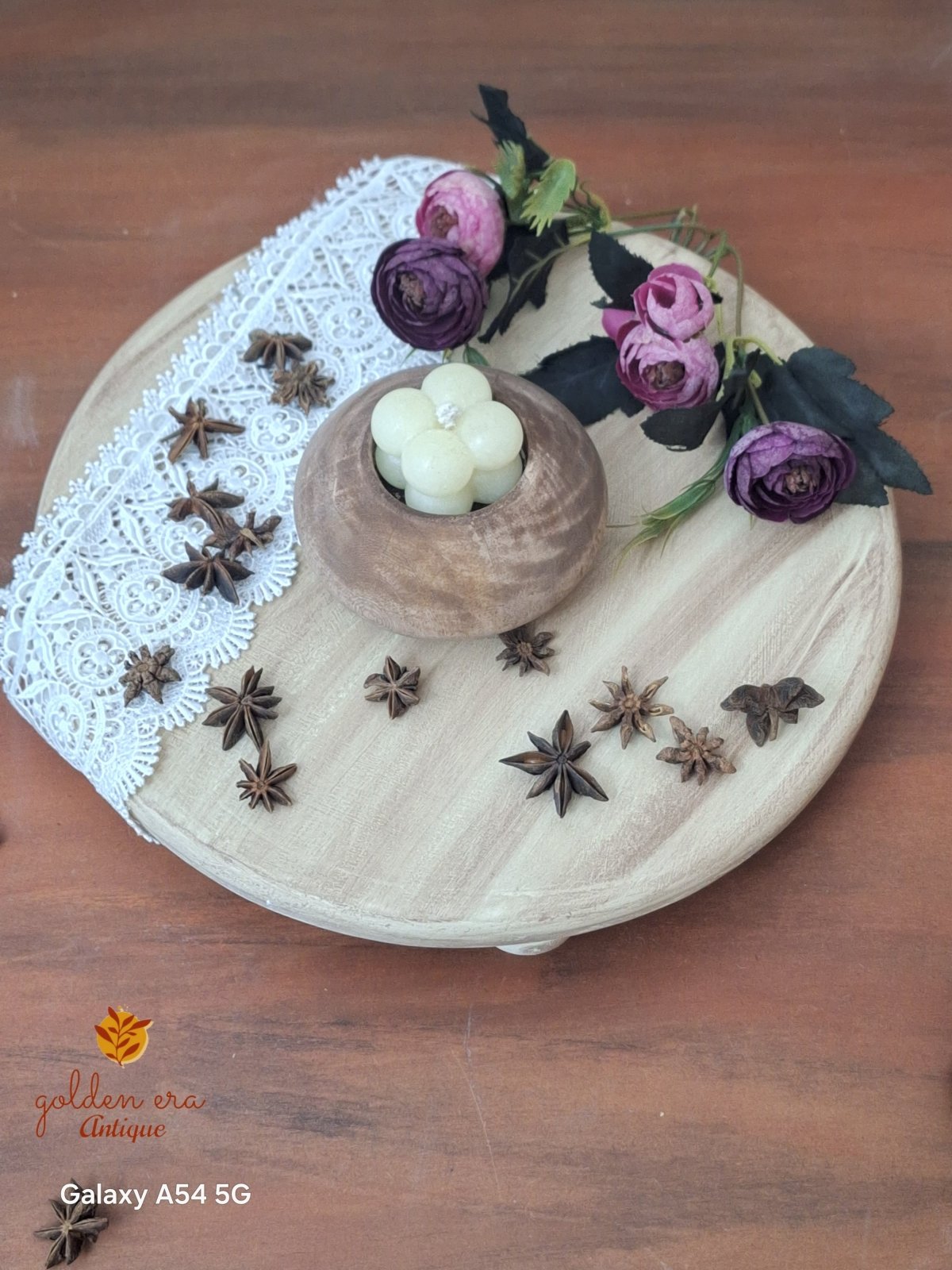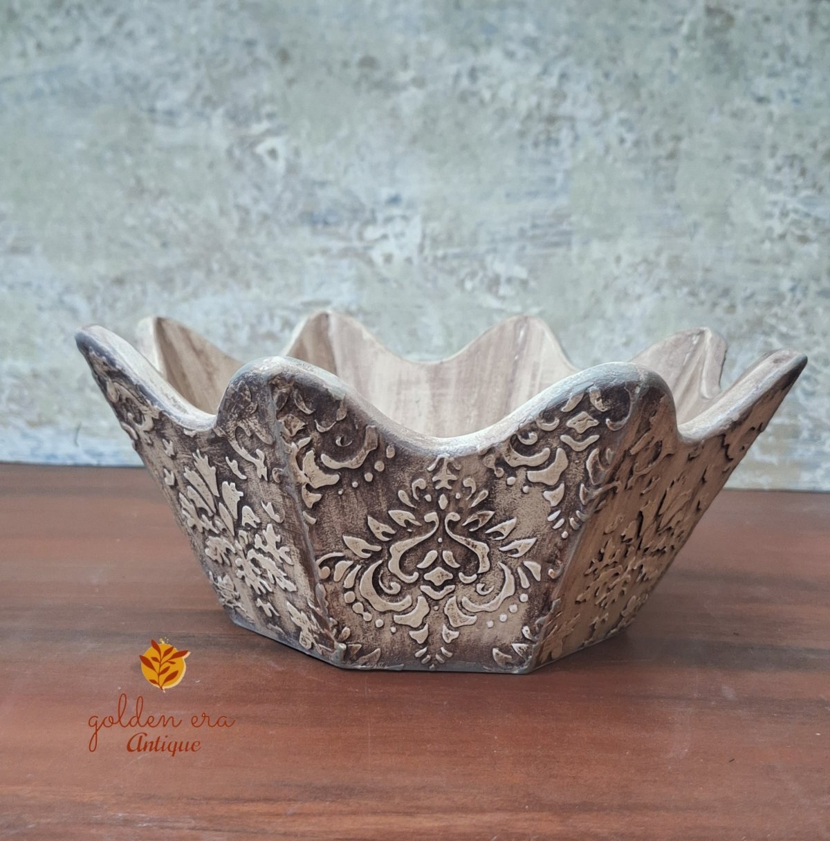 قطعه ديكوريه Center piece عبارة عن صينيه دائرية قطر ٣٠ سم و جاردنيير ثمانيه الأضلاع القاعدة عرض ١٦ سم ارتفاع ١٣ سم الفتحه العلويه عرض ٣٠ سم باللون البيج والاستايل Vintage يمكن استخدامها بعده أشكال