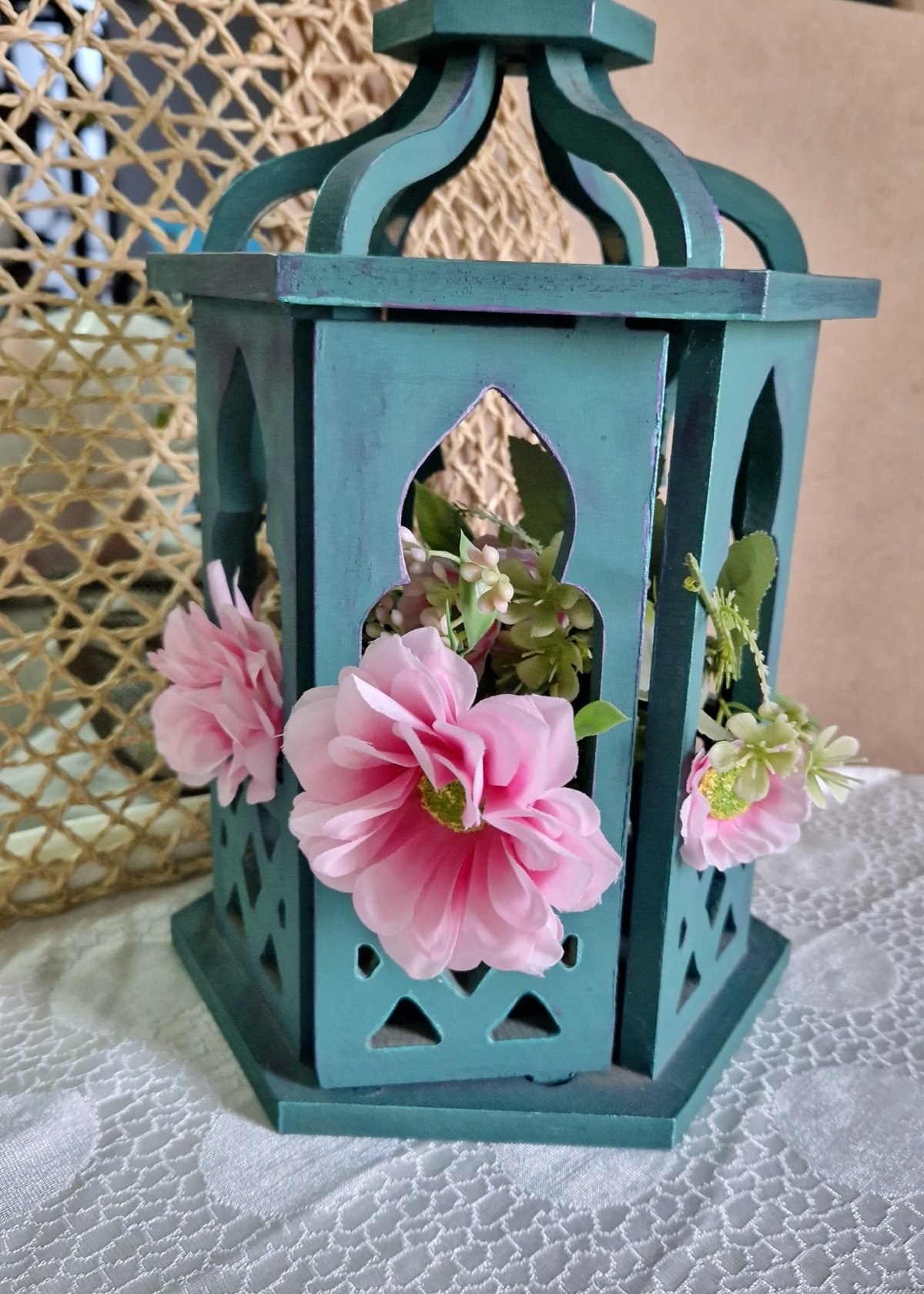فانوس رمضان أخضر بألوان بنفسجي مع الورود💜💚💜 ارتفاعه ٣٣ سم وعرضه ٢٠ سم