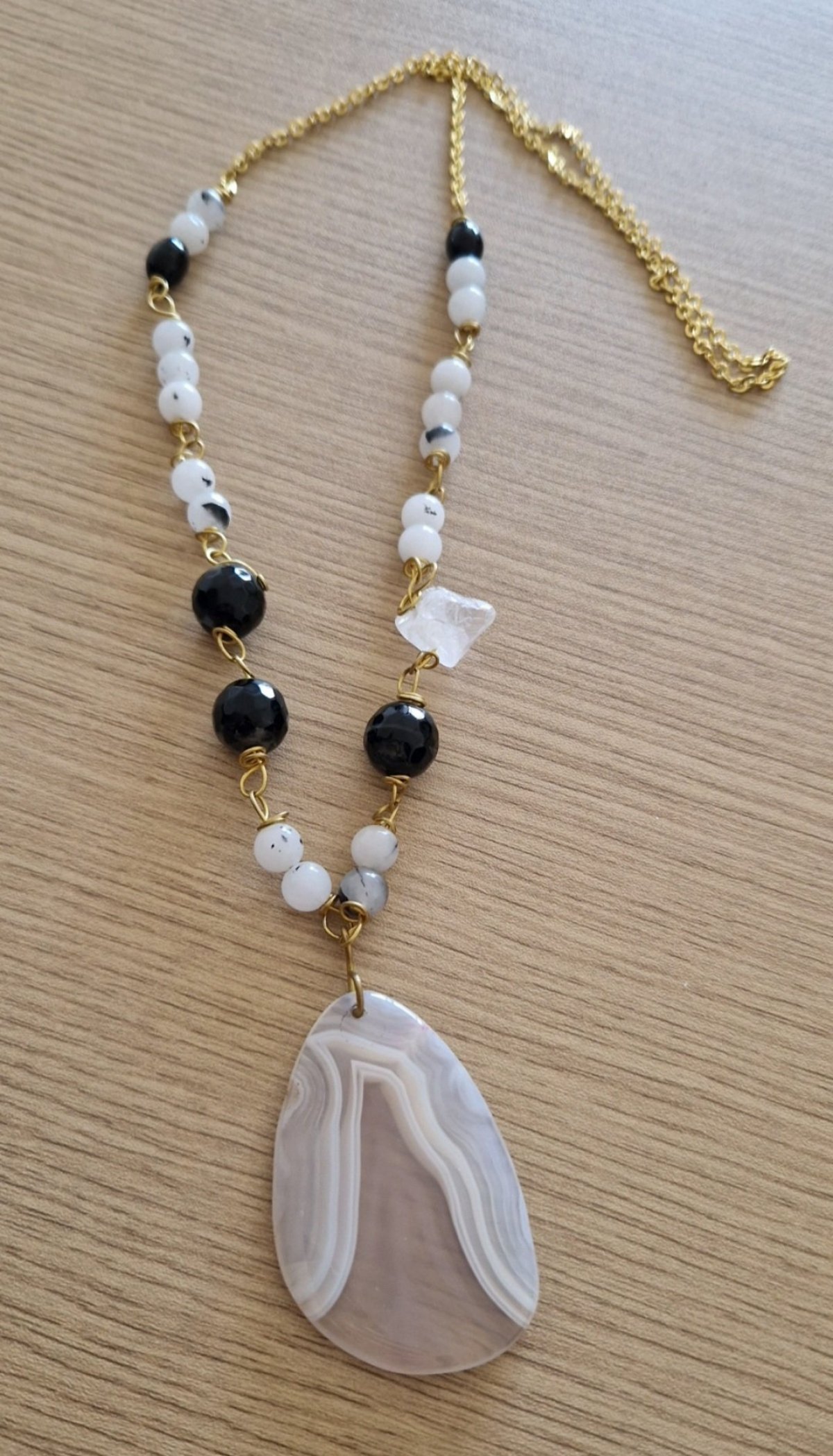 عقد هاندميد من أحجار العقيق الأسود مع عليقة من العقيق مع أحجار التورمالين الأبيض وحجرة من الكوارتز المطعمين بالنحاس 🖤🤍🖤