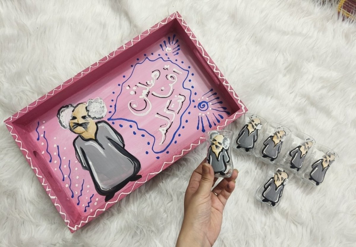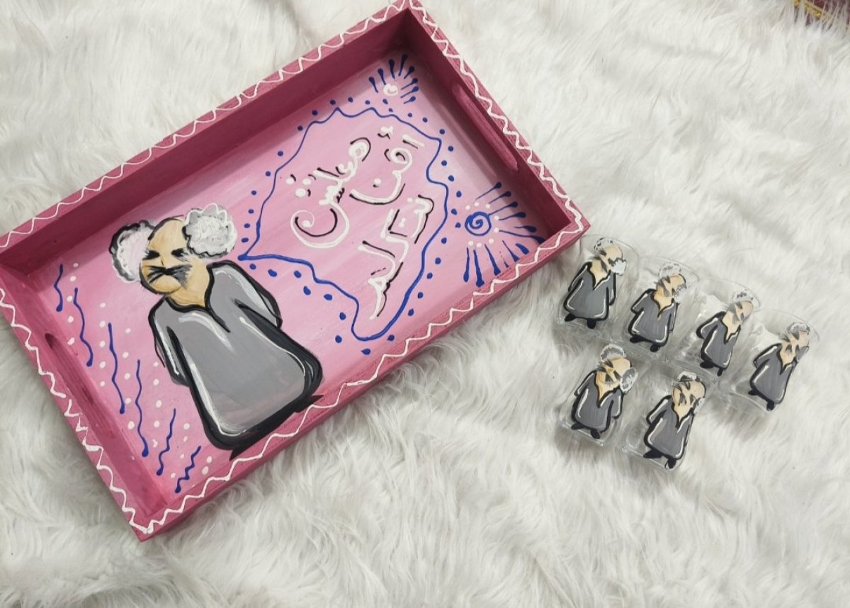 طقم إستكانة زجاجي مرسوم يدوياً 6 قطع أكواب صغيرة وصينية خشبية مرسومة يدوياً