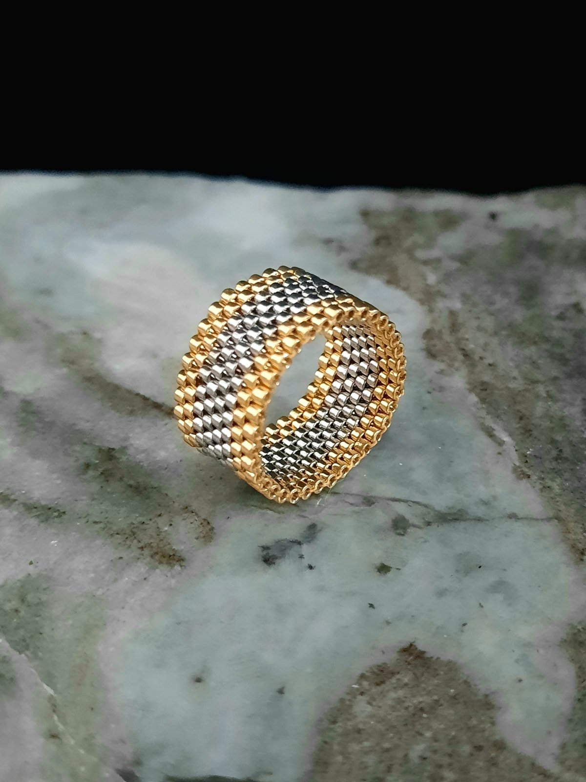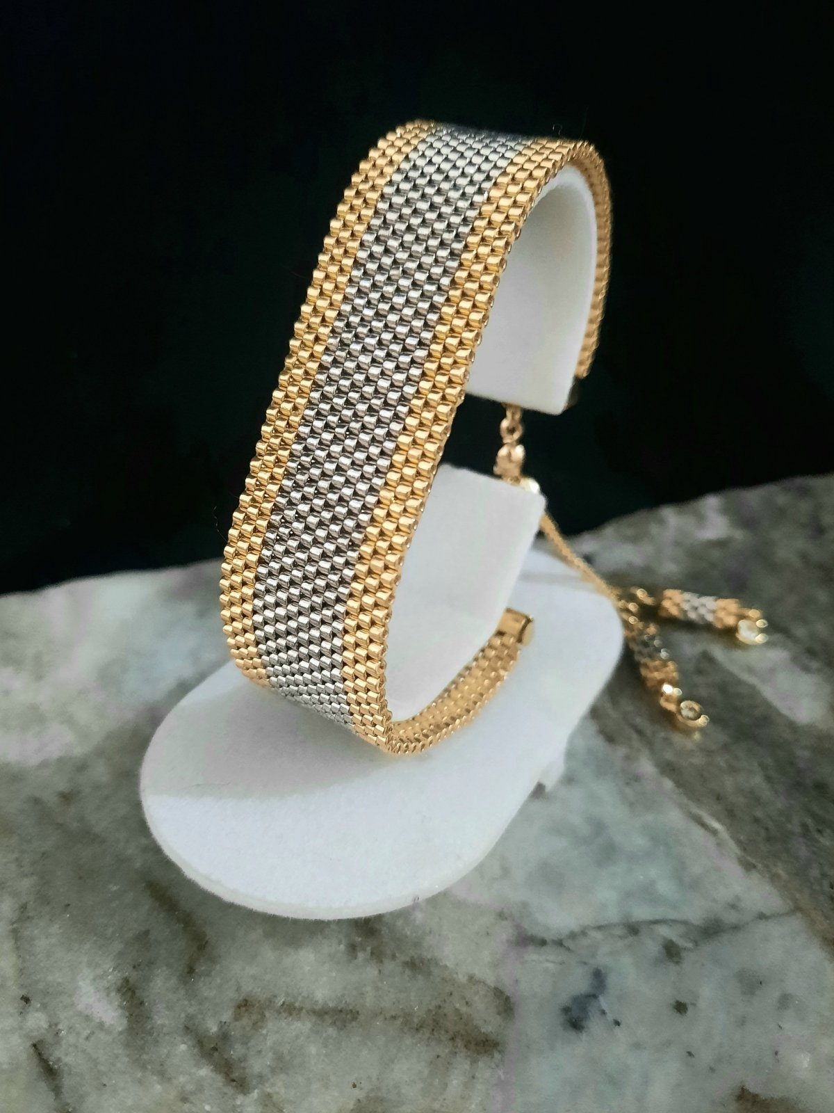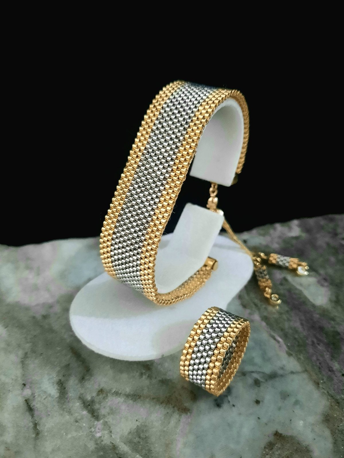 المجموعة عبارة عن إسورة وخاتم باللون الفضى والإطار الذهبى .. بتصميم رائع يشبه الذهب فى بريقه .. مزود بقفل مطاط لسهولة الأستخدام به وحدات من الأطراف من نفس تصميم الإسورة ... وايضا خاتم بنفس التصميم .. مصنوعة بالكامل من خرز الميوكى اليابانى .. جميع المواد المعدنية المستخدمة غير قابلة للصدأ او تغيير اللون .. ولا تسبب التحسس ..الوزن خفيف جداا ..