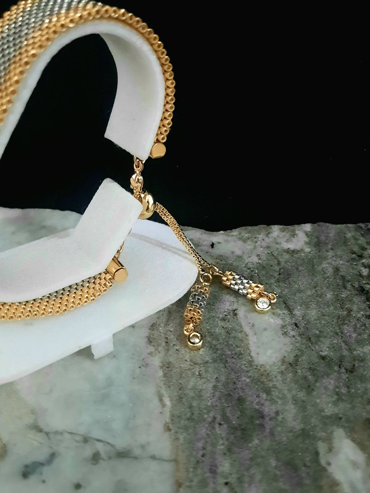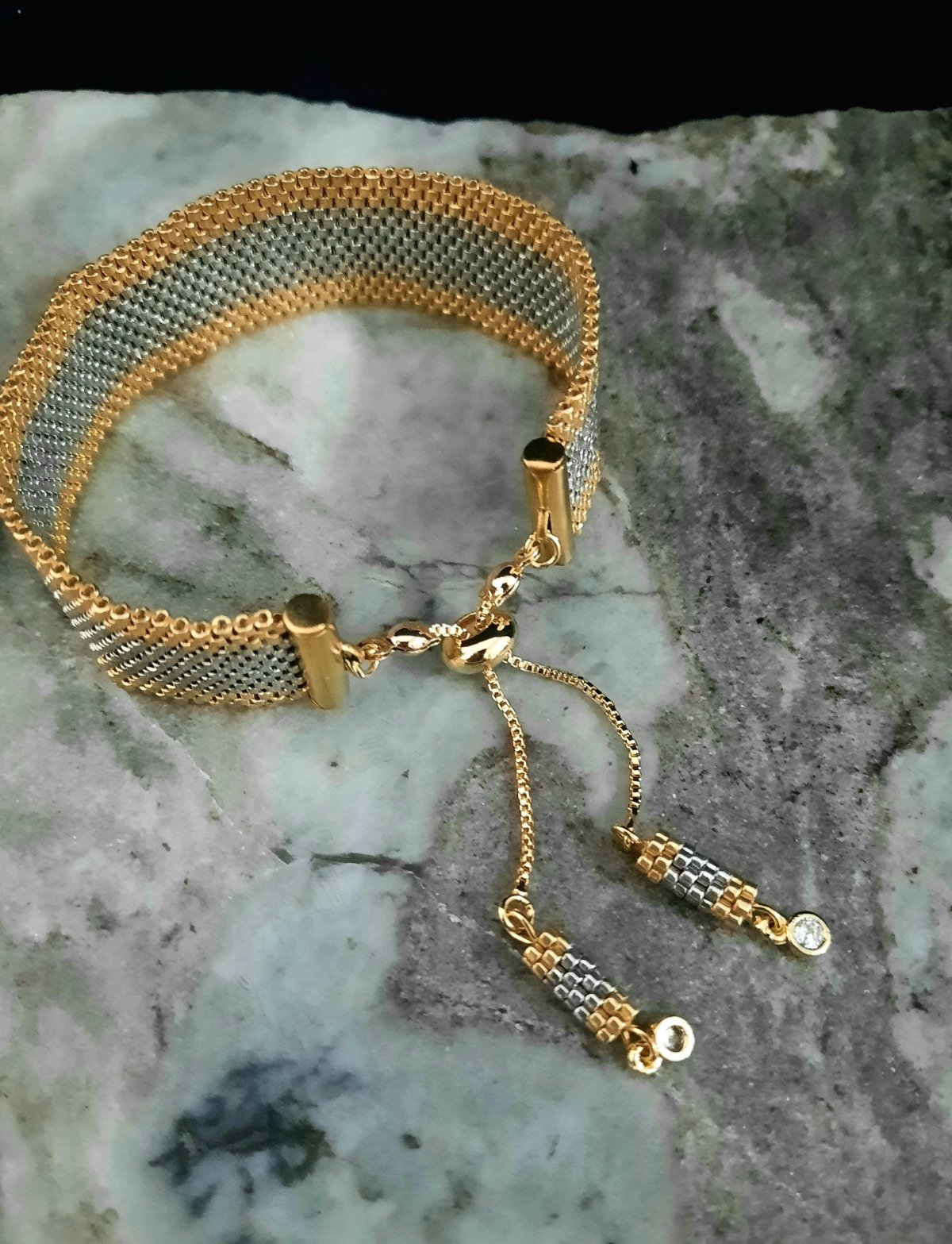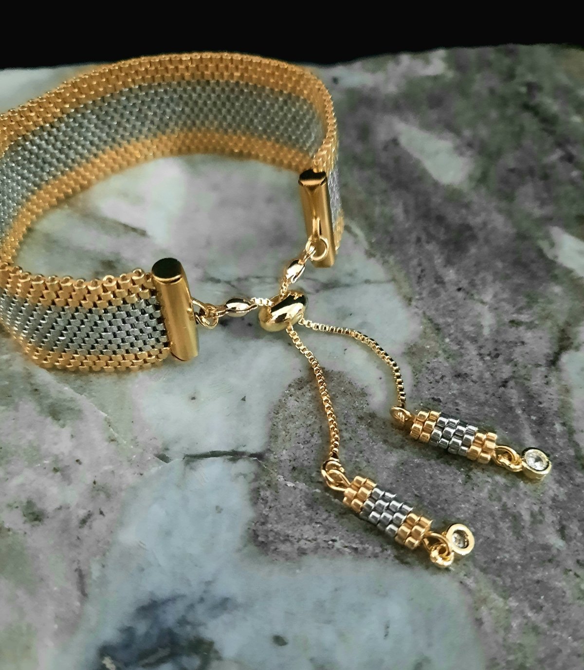 المجموعة عبارة عن إسورة وخاتم باللون الفضى والإطار الذهبى .. بتصميم رائع يشبه الذهب فى بريقه .. مزود بقفل مطاط لسهولة الأستخدام به وحدات من الأطراف من نفس تصميم الإسورة ... وايضا خاتم بنفس التصميم .. مصنوعة بالكامل من خرز الميوكى اليابانى .. جميع المواد المعدنية المستخدمة غير قابلة للصدأ او تغيير اللون .. ولا تسبب التحسس ..الوزن خفيف جداا ..