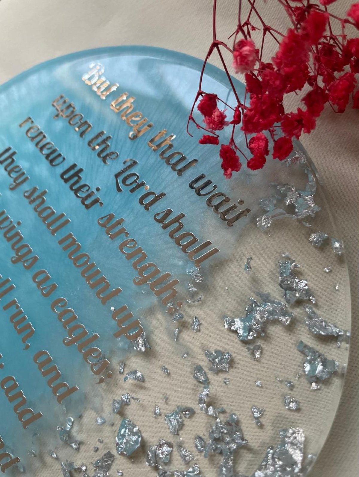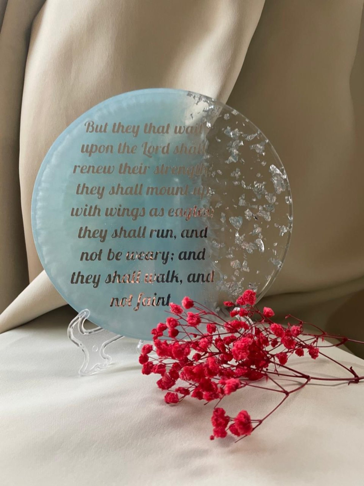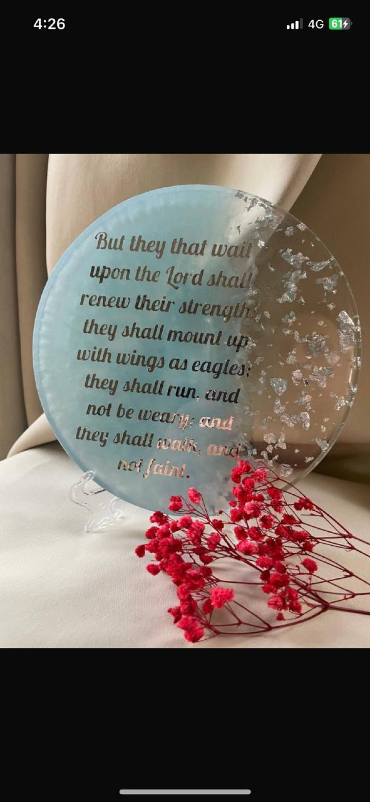 ريزن ستاند "وَأَمَّا مُنْتَظِرُو الرَّبِّ فَيُجَدِّدُونَ قُوَّةً. يَرْفَعُونَ أَجْنِحَةً كَالنُّسُورِ. يَرْكُضُونَ وَلاَ يَتْعَبُونَ. يَمْشُونَ وَلاَ يُعْيُونَ." اية من الانجيل تصميم رقيق باللون اللبنى طباعة ڤينيل سيلڤر مع ورق ذهب سيلڤر المقاس: ٢٠ سم متاح كل الالوان السعر يشمل التغليف