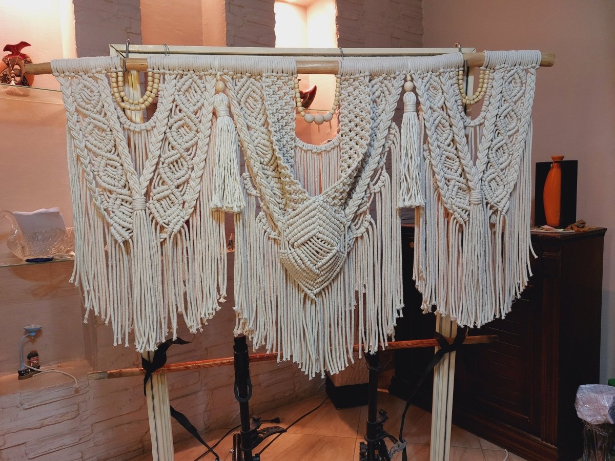 هذه الجدارية المكرمية عرضها 130 سم، وهي قطعة فنية مصنوعة يدويًا من خيوط المكرمية المعقودة. تتميز الجدارية بتصميمها المعقد الذي يتضمن مجموعة متنوعة من العقد والأنماط، مما يخلق مظهرًا فريدًا وجذابًا. يبلغ عرض الجدارية 130 سم، مما يجعلها قطعة مركزية مثالية لأي غرفة. يمكن تعليقها على الحائط بمفردها أو دمجها مع قطع فنية أخرى لخلق مظهر أكثر ديناميكية. تتميز الجدارية المكرمية بالمتانة وطول العمر، حيث تم تصنيعها بعناية من خيوط عالية الجودة. يمكن تنظيفها بسهولة باستخدام قطعة قماش جافة. تضيف الجدارية المكرمية لمسة من الأناقة البوهيمية إلى أي مكان توضع فيه. إنها مثالية لأولئك الذين يقدرون الأعمال الفنية المصنوعة يدويًا والتصميمات الفريدة.