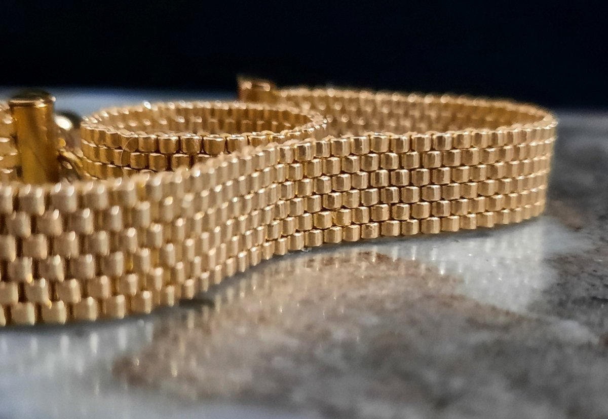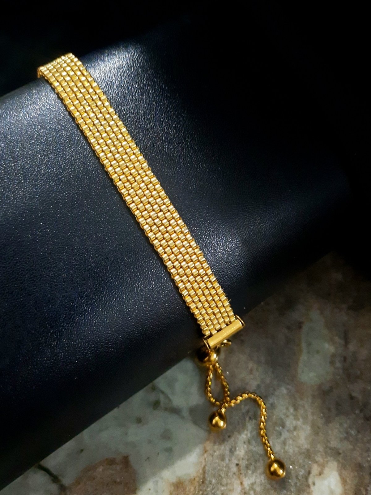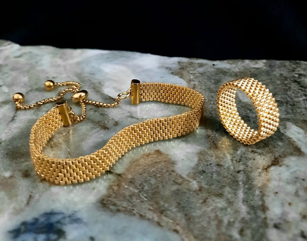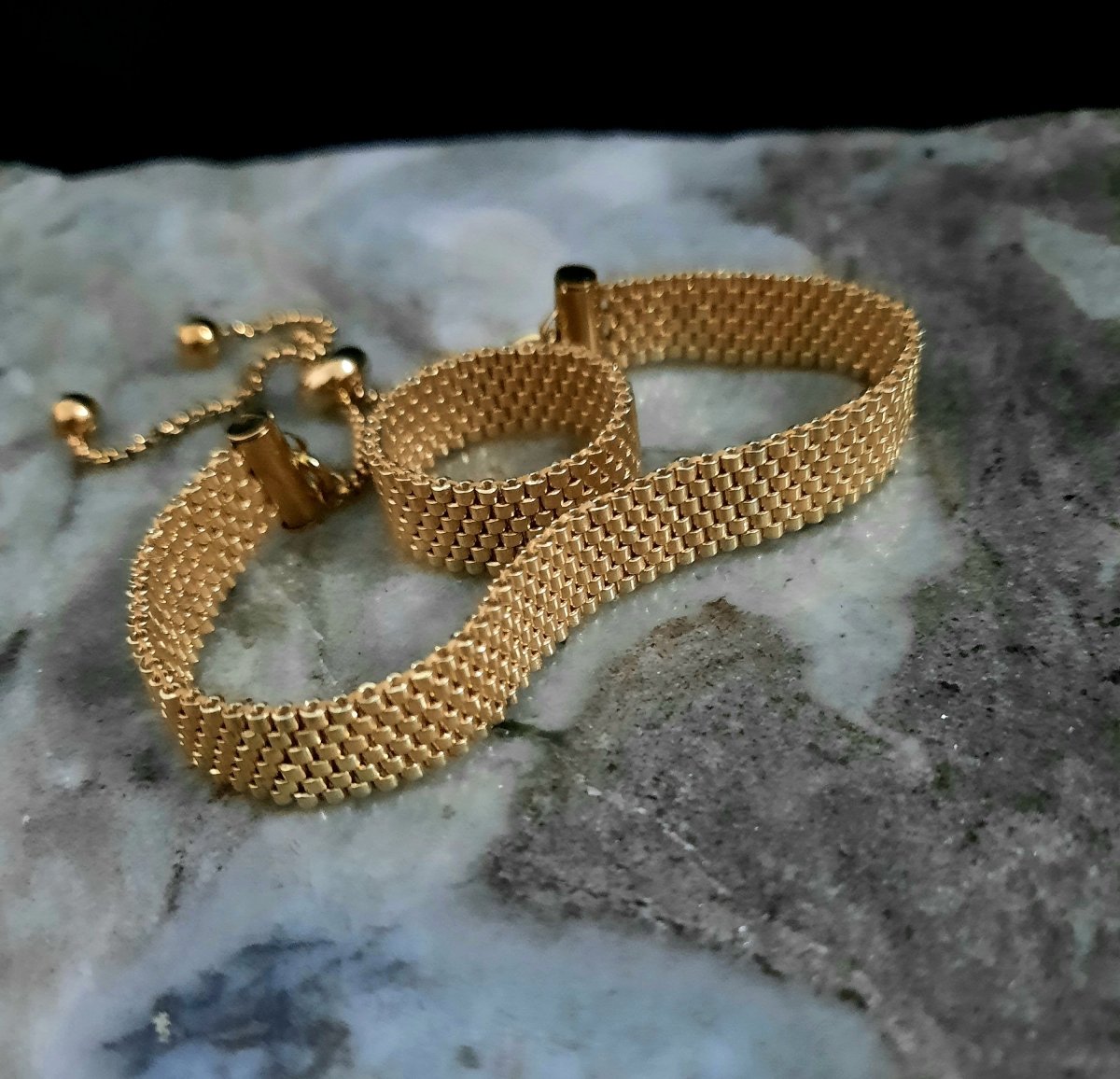 المجموعة عبارة عن إسورة بتصميم بسيط لخرز الميوكى بدرجة لون الذهبى المماثلة للذهب عيار 18 تضيف لمسة ناعمة وجذابة جدا .. مع إضافة القفل المطاط فى نهاية الأسورة تمكنك من استخدامها فى اى وقت وكل وقت .. وايضا خاتم بنفس التصميم .. مصنوع بالكامل من خرز الميوكى .. جميع المواد المعدنية المستخدمة غير قابلة للصدأ او تغيير اللون ولا تسبب التحسس .. وزنها خفيف جداا
