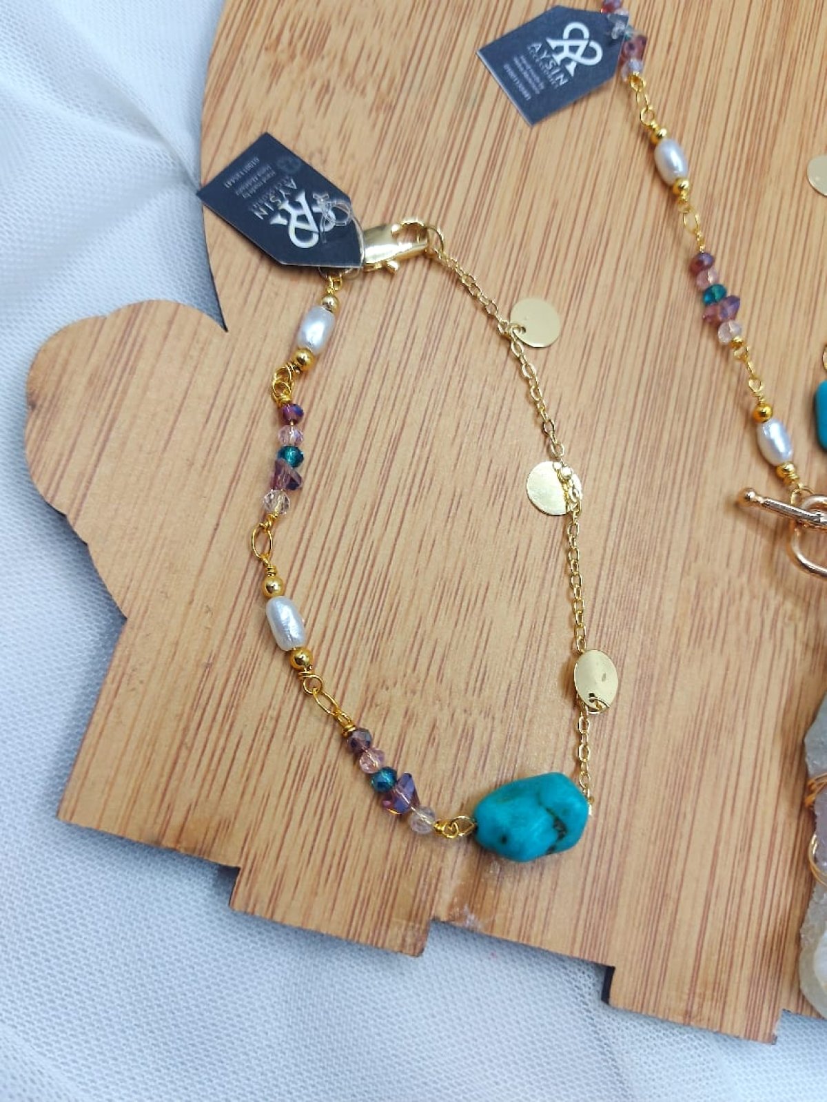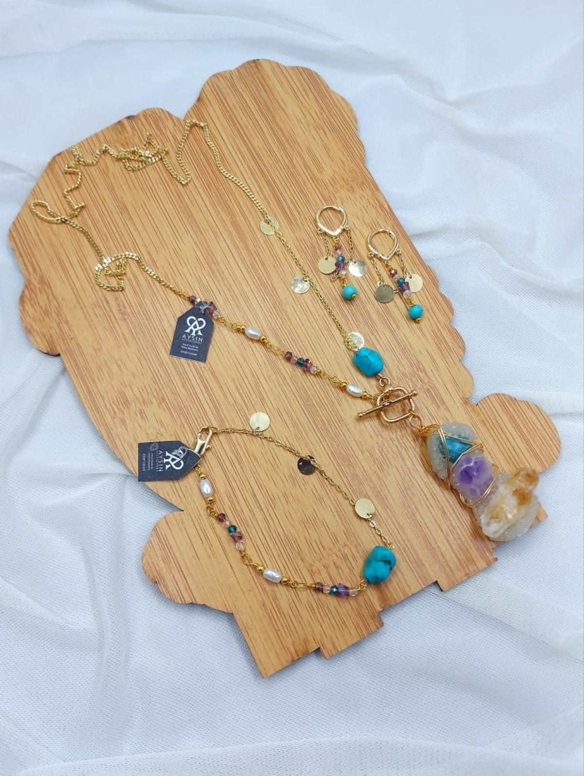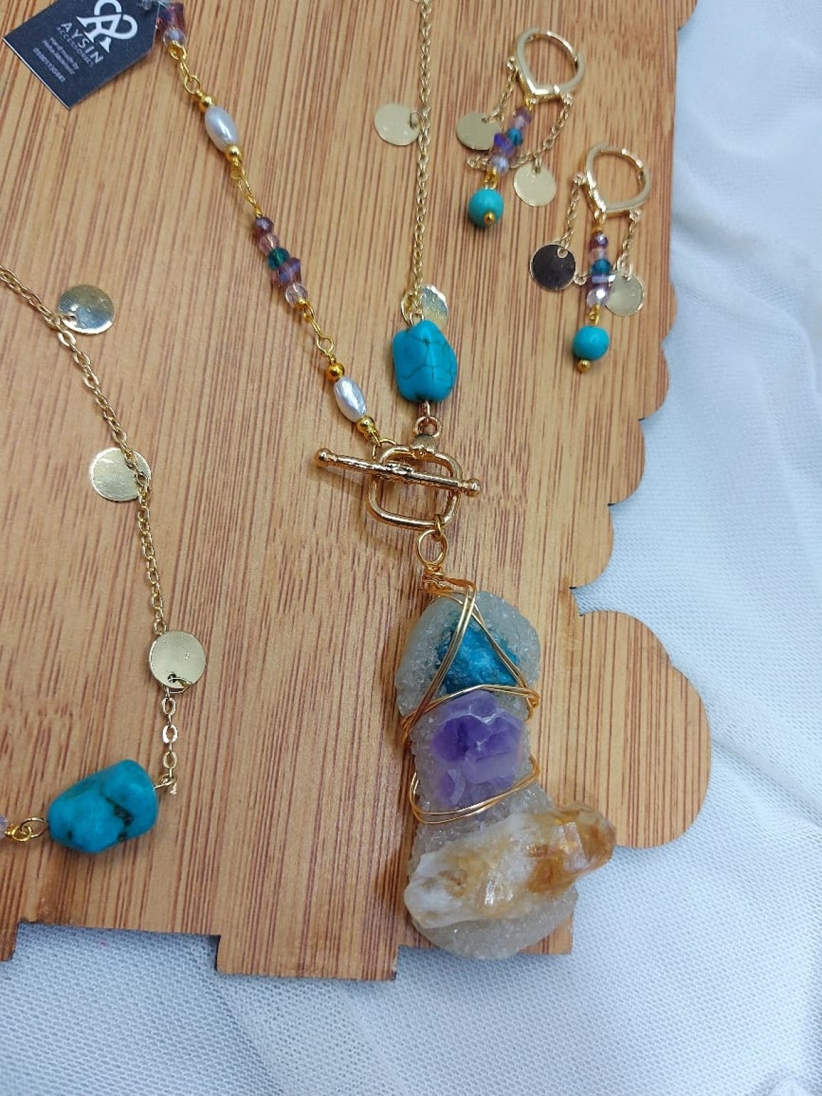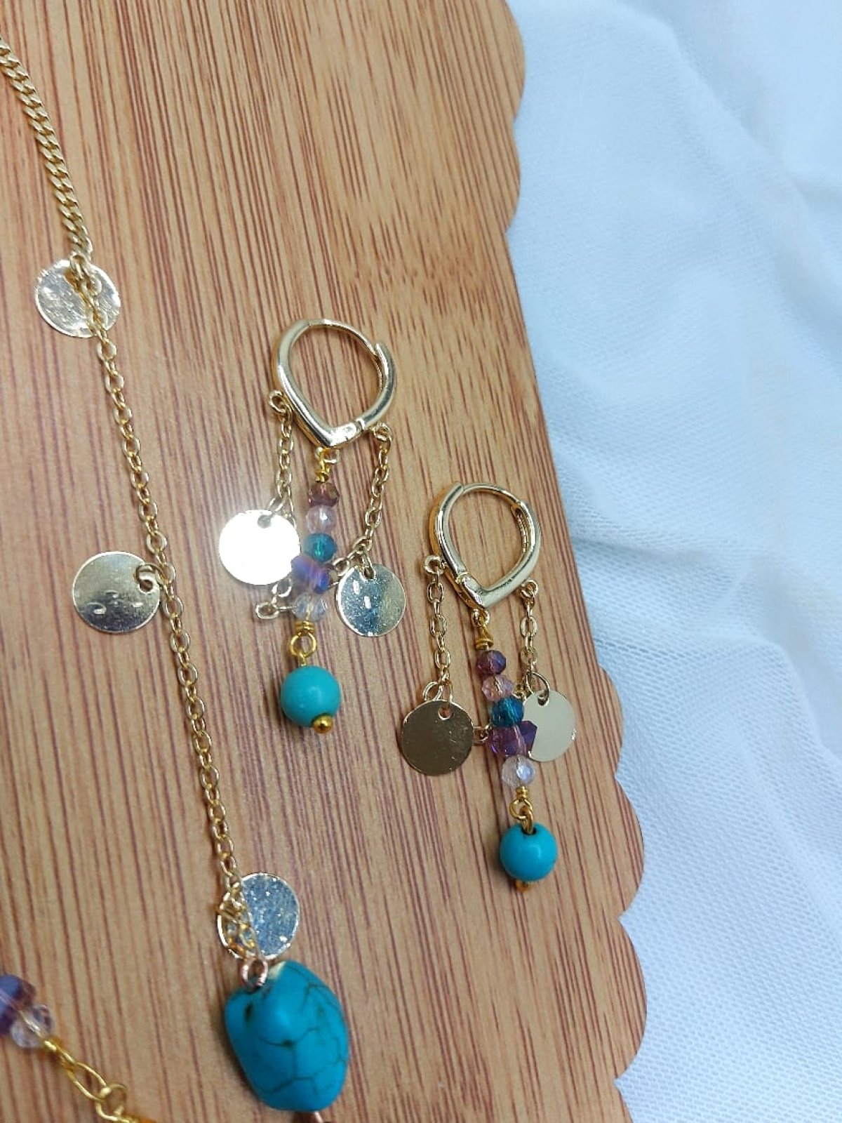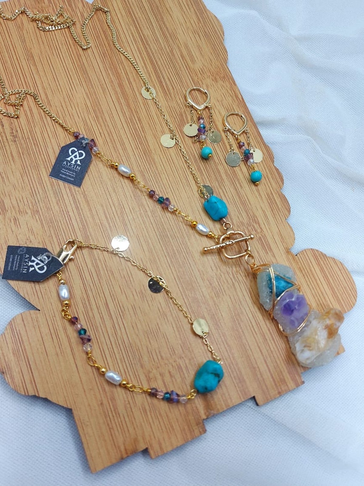 طقم سلسله وانسيال وحلق من احجار الكوارترز والفيروز والسلسله من الدهب الصينى الجولد عاليه الجوده طولها ٧٠ سم غير قابله للصدأ