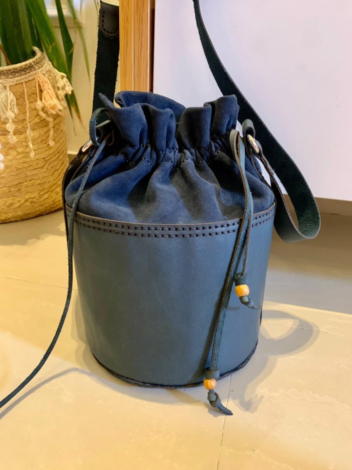 شنطه اسطوانه كحلي جلد بقري × جلد شمواه قطرها ١٧سم متاح عمل اي لون