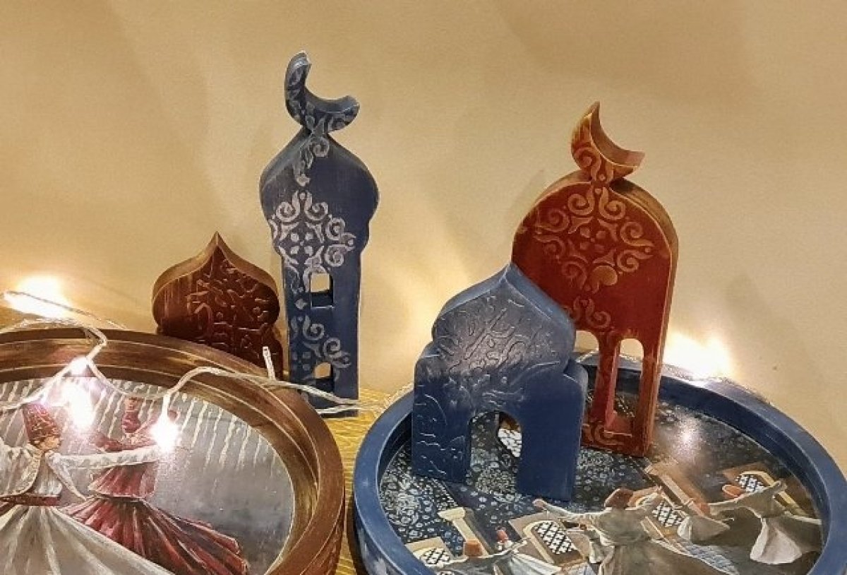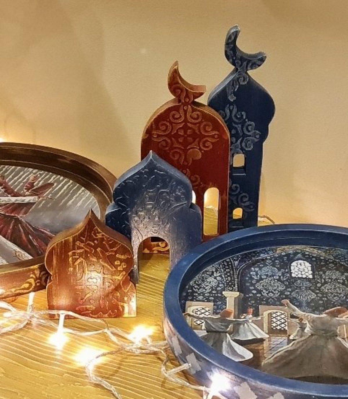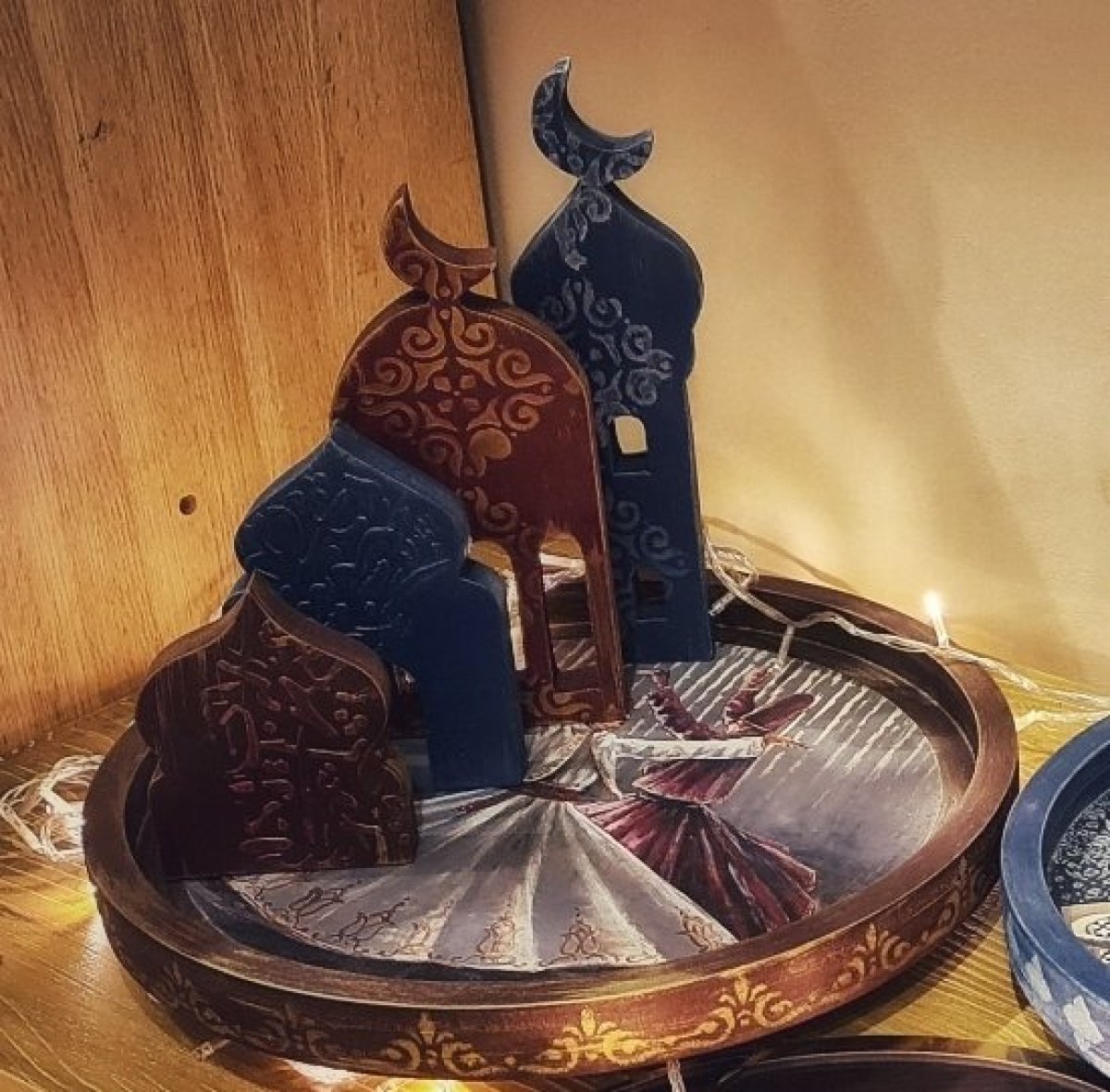 طقم مآذن رمضانية مكون من ٤ قطع باللون الكحلي والنبيتي خشبmdf مقاسات ١١×٩سم و ٢٢×١٠سم و١٥×١٠سم و٢٦×٥سم لهواة التميز متاح قطعه واحده غير مكررة