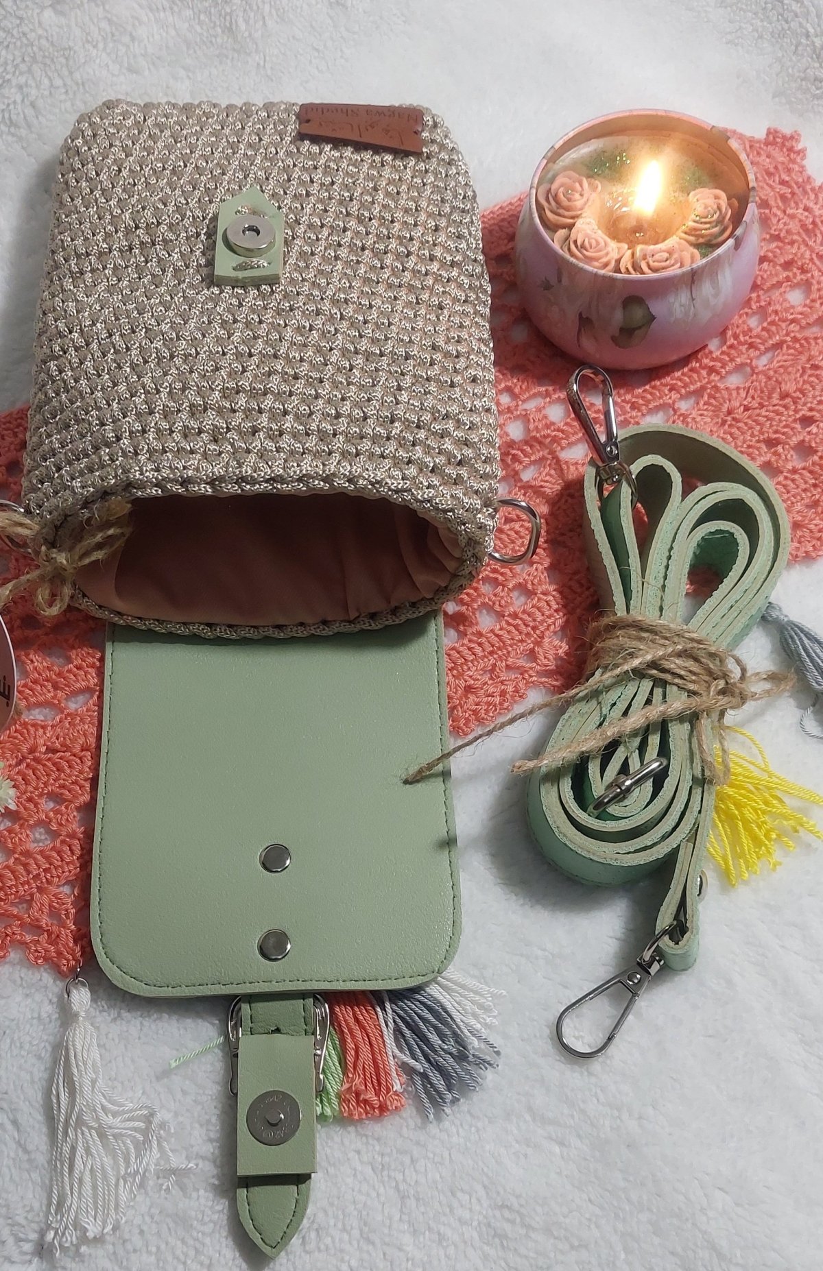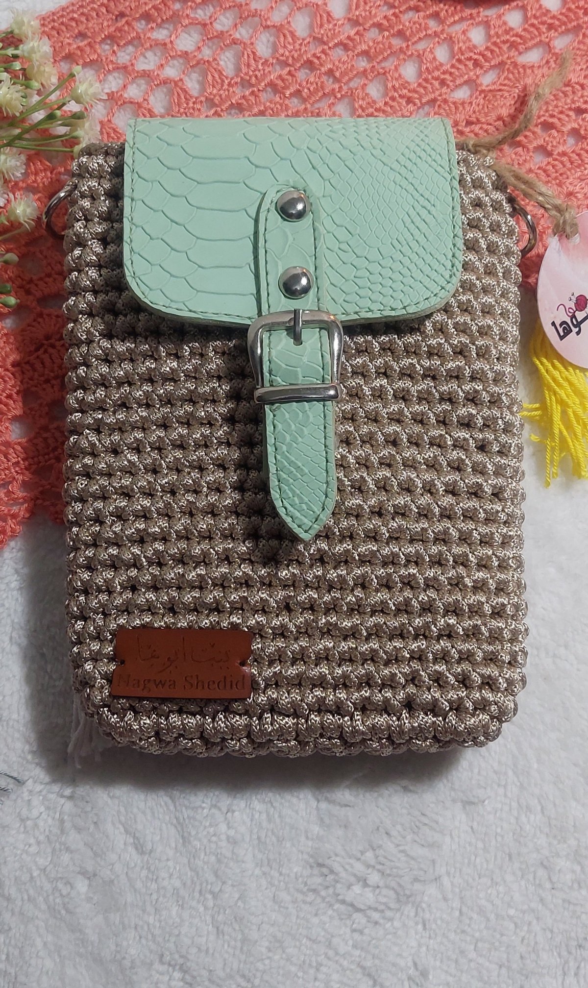 مينى كروس كروشيه مصنوعة من خيط السلسلة مع جلد ليزر وايد جلد بتطول وتقصر ومبطنة من الداخل مقاس: عرض: ١٢ سم طول ١٨ سم