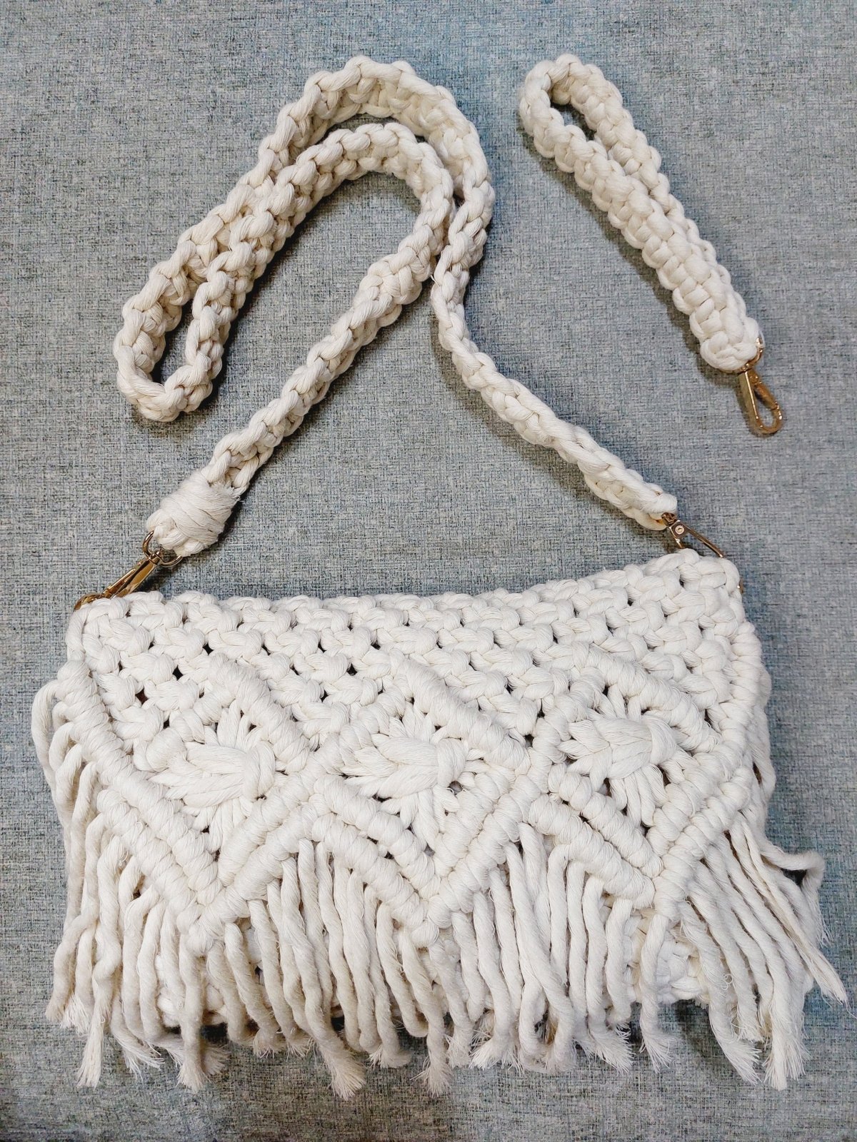 "شنطة مكرميه اوف وايت، مصممة على شكل مستطيل، مع حواف دائرية ناعمة. الحزام الطويل مصنوع من نفس خيوط المكرميه، ويمكن تعديله ليناسب جميع المقاسات. تتميز الشنطة بنمط هندسي بسيط على الجهة الأمامية، يضفي عليها لمسة عصرية. مصنوعة يدويًا من خيوط قطنية عالية الجودة، مما يجعلها متينة وخفيفة الوزن. مثالية للاستخدام اليومي أو للخروجات المسائية