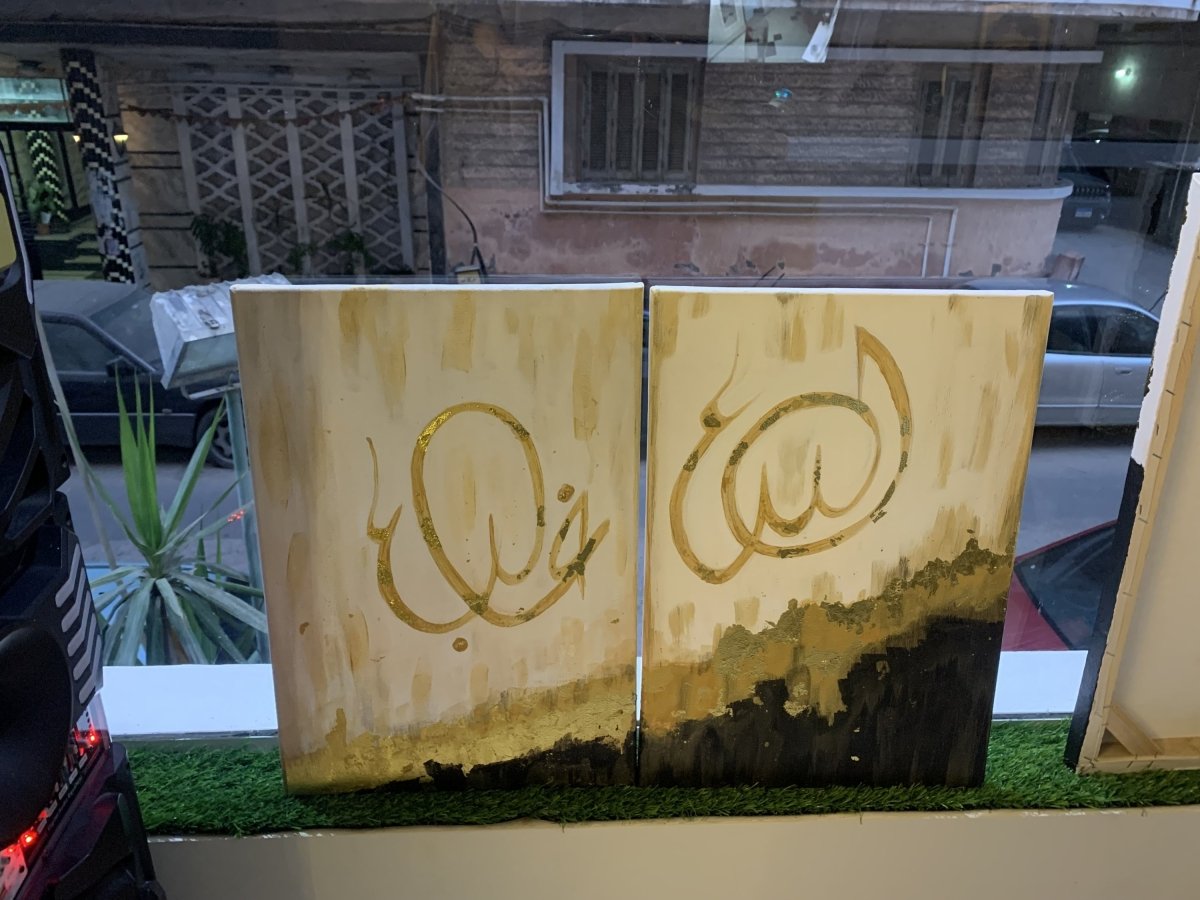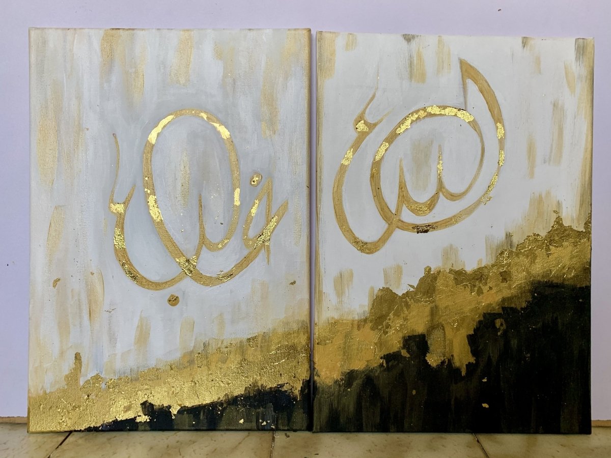لوحة قطعتين مقاس اجمالي ٥٠*٧٠ سم مقاس القطعة الواحدة ٥٠*٣٥ سم مكملين بعض طول او عرض اسود و ابيض و دهبي