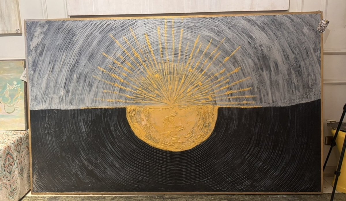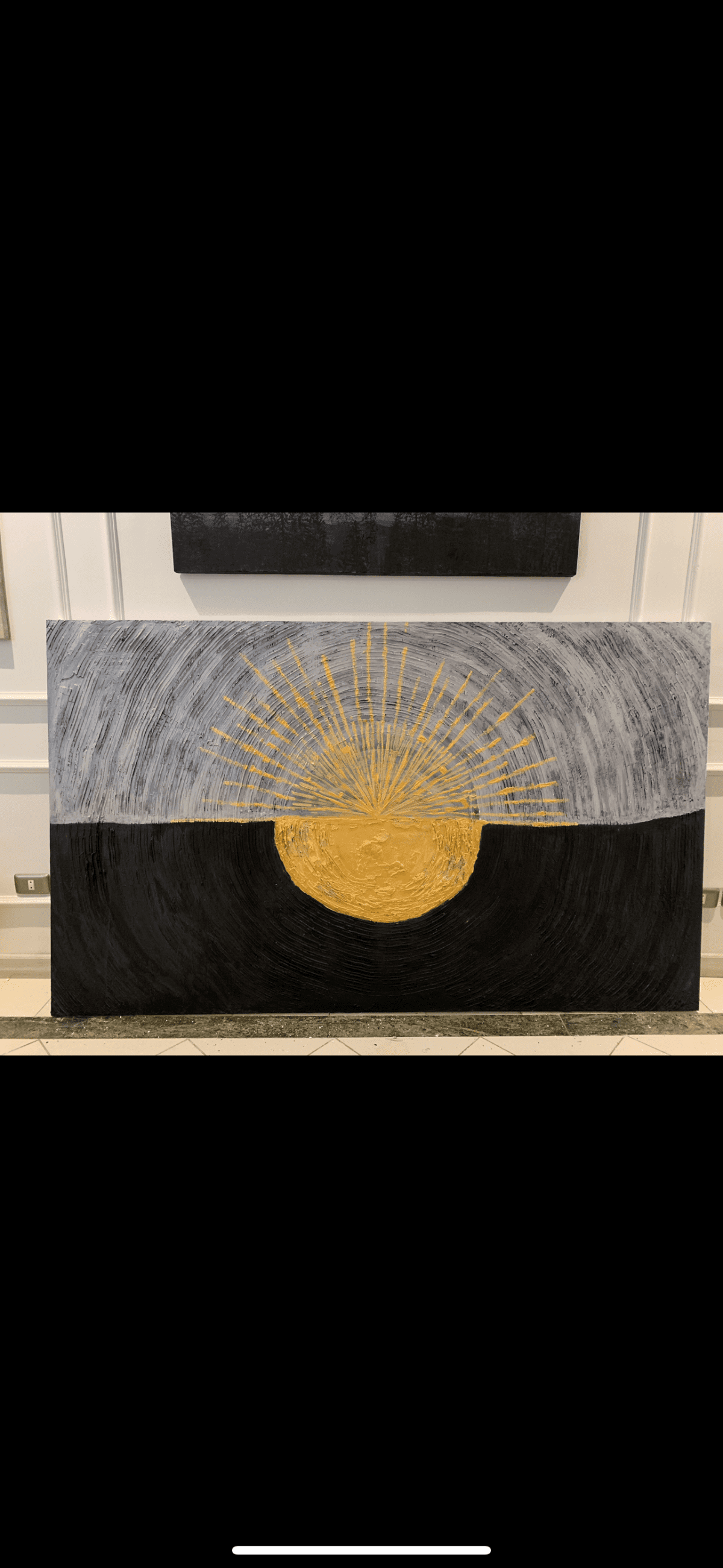 لوحة معجون بارزة اسود و دهبي و رصاصي مرسومة علي كانفاس و فيها فريم دهبي اضافي خشب سويد مقاسها كبير ١٢٠*٢٠٠ سم تنفع تتركب بالطول او بالعرض مناسبة للمساحات الفاضية الكبير