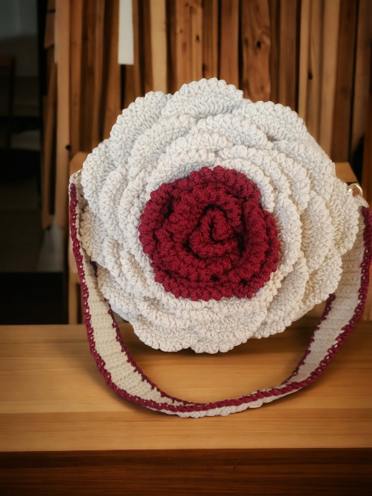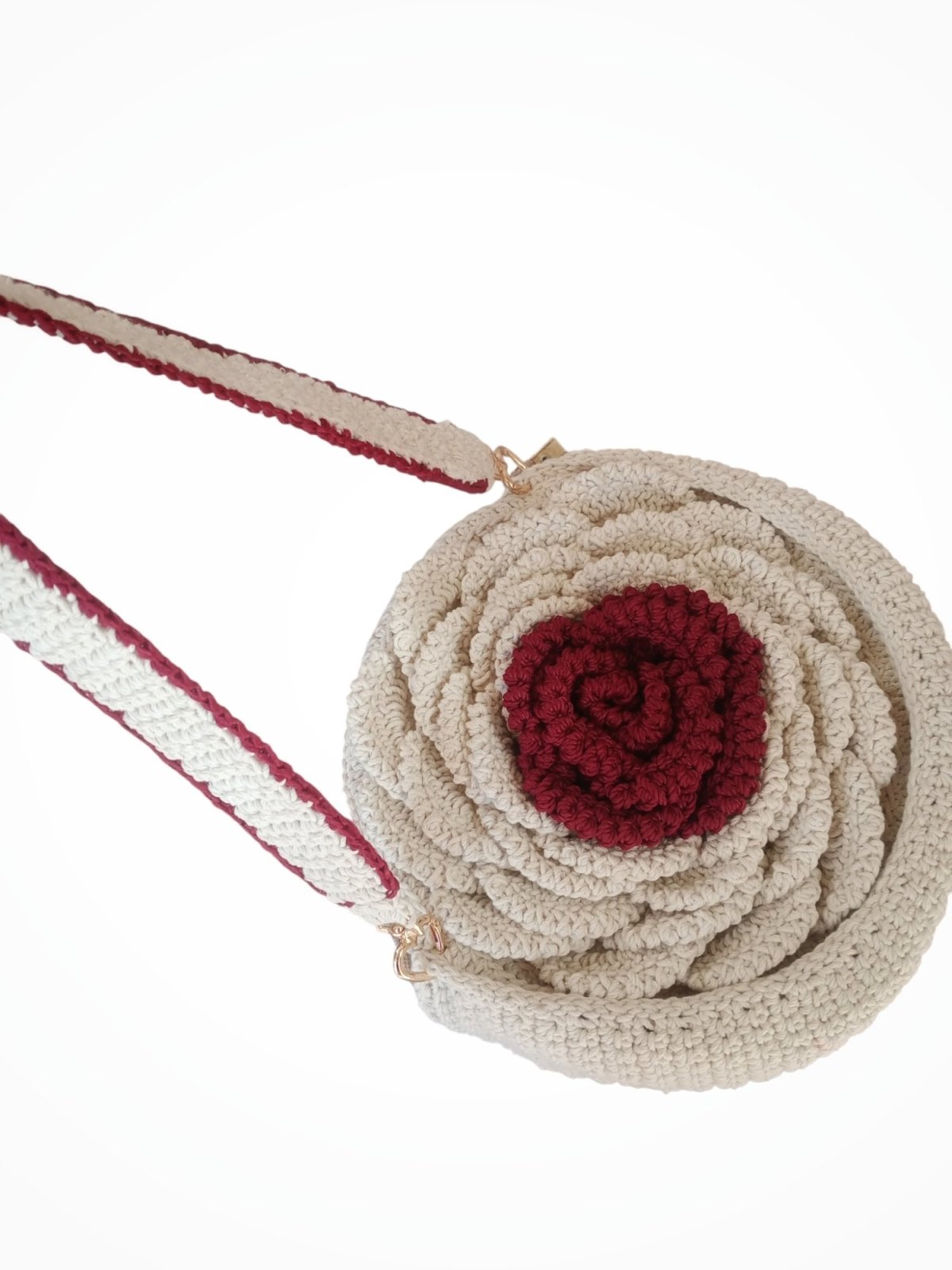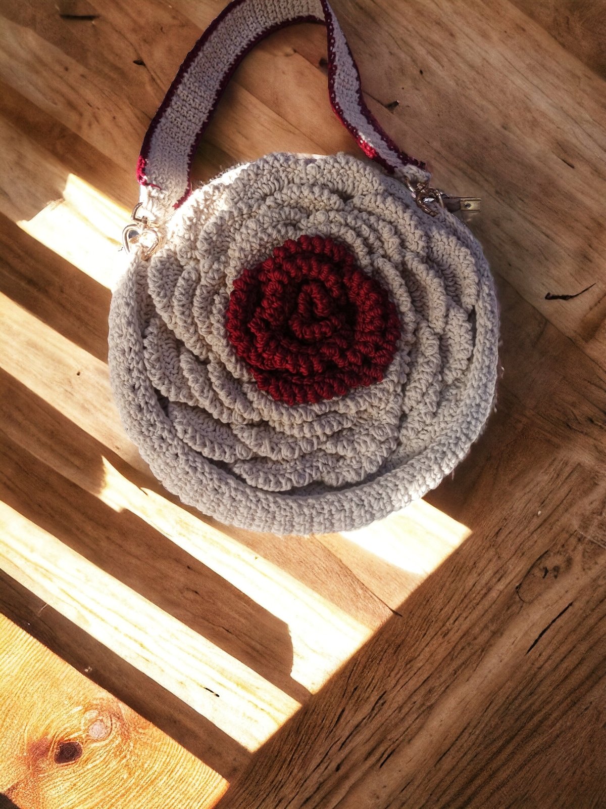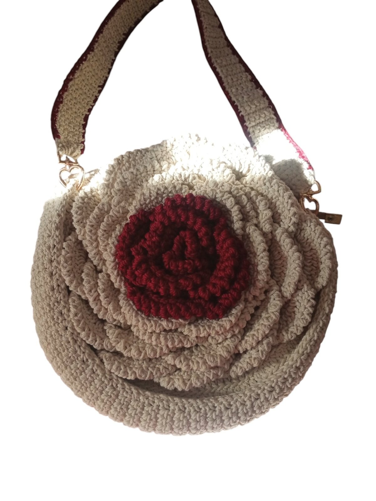 حقيبه من الكروشيه صنعت يدويا من خيوط القطن علي شكل ورده مبطنه من الداخل بقماش الكتان ولها جيب داخلي ومذوده بدراع شولدير مقاس ٣٥